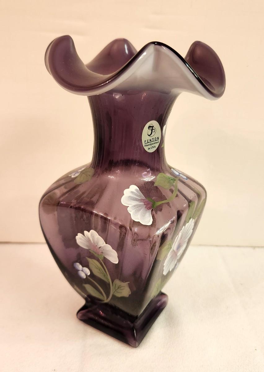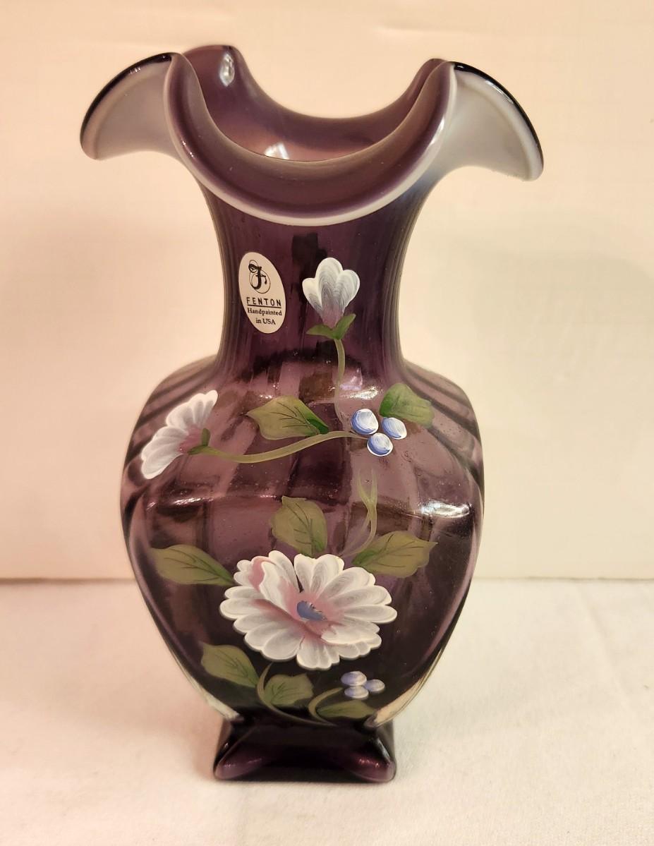 What a beauty! Fenton Art Glass Vase - 7.5" tall - has label, violet with hand painted flowers.