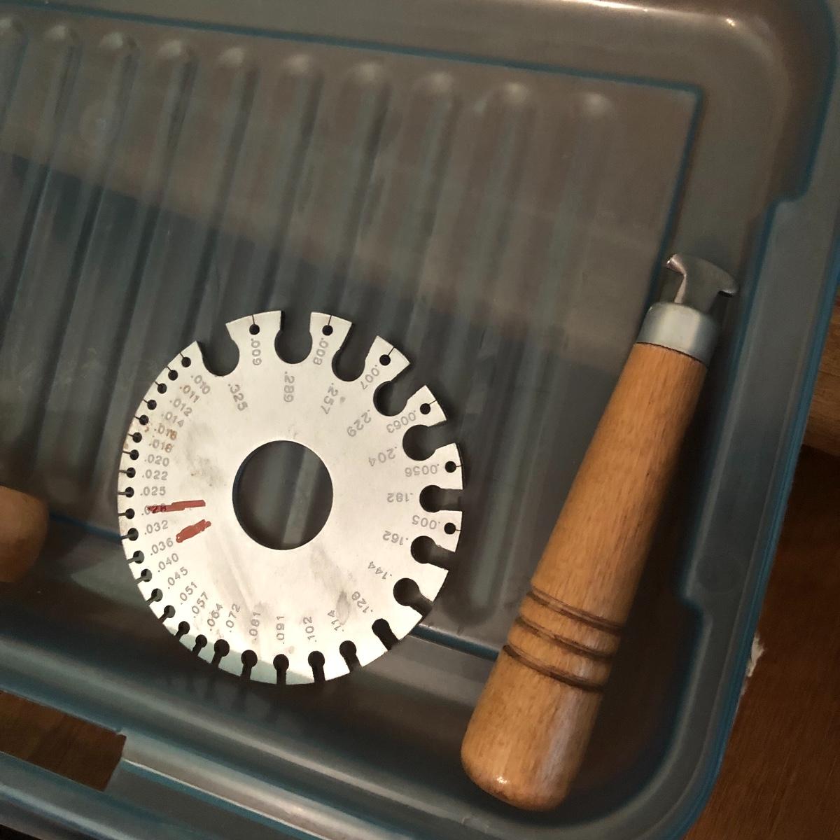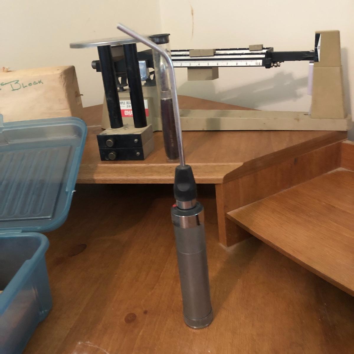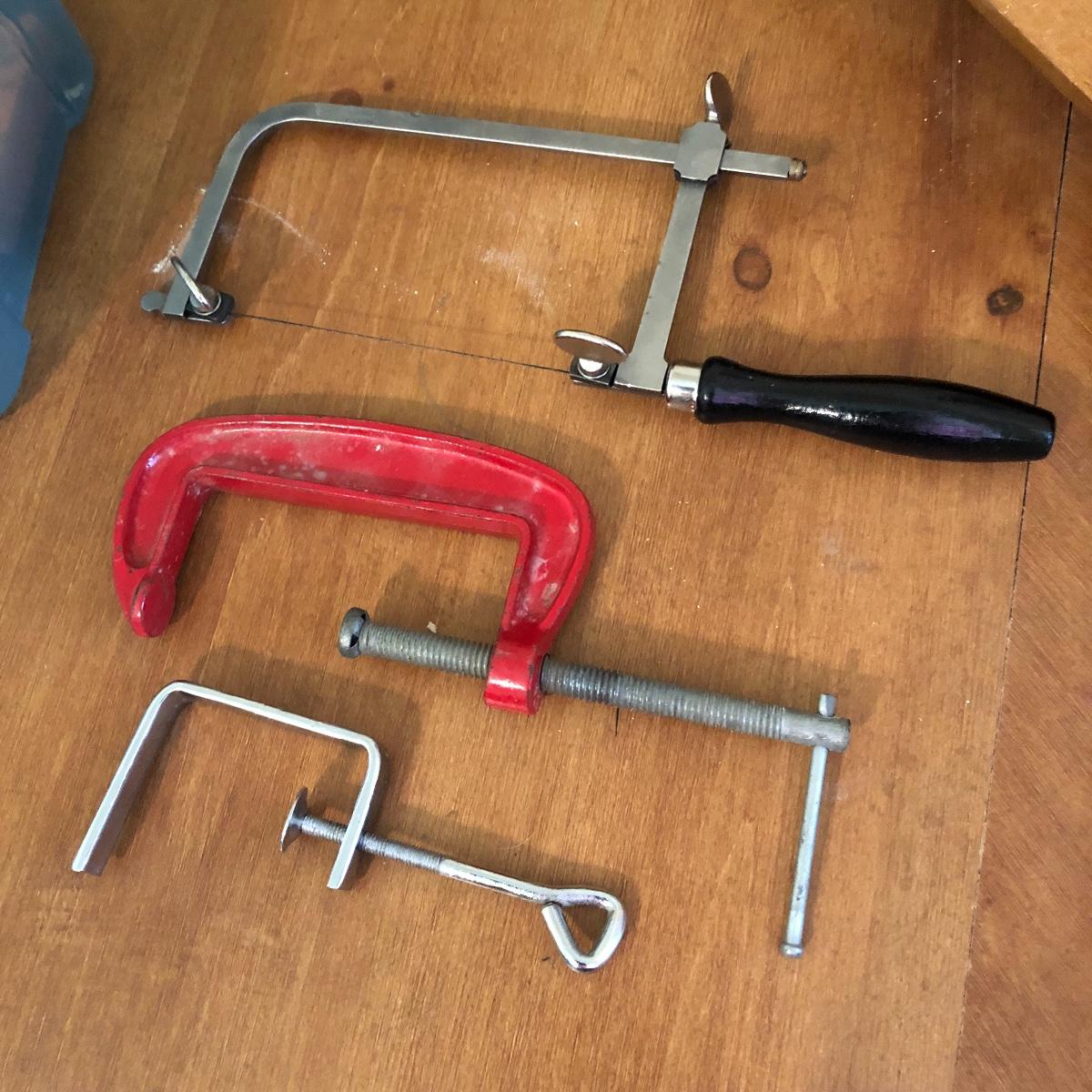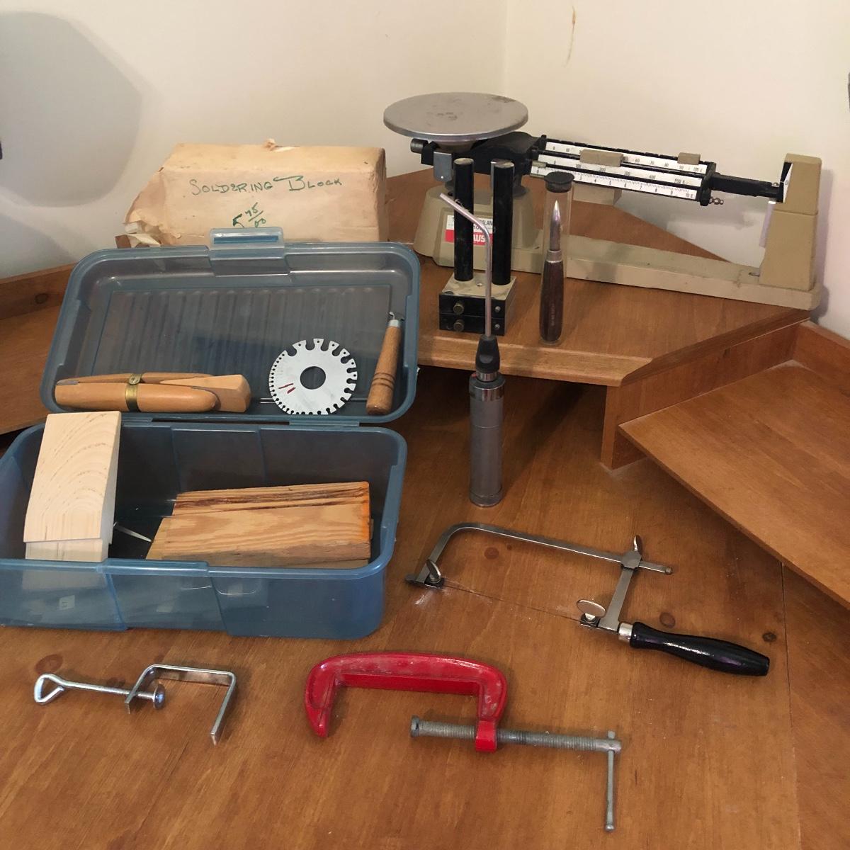 This lot includes smithing tools, a jeweler’s saw, saw blades, a burnisher, a OHAUS triple beam balance scale and more. The plastic container pictured is included with the lot.