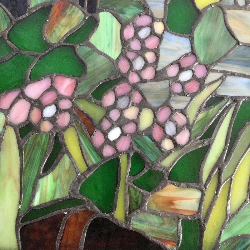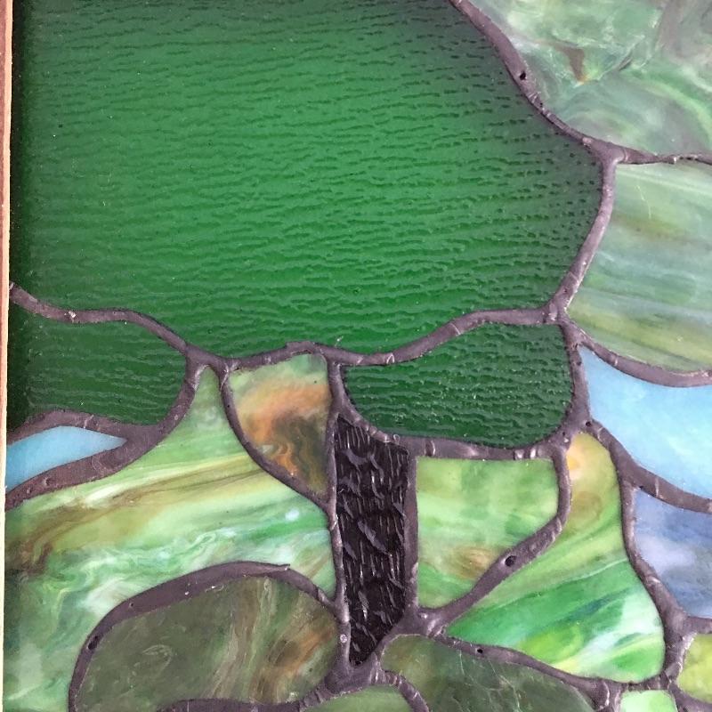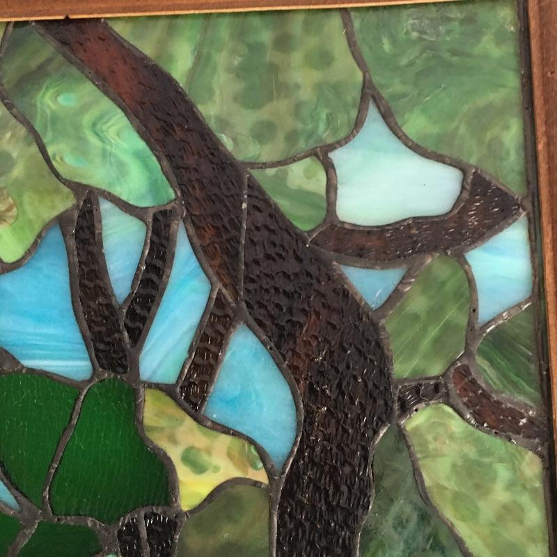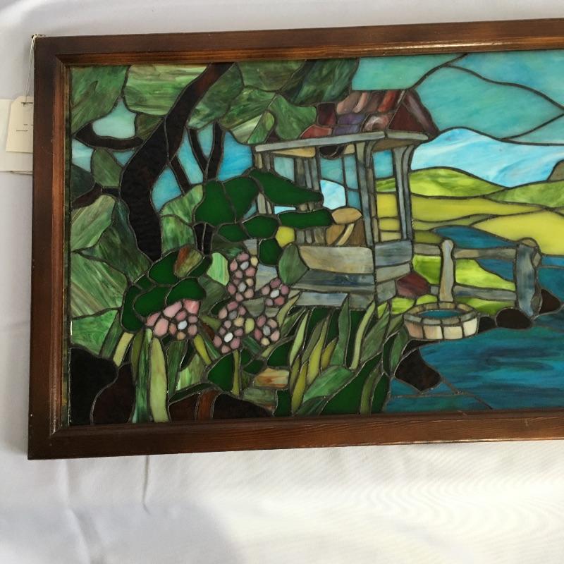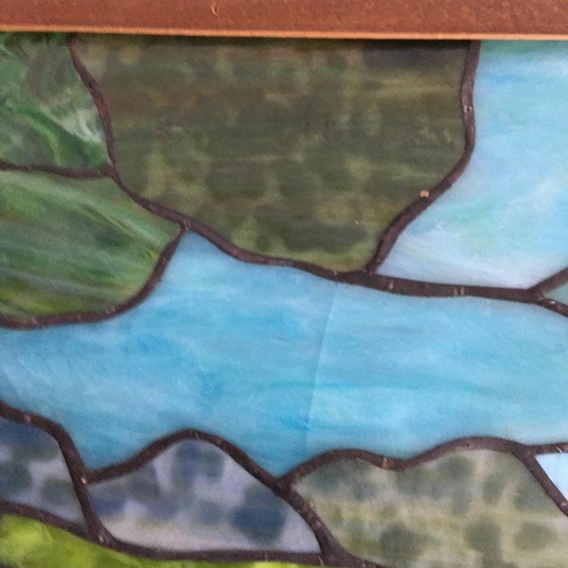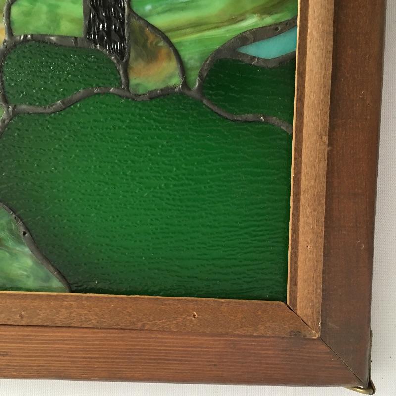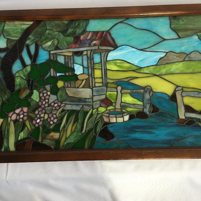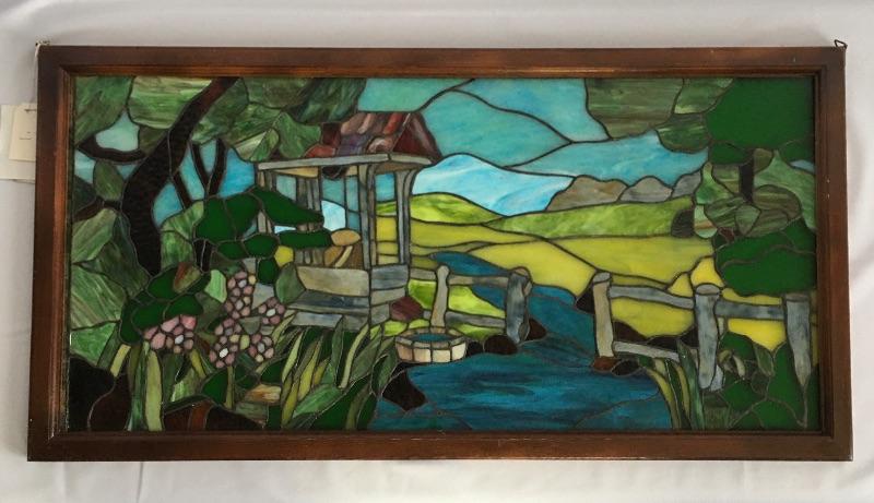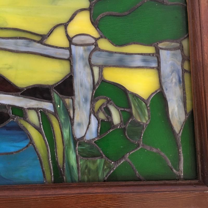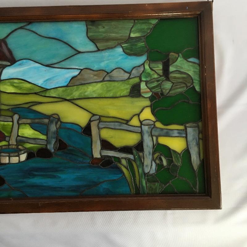Mountain landscape in framed stained and leaded glass. Glass has one crack, see pictures. Frame measures 19.25” x 37.5”.