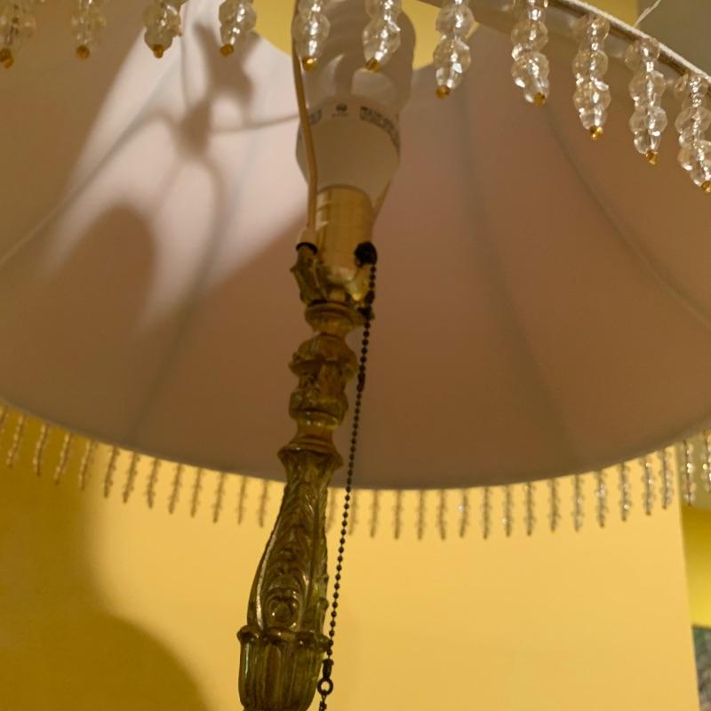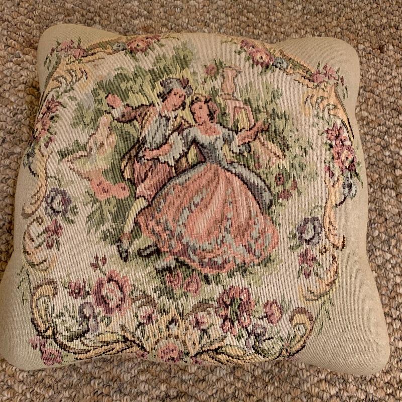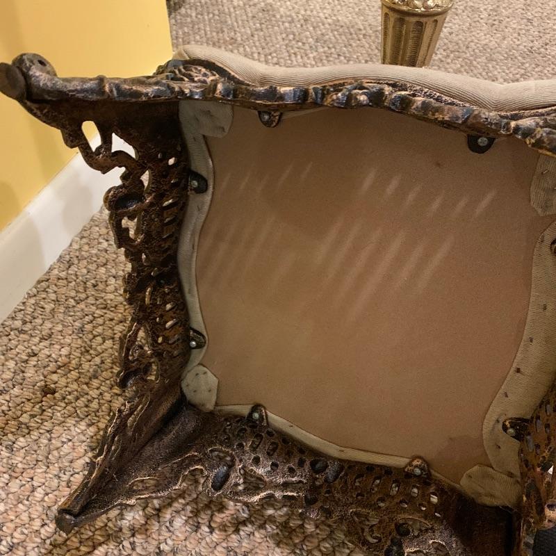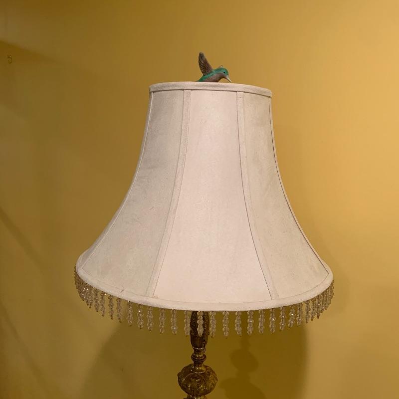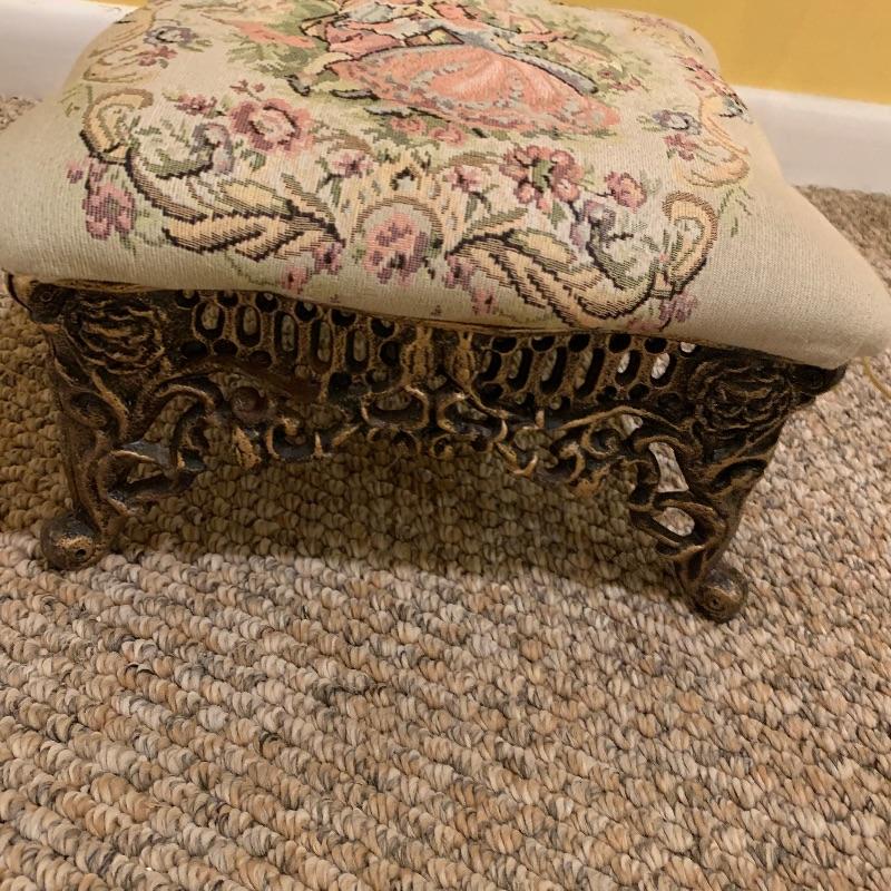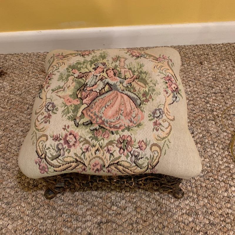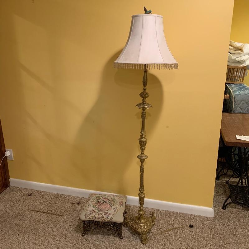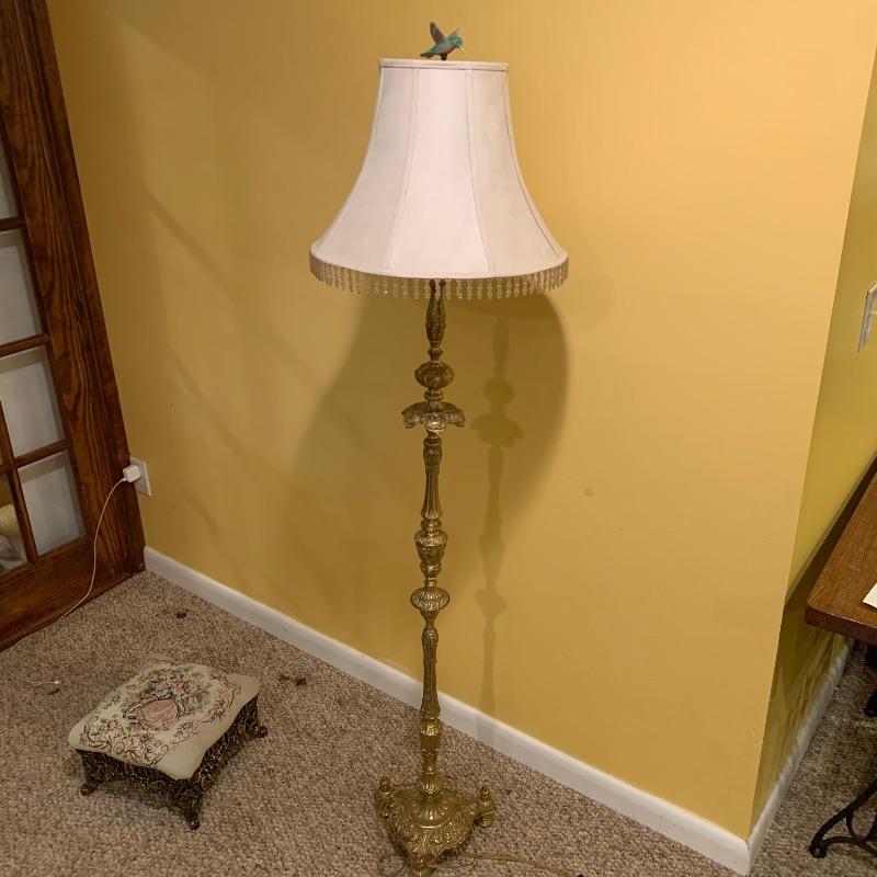 This lot contains two very heavy metal pieces but both are quite elegant to look at. The floor lamp has a pull chain switch and is a bright gold color metal stand with beaded tassel lamp shade and humming bird final. The lamp stands approximately 67” tall. The footstool in the lot has a Victorian scene tapestry covered cushion and the base is a heavy metal. This piece measures 14” x14” x7”. Local pick up only.