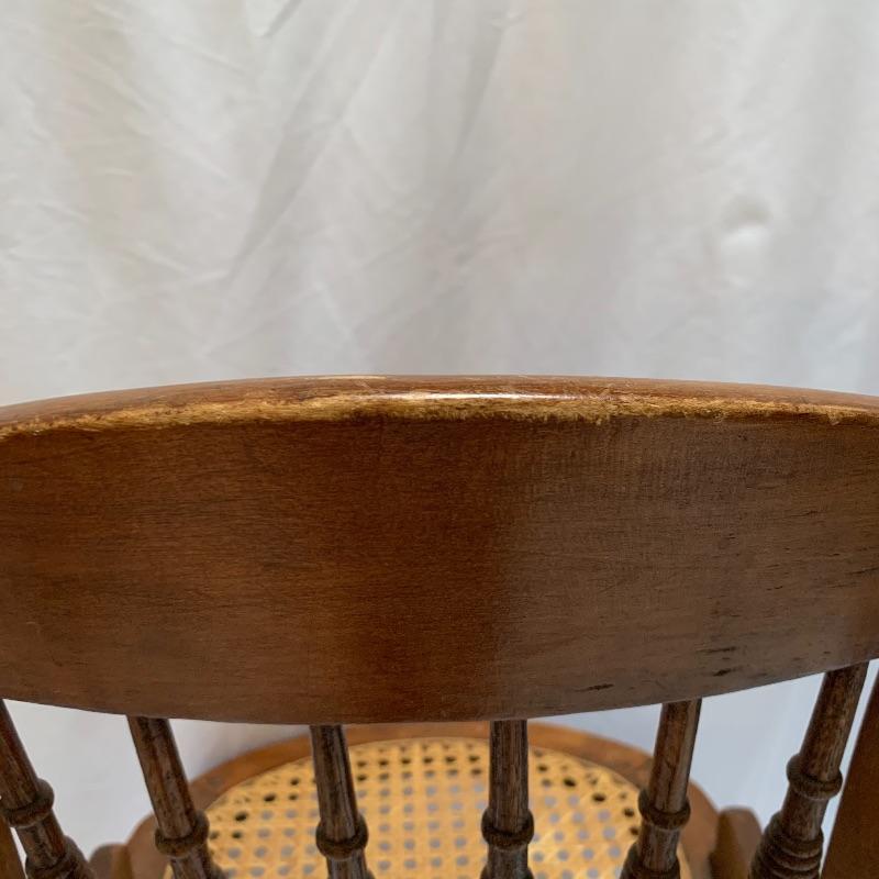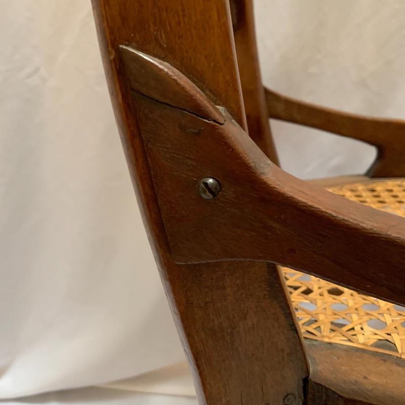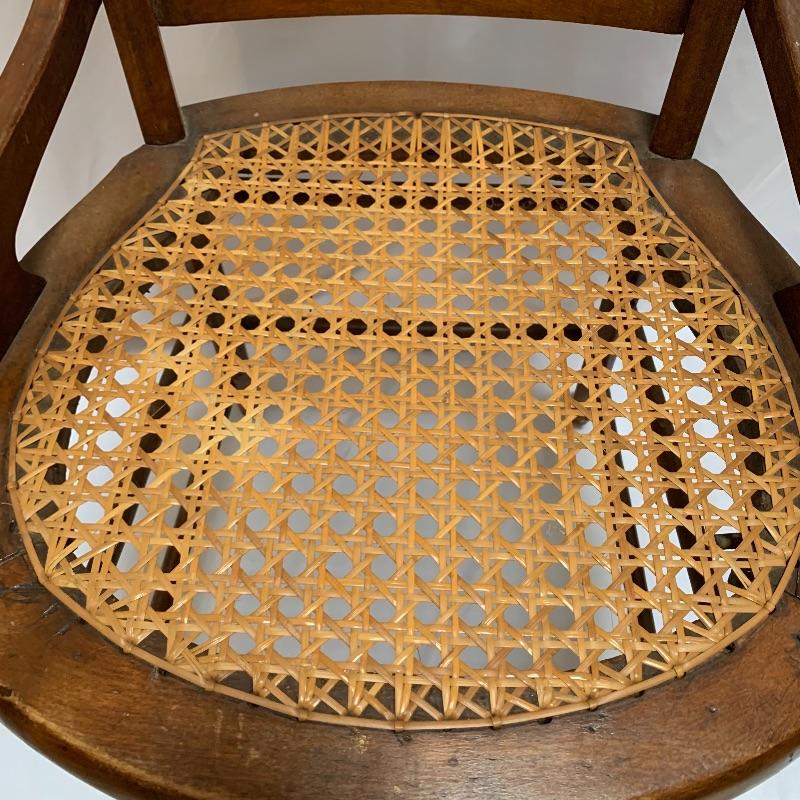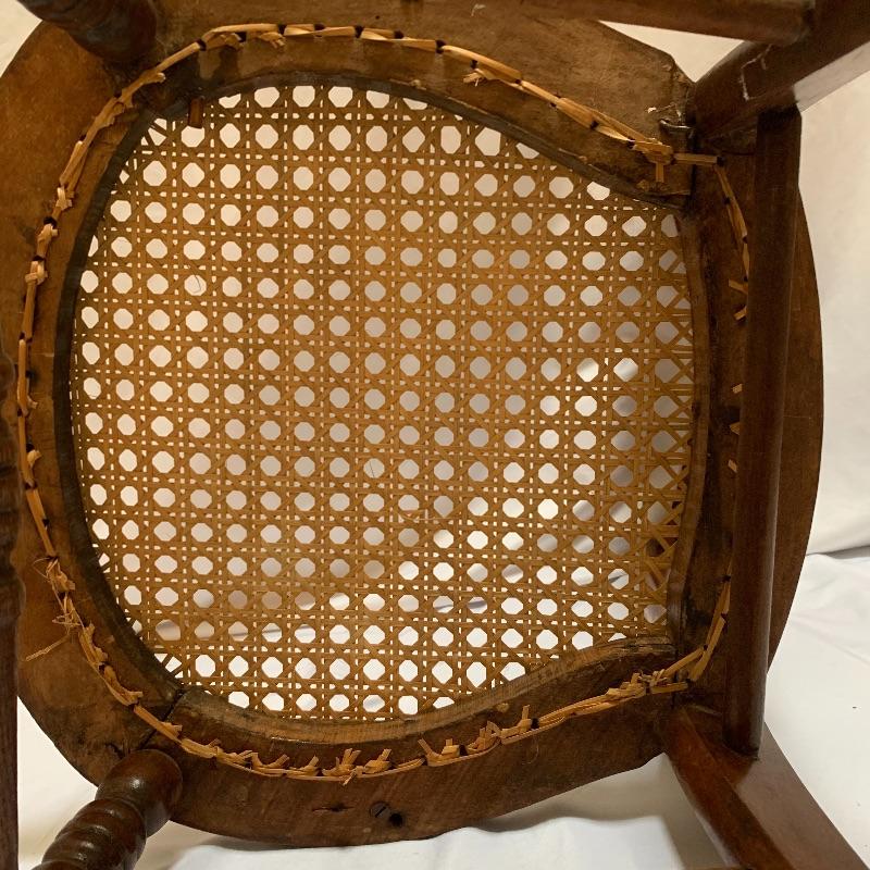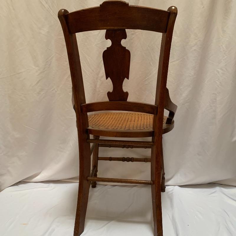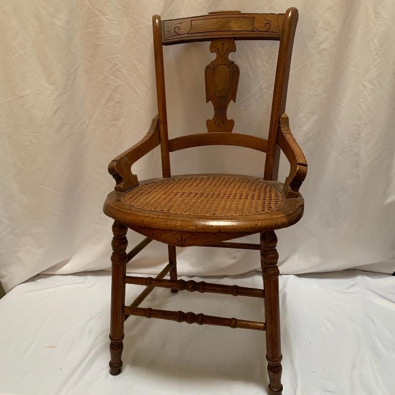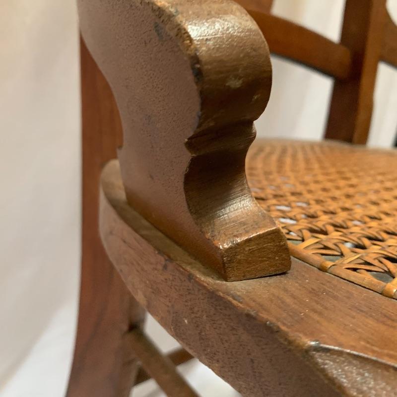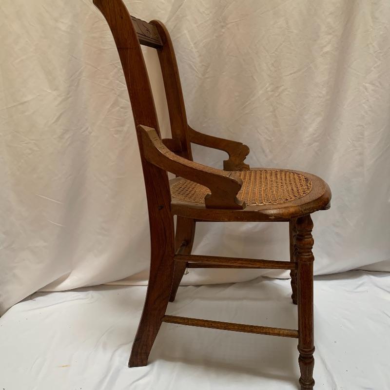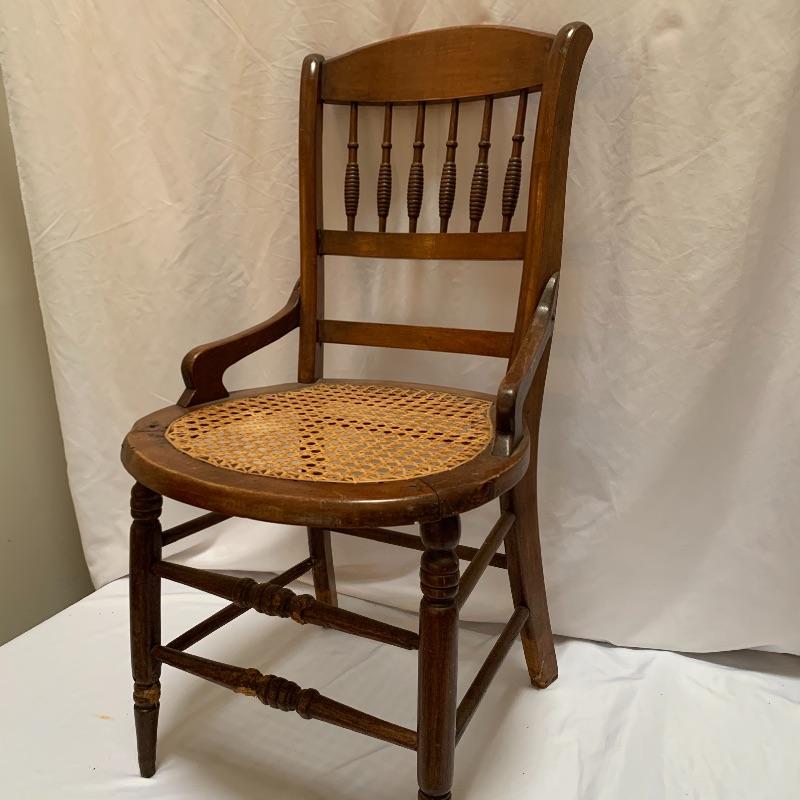 This lot includes two cane bottom wooden chairs. The first chair has a couple chips in the wood and has some white paint on the side arm rest (see photos). This chair measures about 17.5 x 17.5” x 34.5” with a seat height at 16.5” The second chair’s arm rest comes off but appears to be an easy repair. This chair measures about 18” x 18” x 33” with a seat height at 16.5”. Local pick up only.