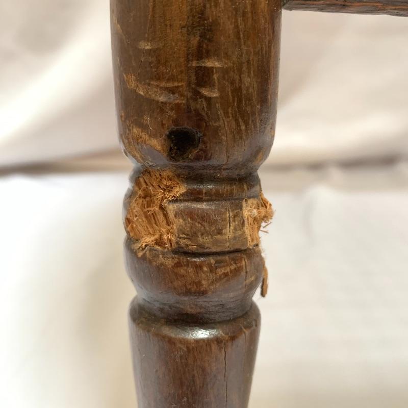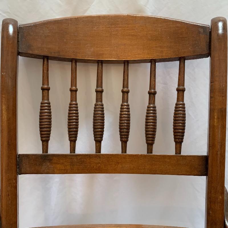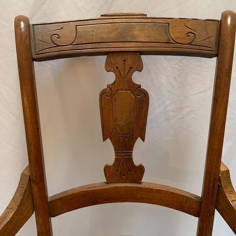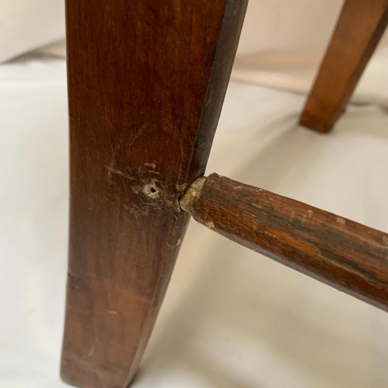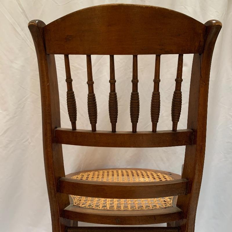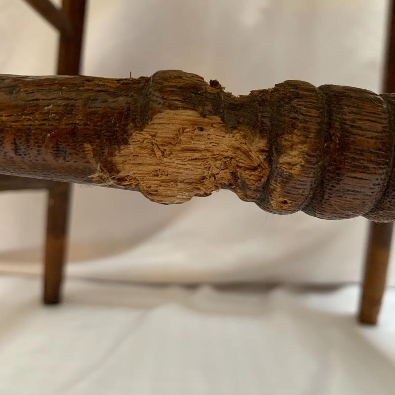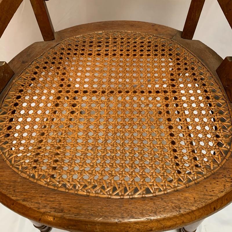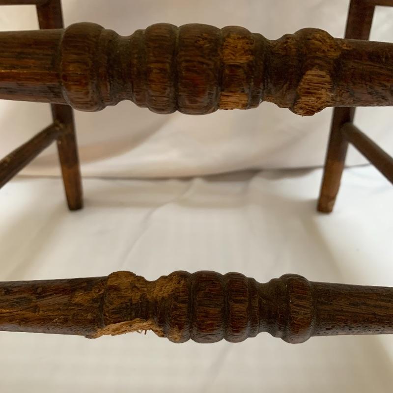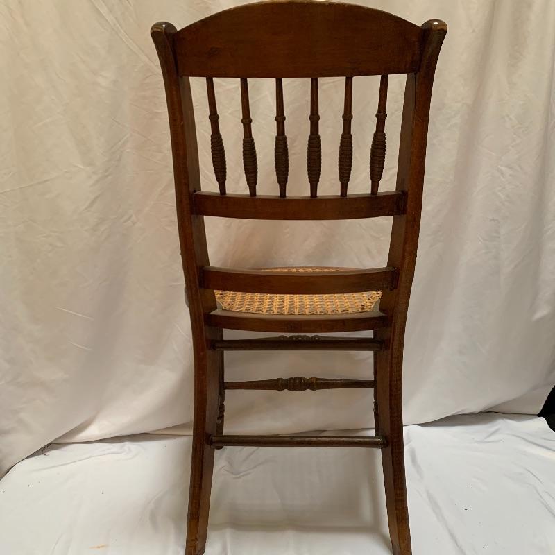 This lot includes two cane bottom wooden chairs. The first chair has a couple chips in the wood and has some white paint on the side arm rest (see photos). This chair measures about 17.5 x 17.5” x 34.5” with a seat height at 16.5” The second chair’s arm rest comes off but appears to be an easy repair. This chair measures about 18” x 18” x 33” with a seat height at 16.5”. Local pick up only.