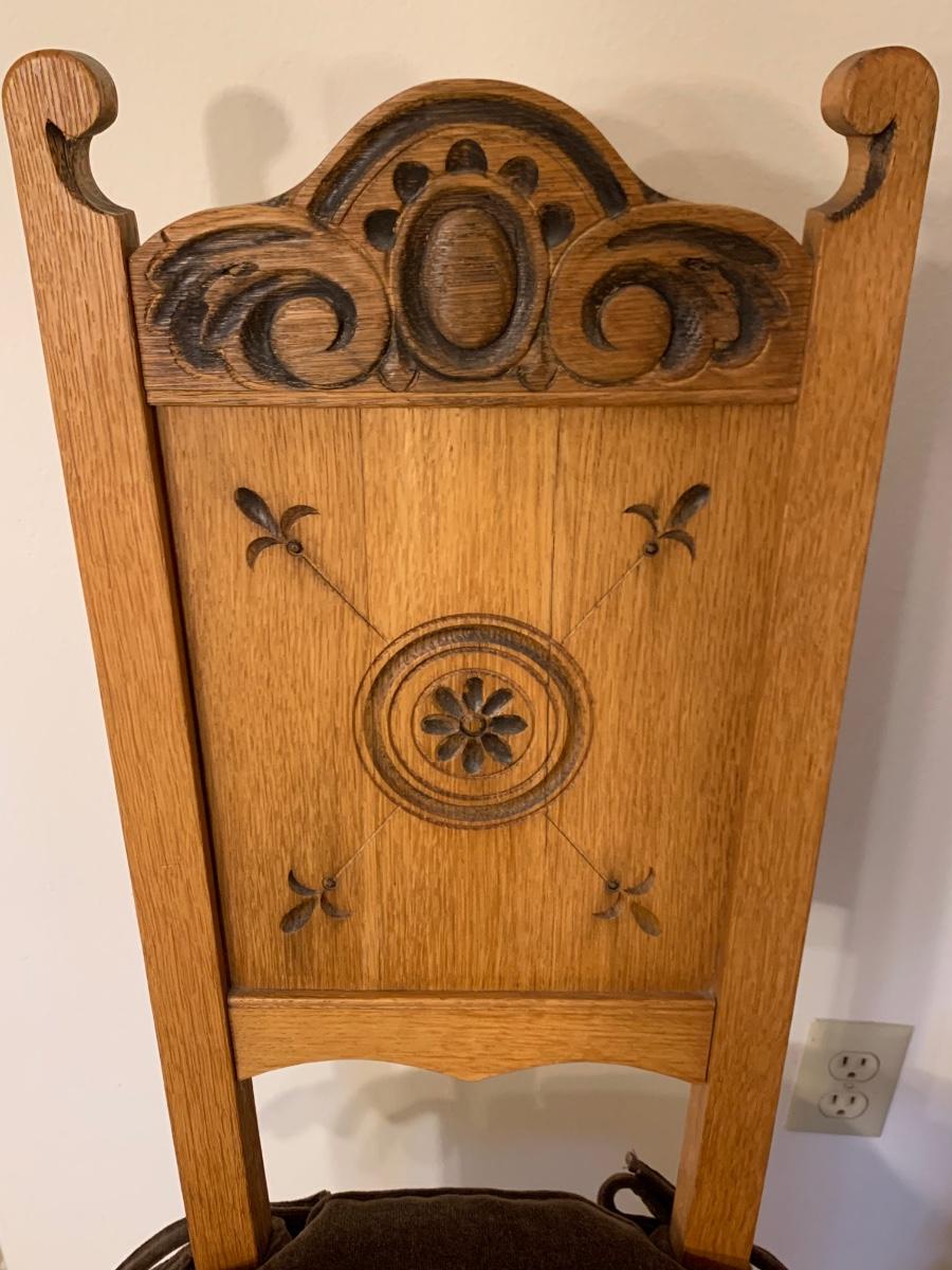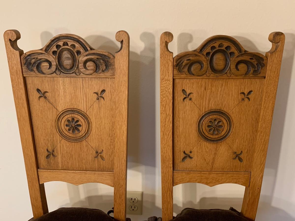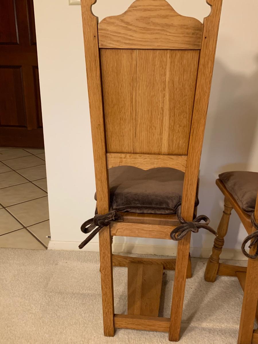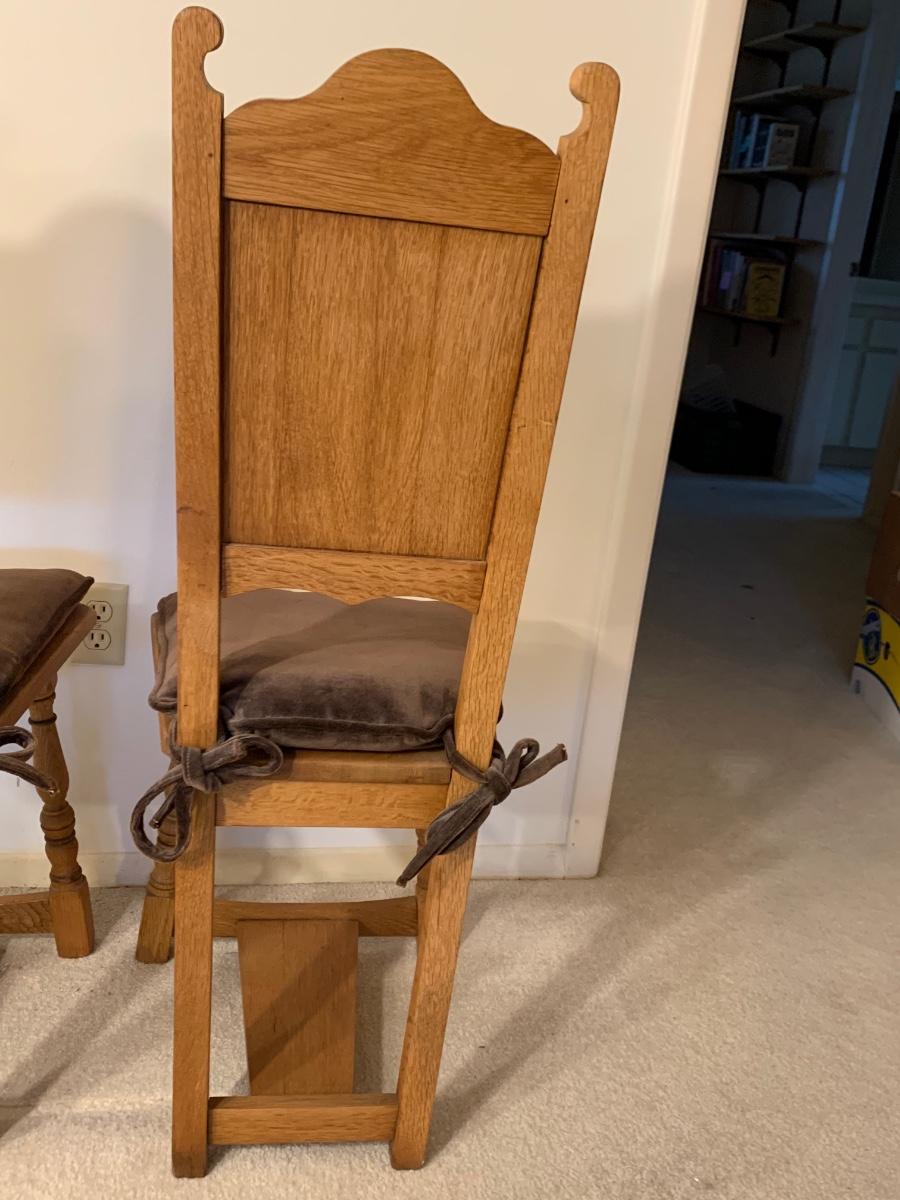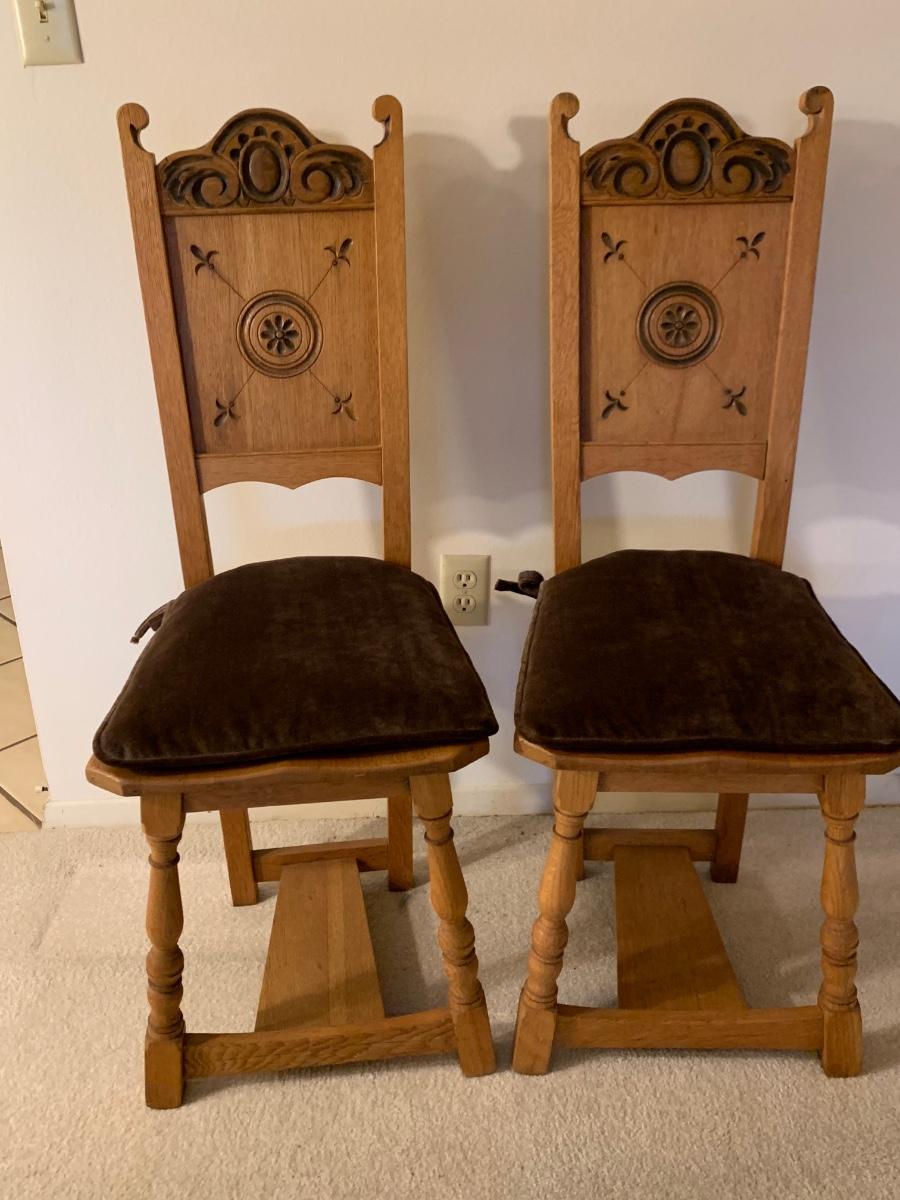 Solid wood in excellent condition with velvet seat cushions. 42" hi 18" seat height. 16" wide