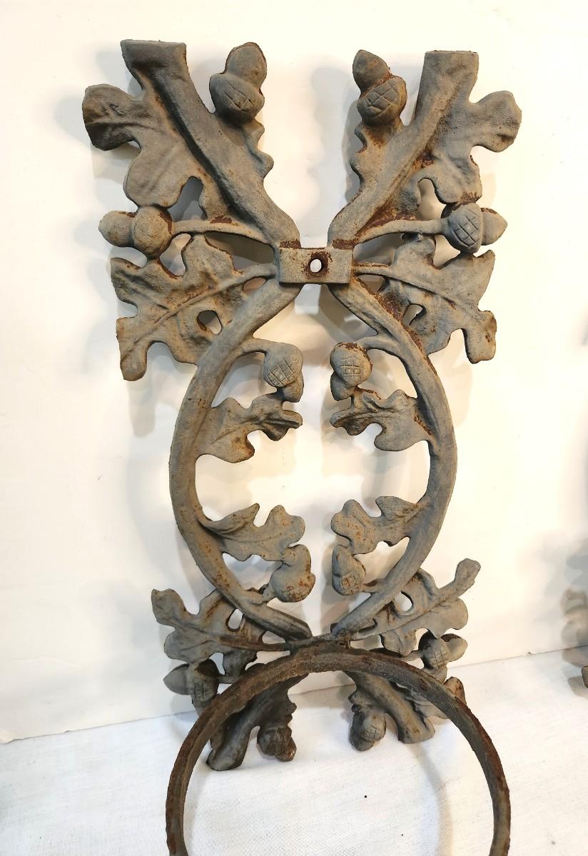 Nice matched pair of vintage cast iron pot holders - Acorn accents. Each 17" tall, 8" across - measures 6.5" across ring. Vintage condition.
