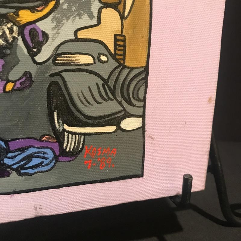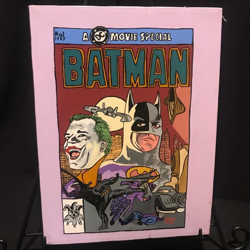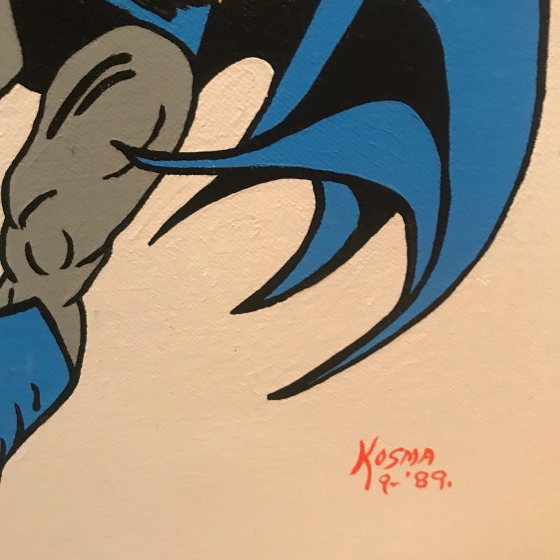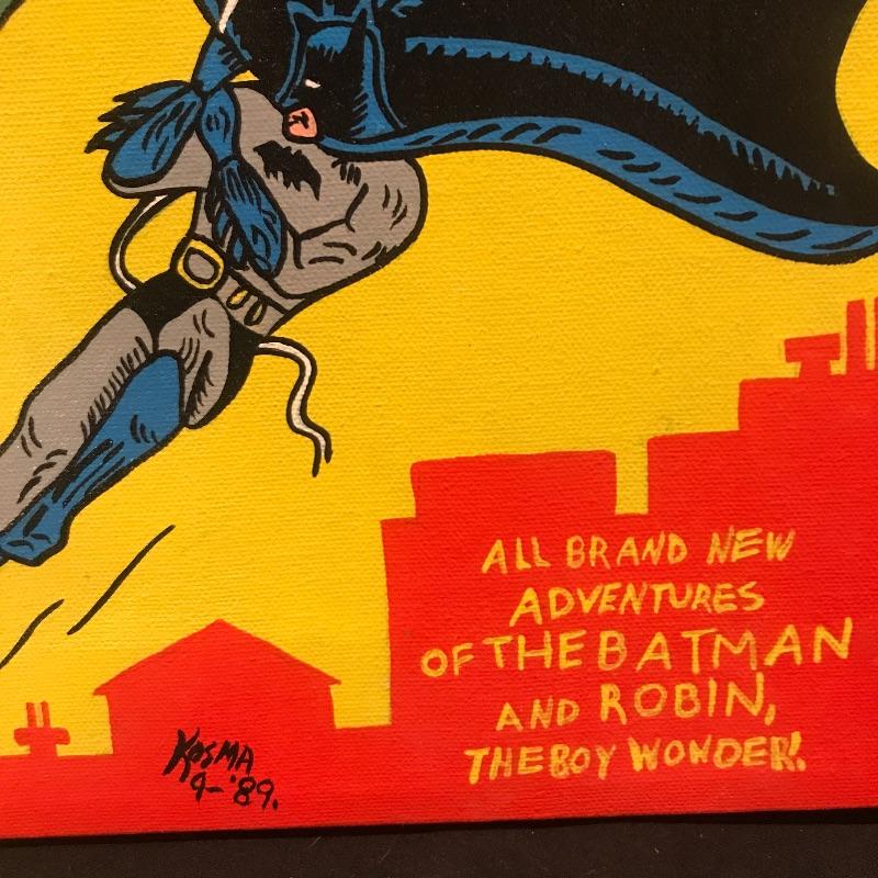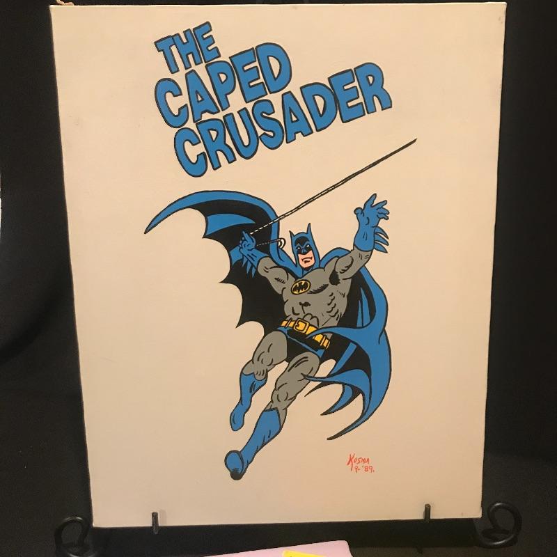 Colorful convos paintings of Batman. Larges Caped Crusader measures 20” x 16”, light purple trim one has a few blemishes on bottom (see pix) and measures 16” x 12”, bright yellow painting measures 14” x 10”. All on stretched canvas and signed by Kosma , a relative of our client. Shipping available.