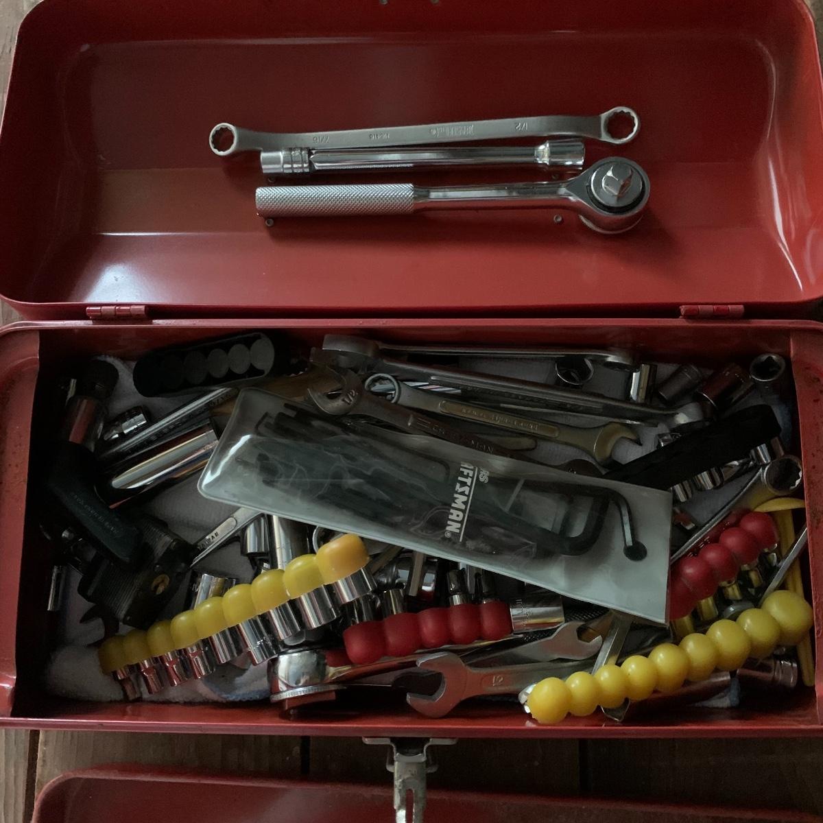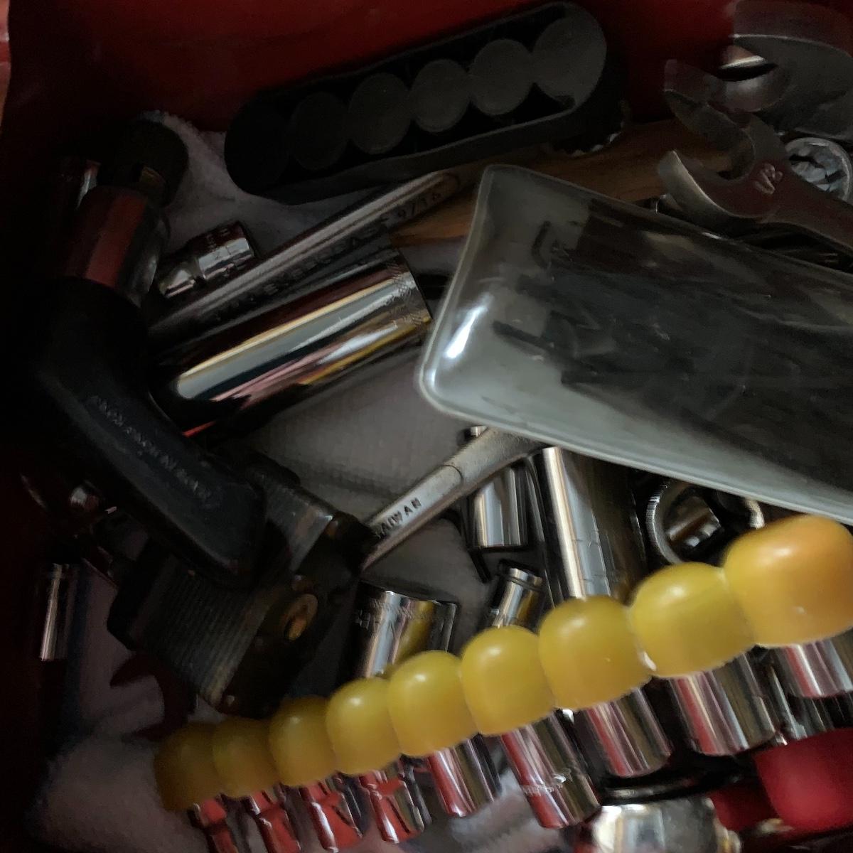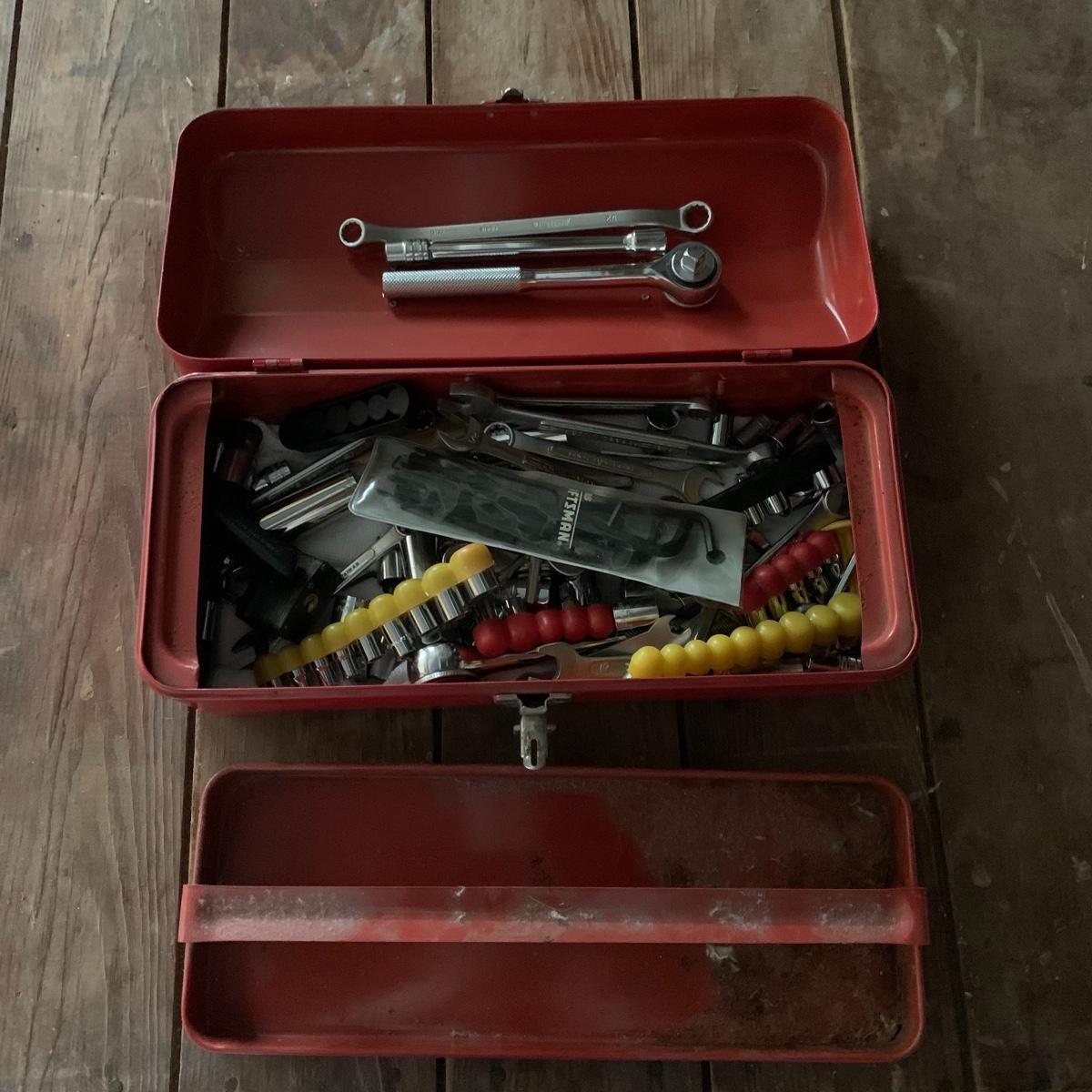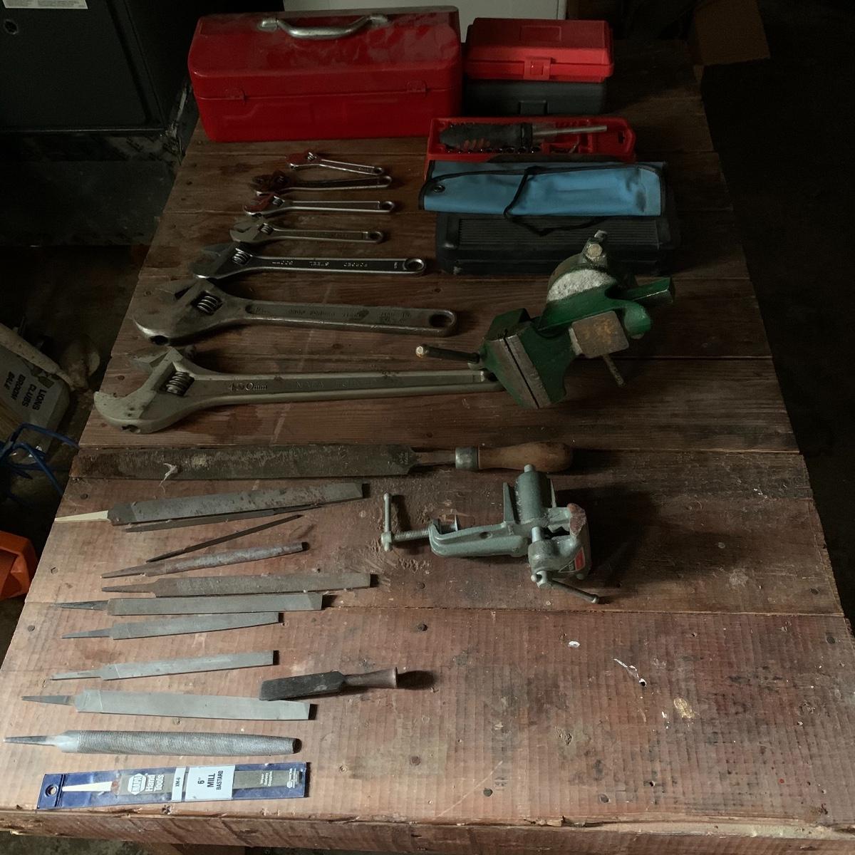 This lot includes many tools. There are lots of different metal files and wrenches. There are a few sets of ratchet wrenches (GearWrench and Helix brands). You’ll also find a set of Craftsman sockets and Allen wrenches, as well as various other sockets. There are two vises: a Colombian 235 and a Fuller 3.5”. There are also a variety of miscellaneous tools found in a nice red metal toolbox. Local pickup only.