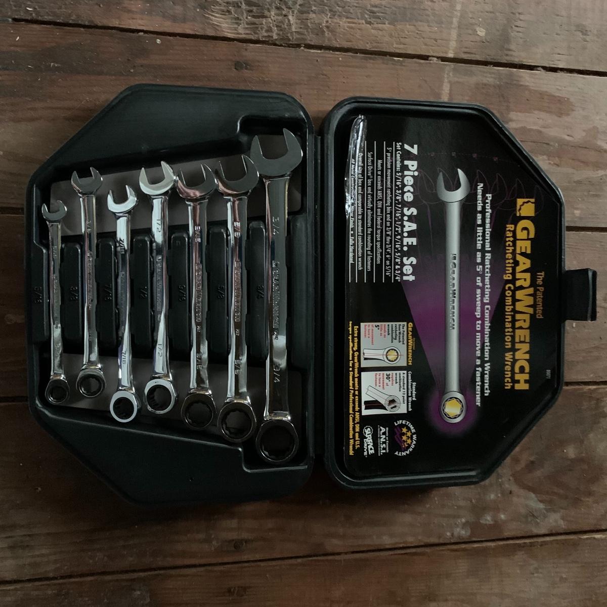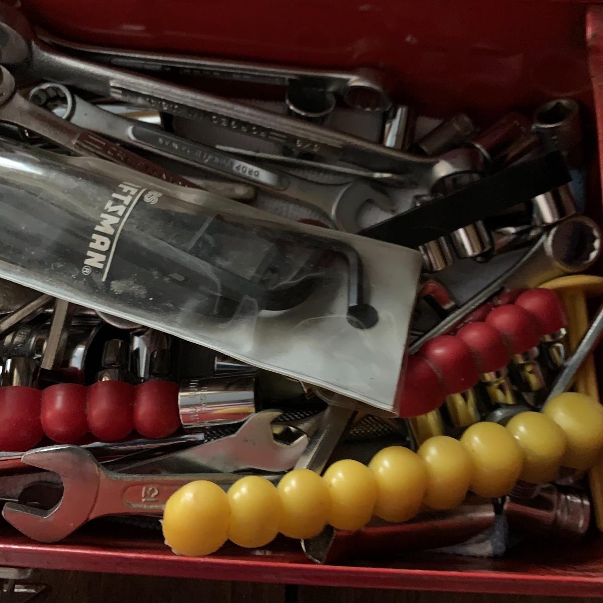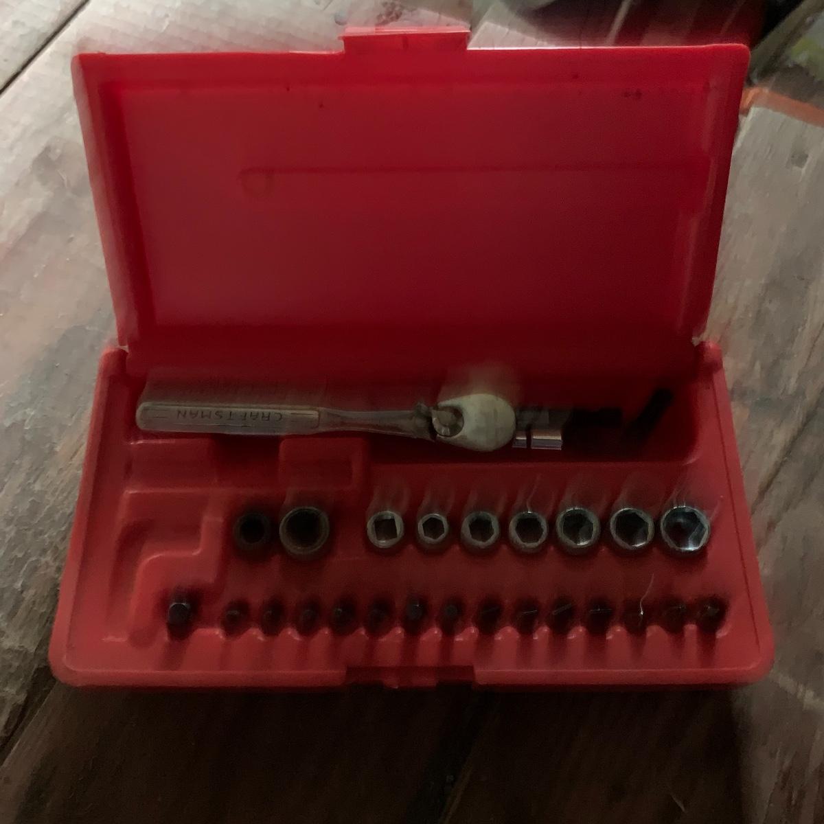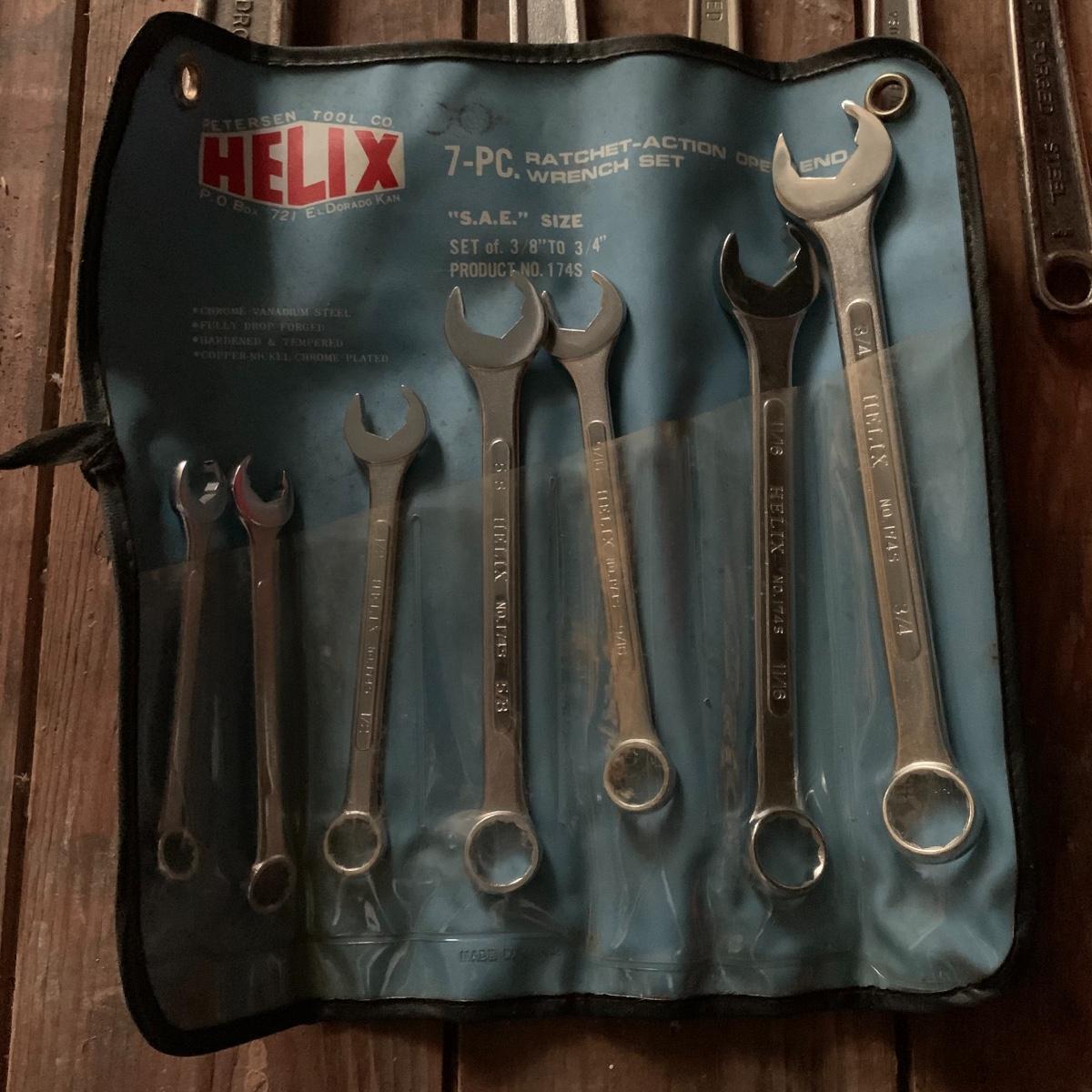 This lot includes many tools. There are lots of different metal files and wrenches. There are a few sets of ratchet wrenches (GearWrench and Helix brands). You’ll also find a set of Craftsman sockets and Allen wrenches, as well as various other sockets. There are two vises: a Colombian 235 and a Fuller 3.5”. There are also a variety of miscellaneous tools found in a nice red metal toolbox. Local pickup only.
