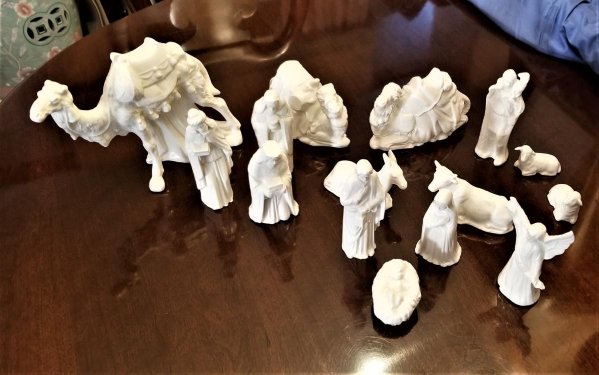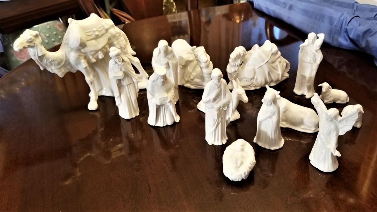 Attic find! Vintage White Ceramic Nativity Set - 15 pieces. Cow has a broken ear. For scale, camel is 6" tall, Joseph is 5" tall