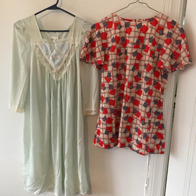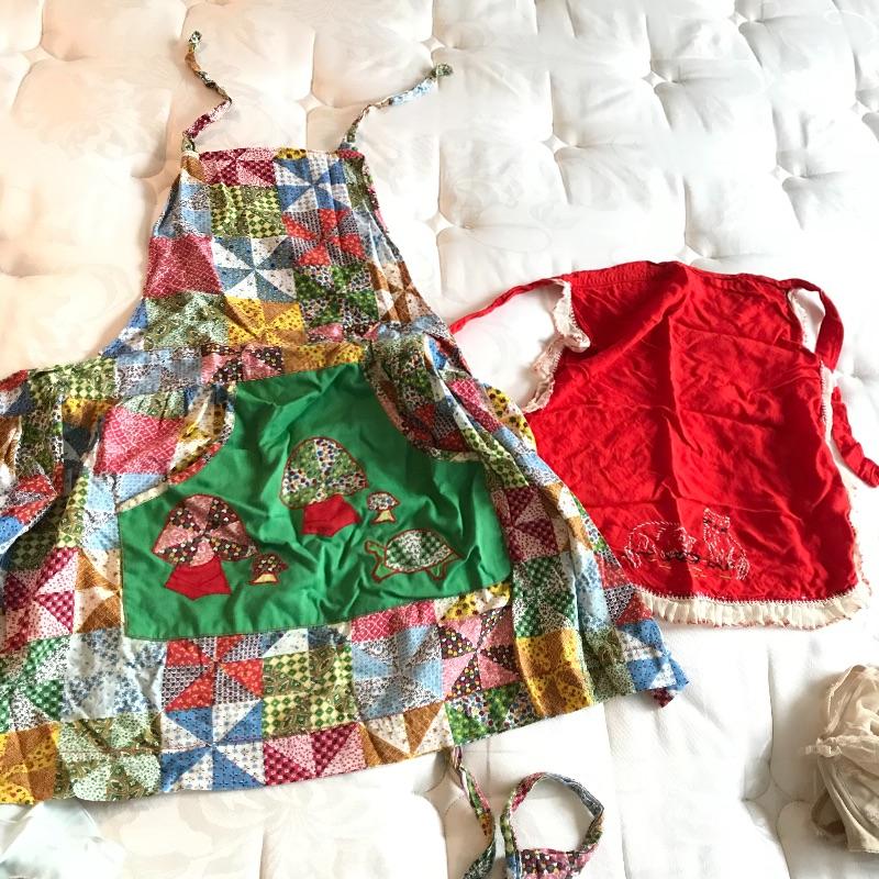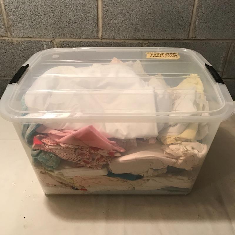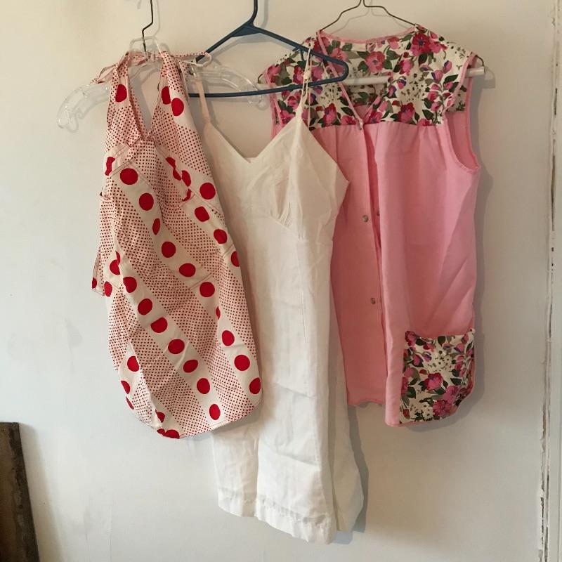 Large plastic storage bin full of vintage women’s apparel. Sizes appear to be mostly small to medium. One bra size states 36c. Collection includes multiple aprons, some appear to be hand made and even a couple children’s aprons are in the bin! Plenty of vintage nightgowns in delicate pinks, blues and ivory. Bin has a mild moth ball smell, but garments are in great condition! Shipping available.