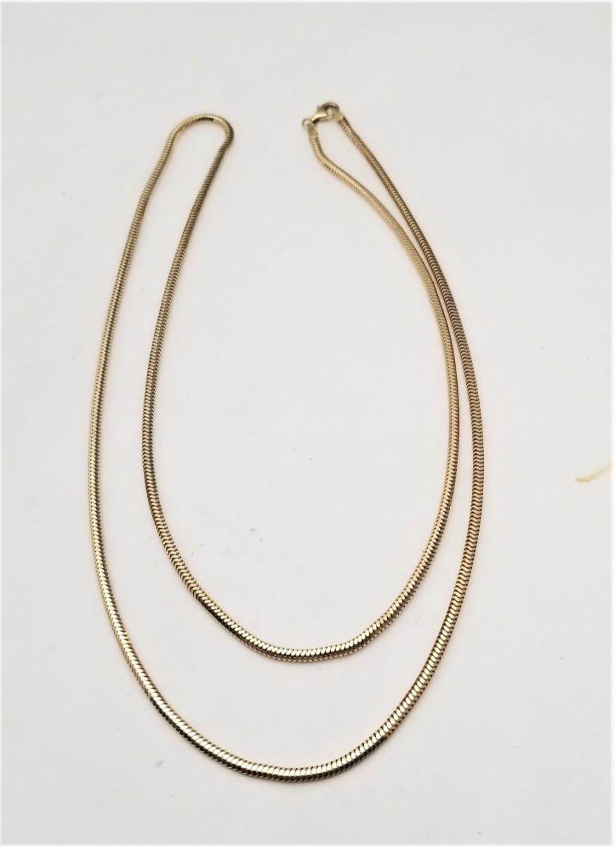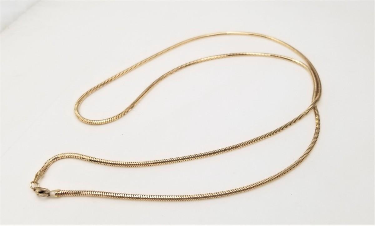 About 29" long, supple liquid design gold necklace - tested and marked 10kt gold. Nice condition. The minimum bid is about 10% above the scrap value of the gold.