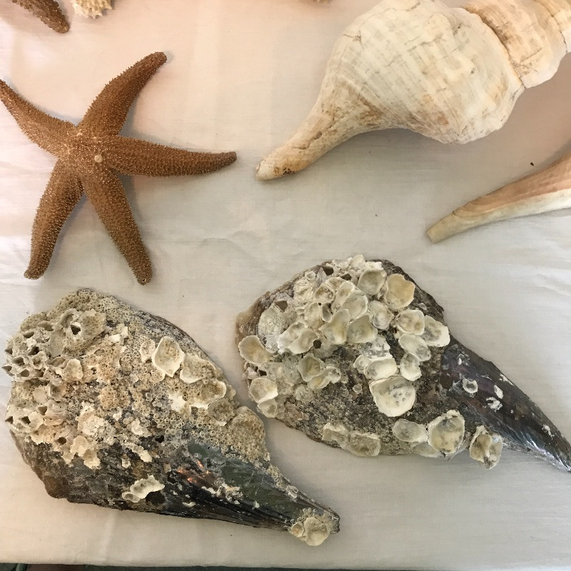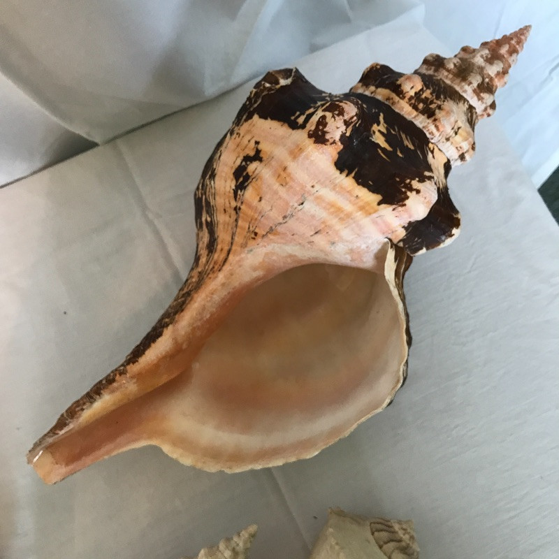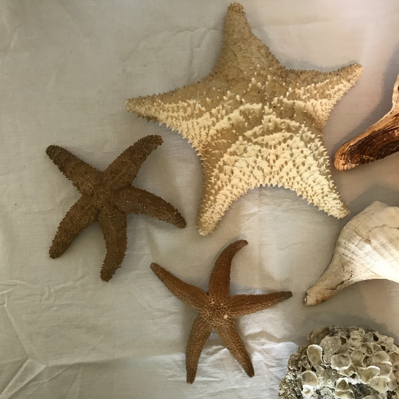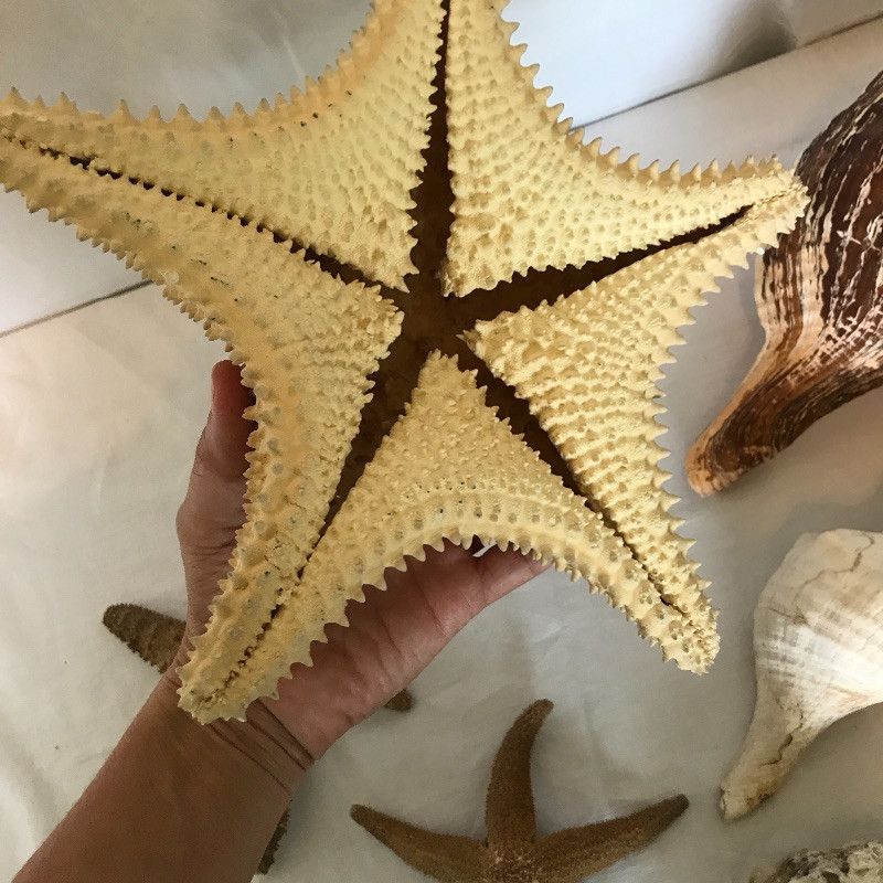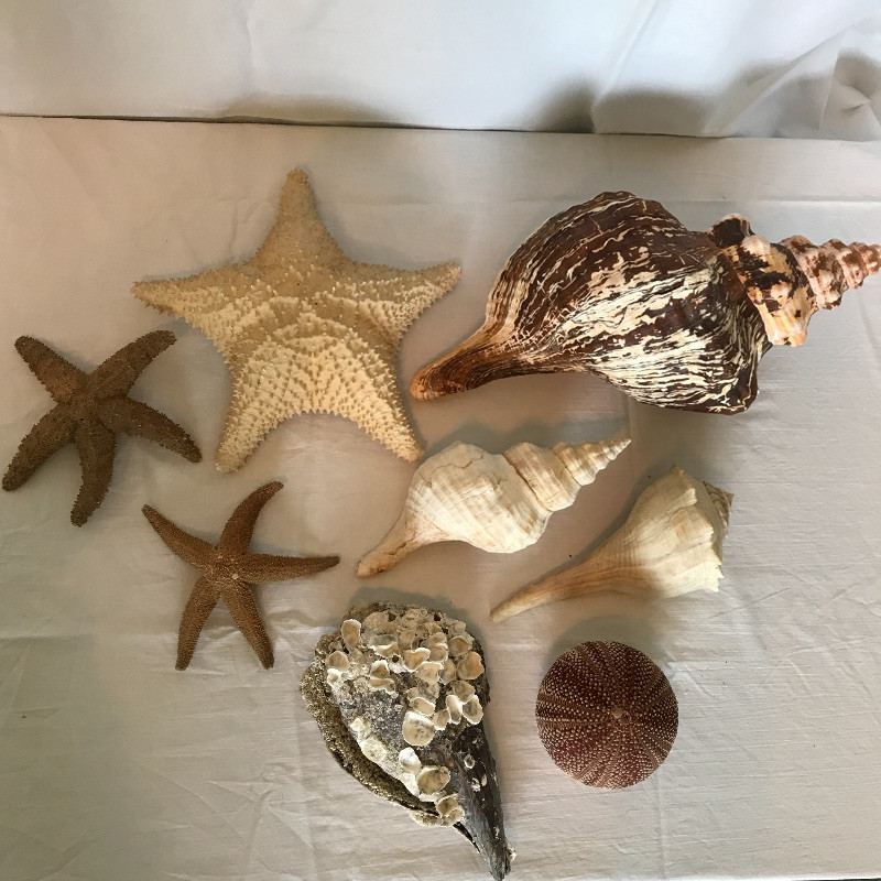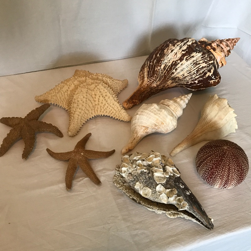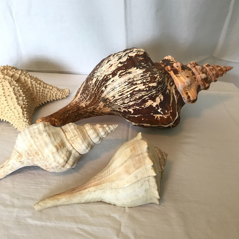 Decorate your space with this lovely assortment of large shells that includes three starfish and more. See images for size as the images do not convey the sizes of these beauties well. Largest shell measures approx 15” x 6” diameter. Largest starfish is 10” point to point. Local Pickup Only.