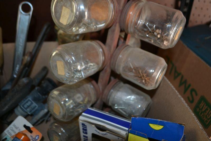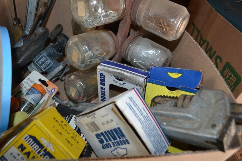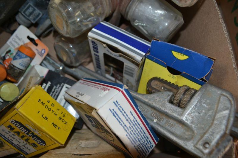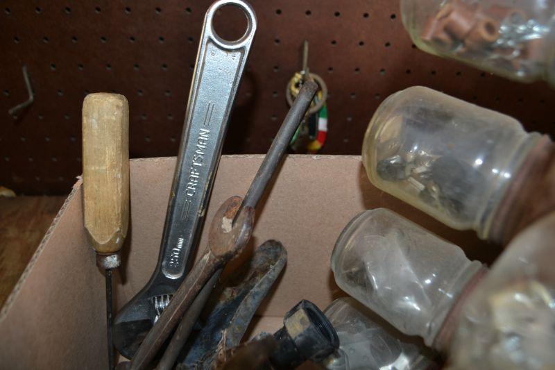 LOT 242 BOX OF TOOLS AND HARDWARE