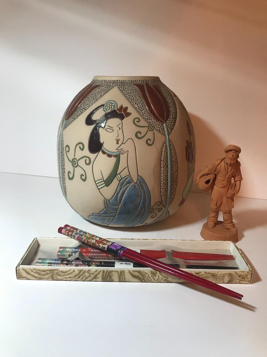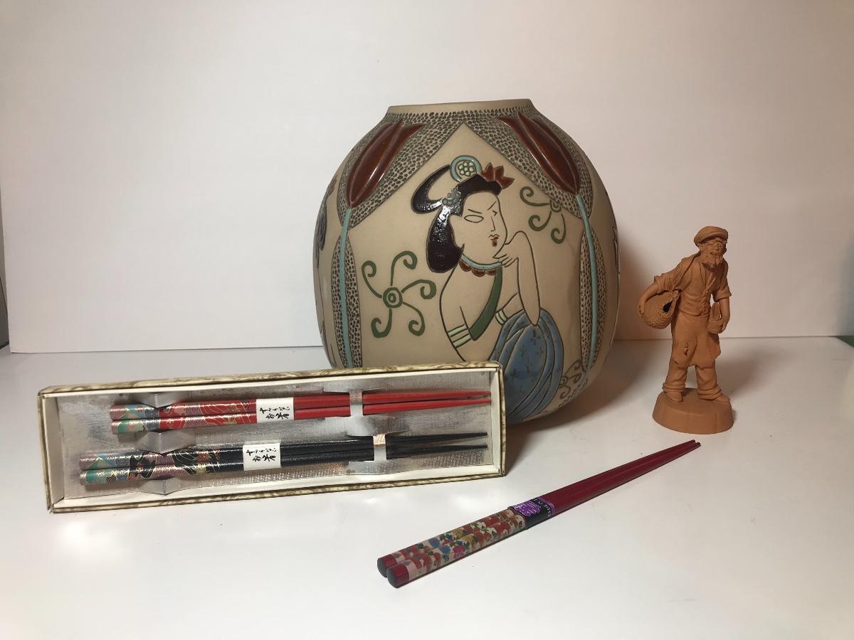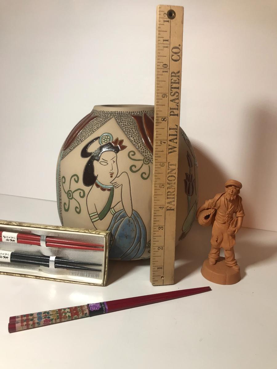 Hand crafted, signed vase, partially glazed, chopsticks, and old man sculpture. Please see all pictures as they are the best representation of the items. The pictures show condition, measurements if taken, and what is included in the lot. Due to the large amount that we photograph and the time frame, we are not always able to take measurements. All items unless noted, are pre-owned and have been used. If you purchased furniture, you must bring help. We do not allow one person to carry large furniture out on their own. Bring help, tools and a truck for the safety of our client’s homes, and your personal safety. Company policy. Thank you.