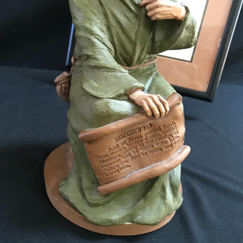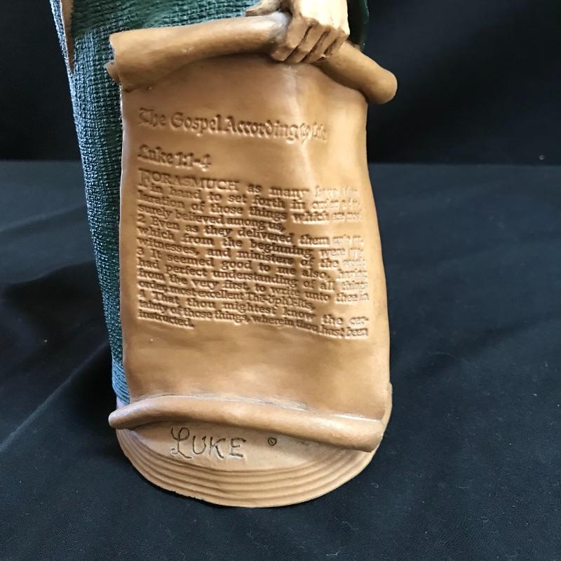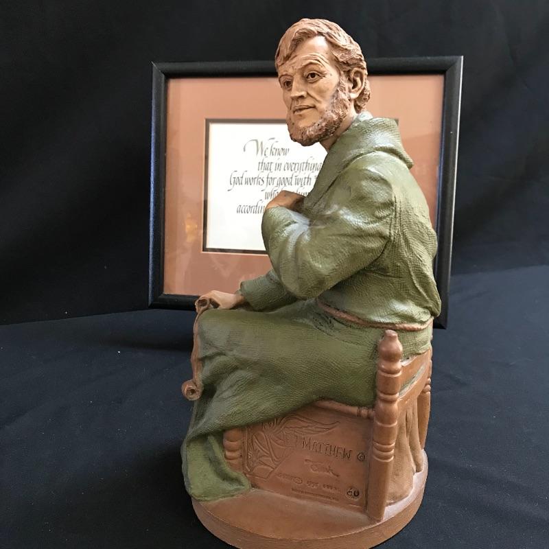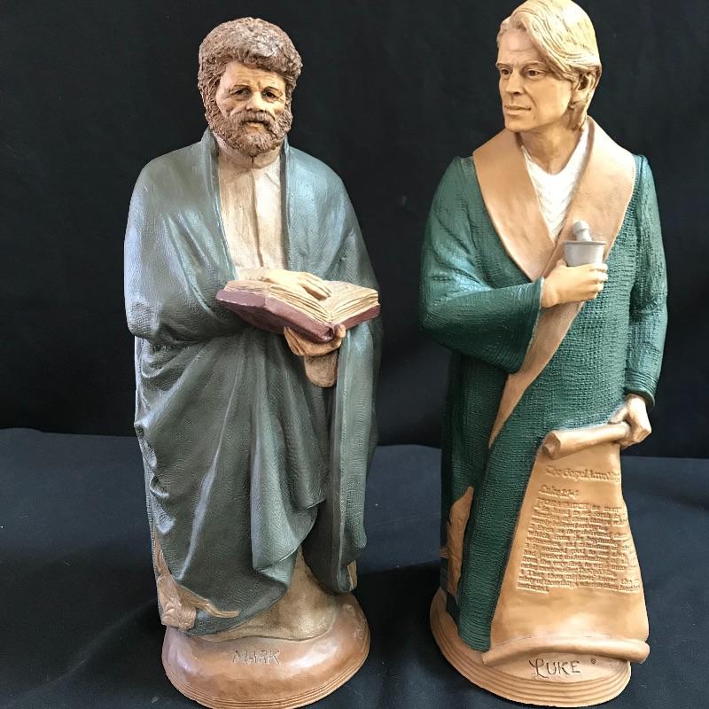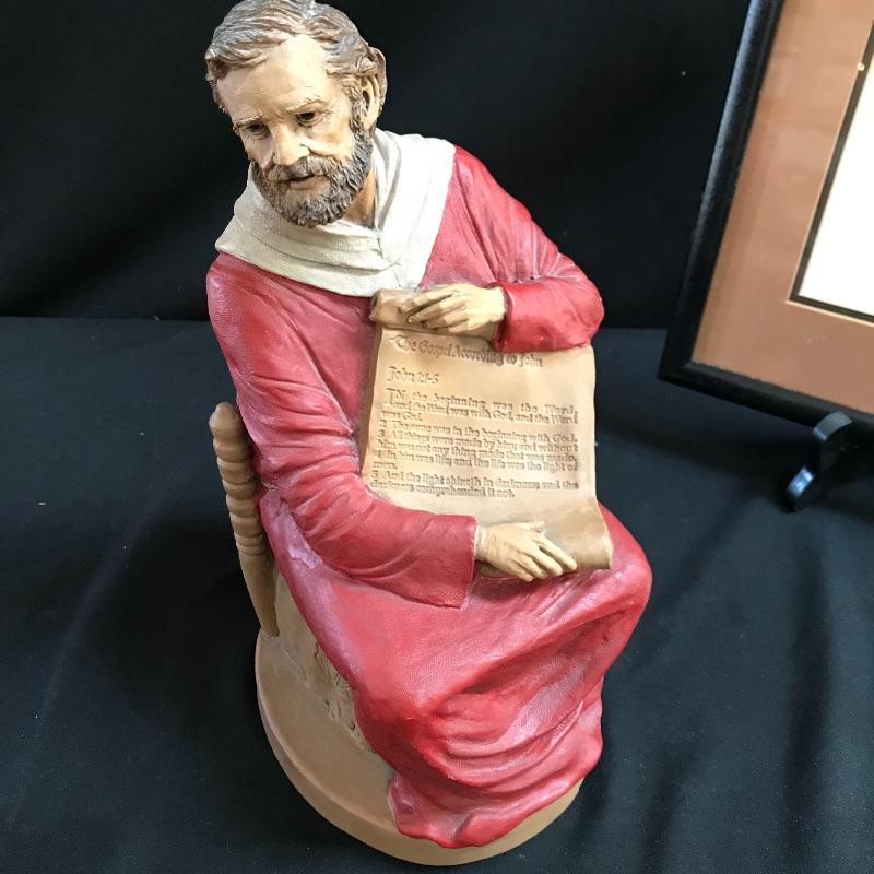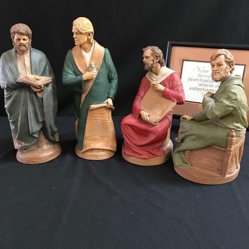 Matthew, Mark, Luke and John statuette collection signed by T Clark and with numbers ranging from 53 to 77. All of these Tom Clark statuettes have verses on scrolls or a book. They are in great shape with lovely details on all sides. Luke is barely the tallest at almost 13”. Statuette collection is accompanied by a signed and framed calligraphic art behind glass. Frame is black colored wood and measures 10.5” x 8.75”. Shipping available.