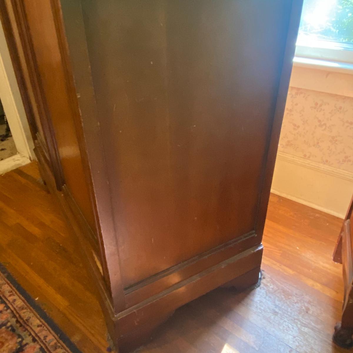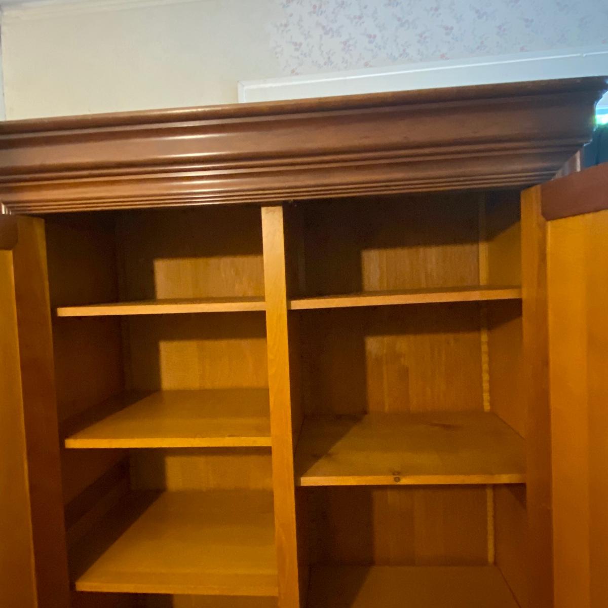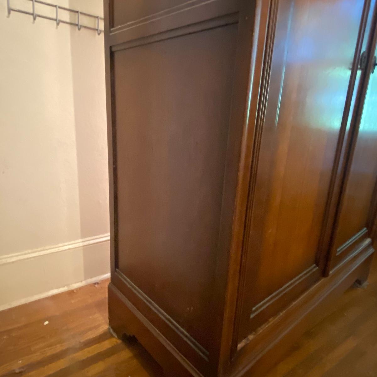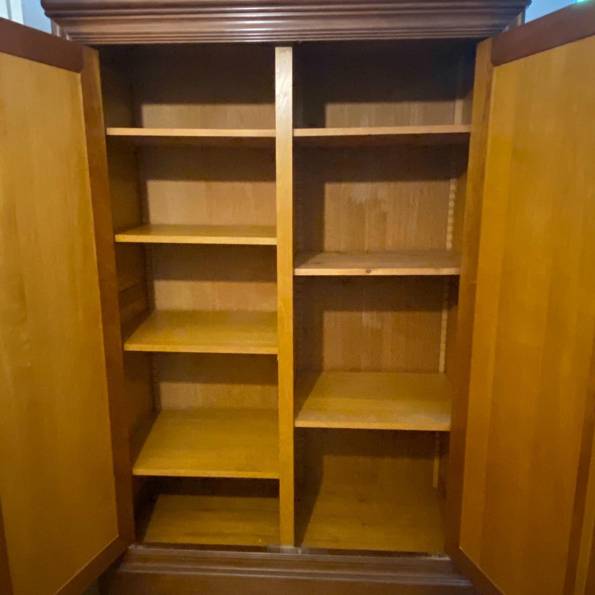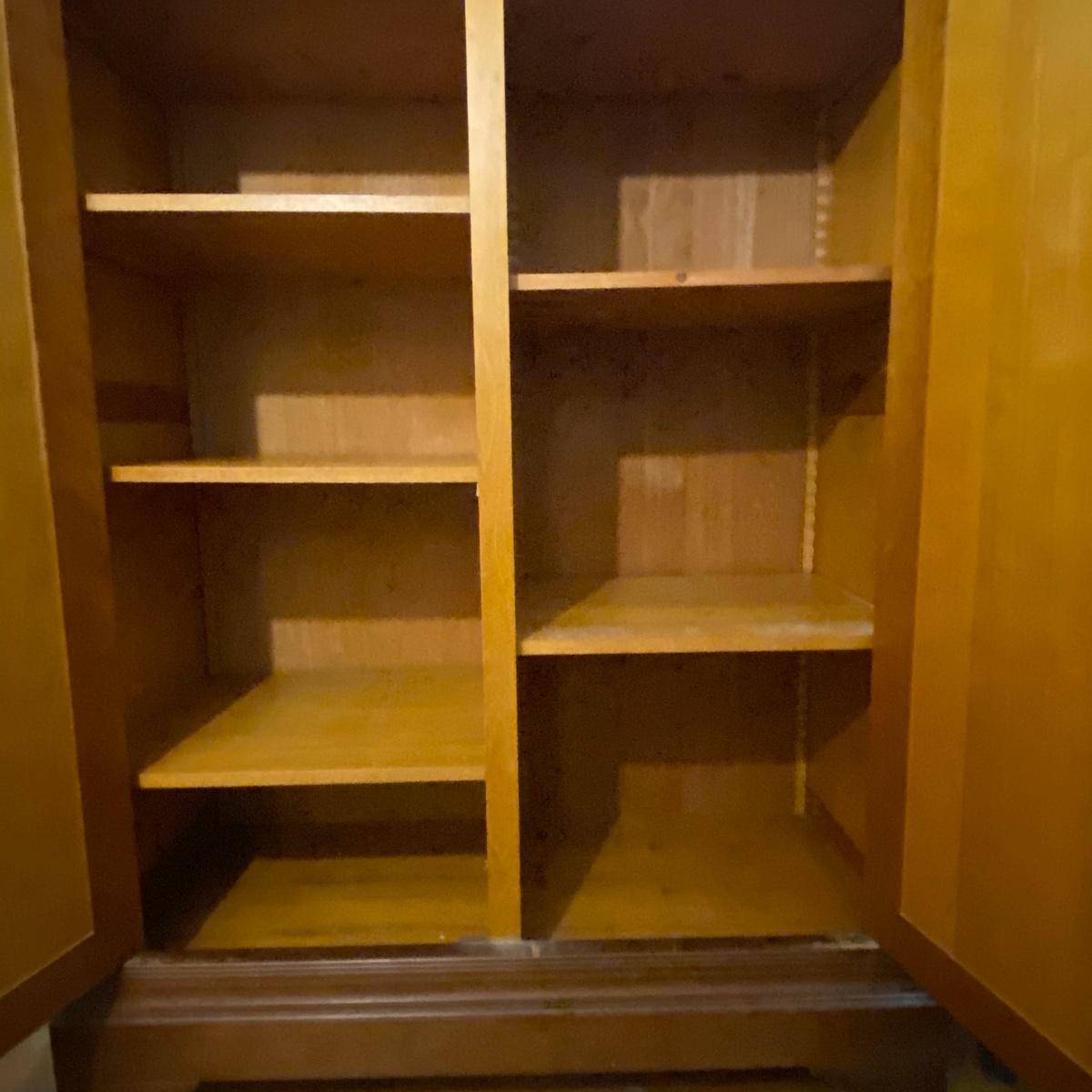 Lot includes large sturdy wooden dresser unit. Two doors with brass-like accents and key, opens to nine shelves; seven of which can be moved on it’s track. Measurements for this unit are 21"x48"x77". See photos for details. Local pickup only!
