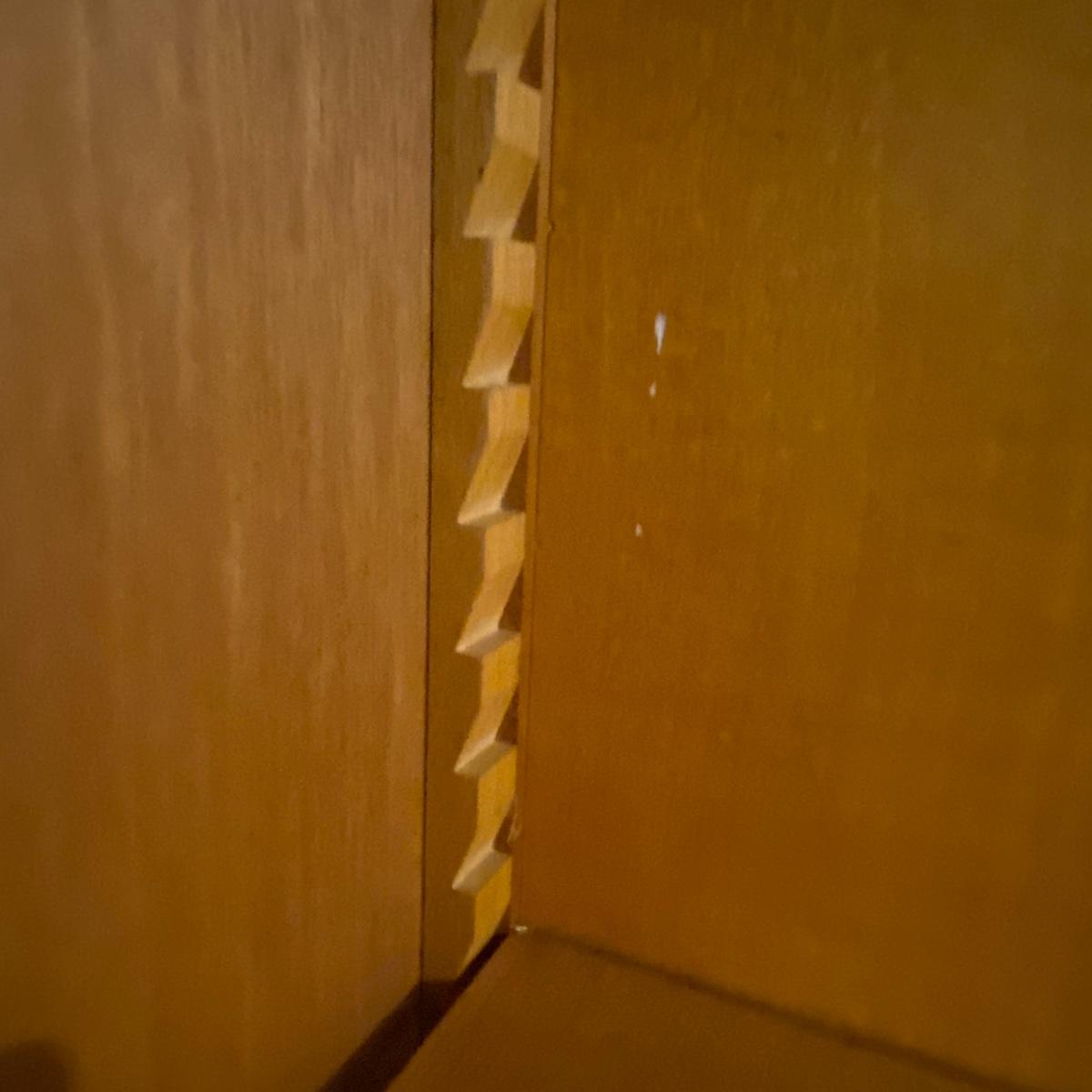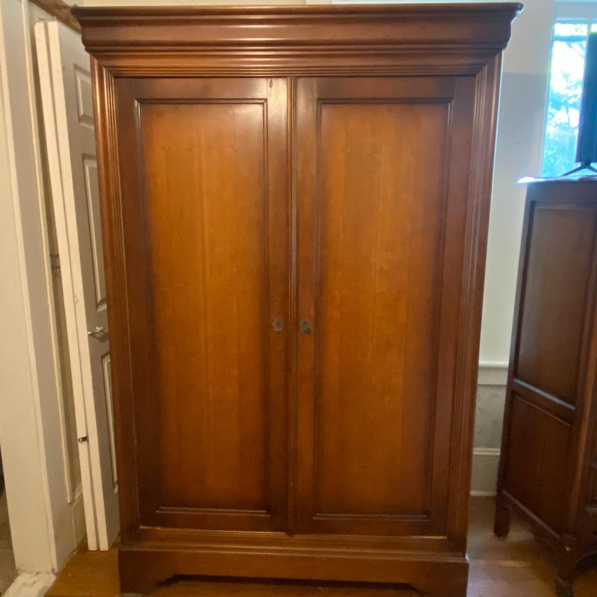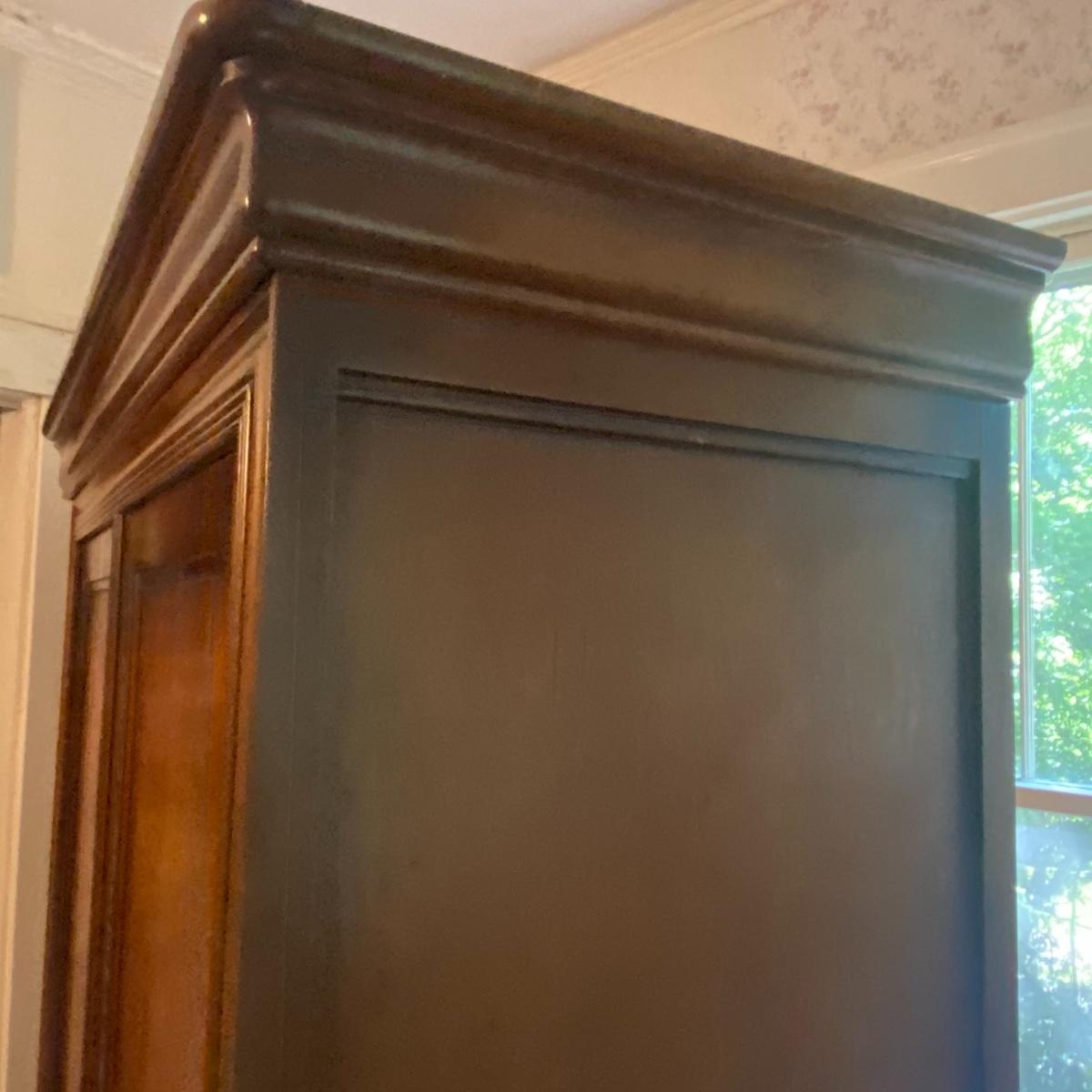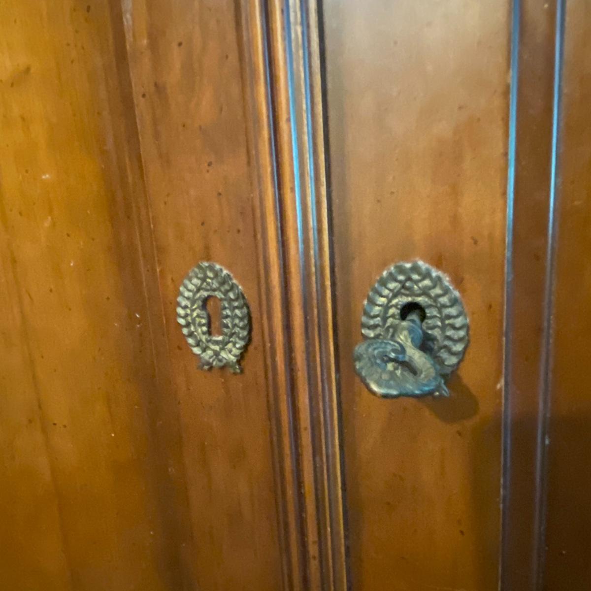 Lot includes large sturdy wooden dresser unit. Two doors with brass-like accents and key, opens to nine shelves; seven of which can be moved on it’s track. Measurements for this unit are 21"x48"x77". See photos for details. Local pickup only!