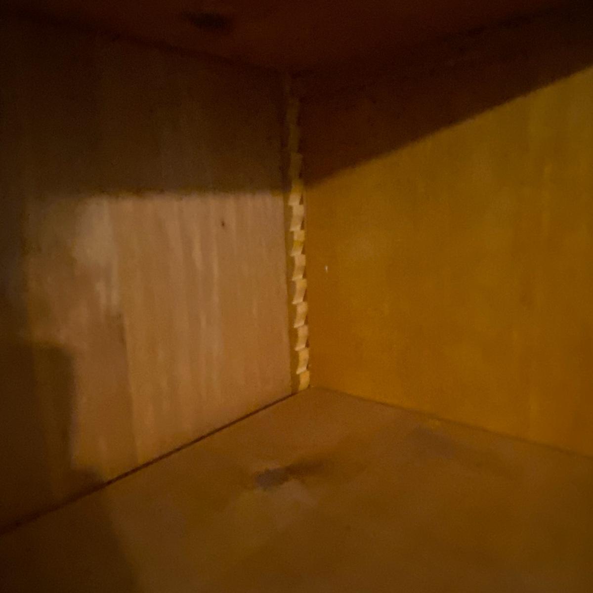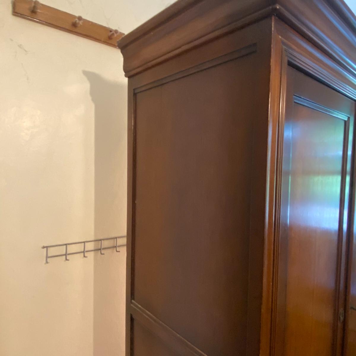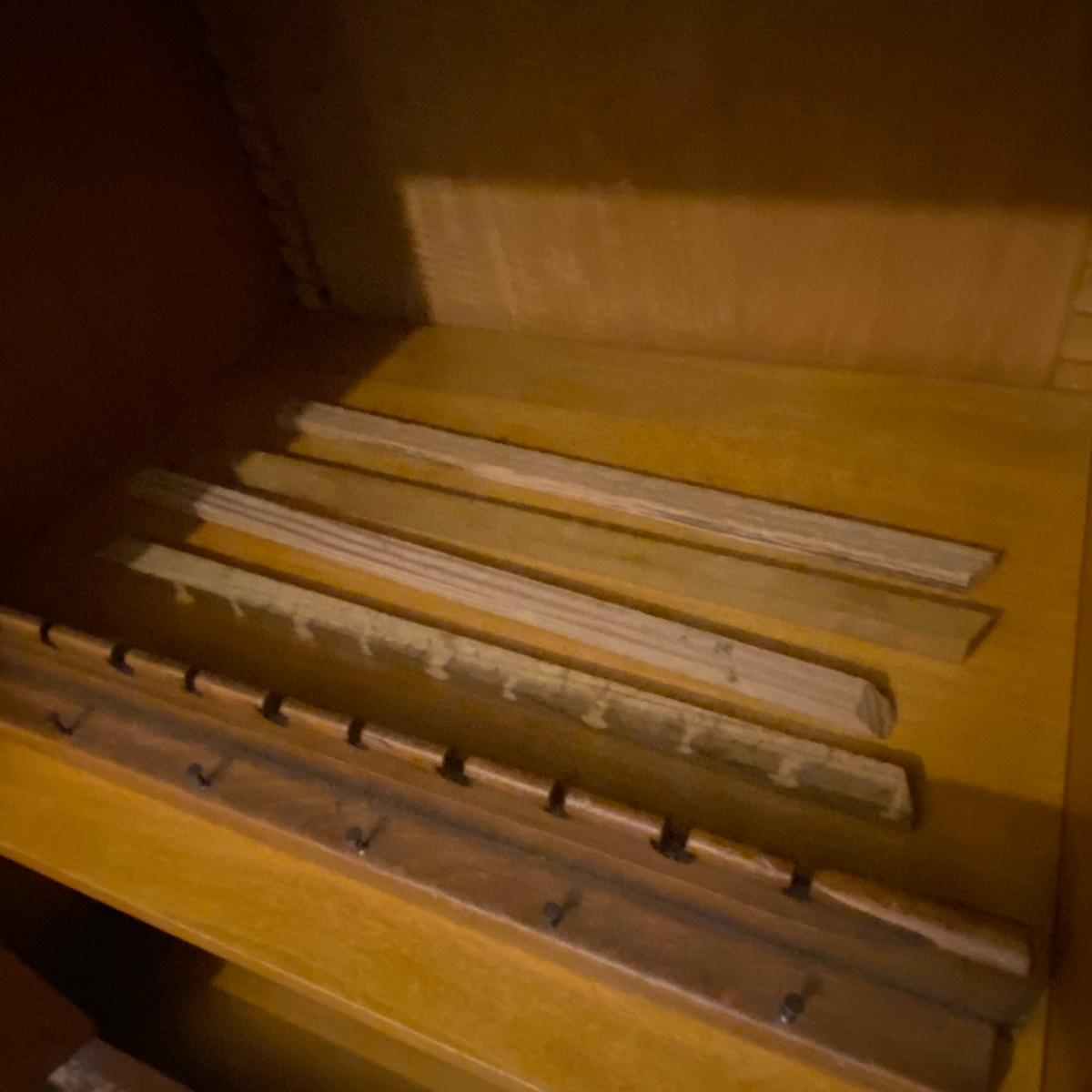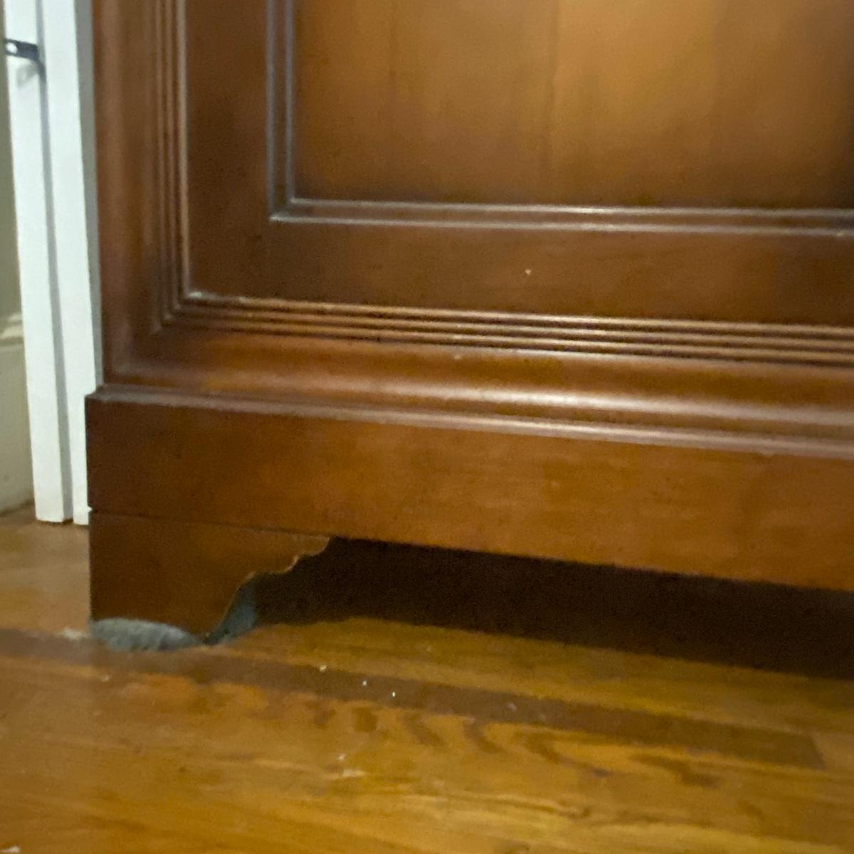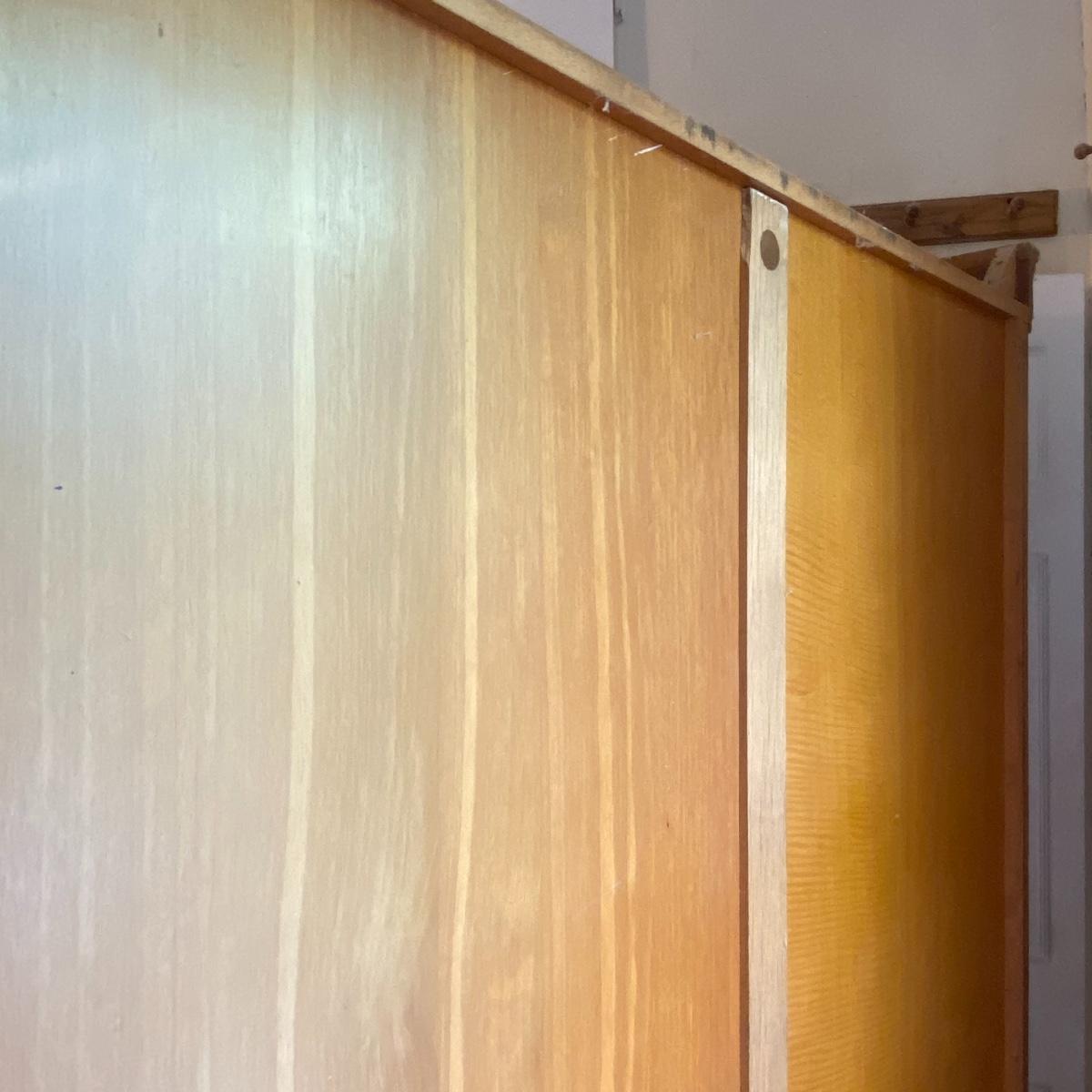 Lot includes large sturdy wooden dresser unit. Two doors with brass-like accents and key, opens to nine shelves; seven of which can be moved on it’s track. Measurements for this unit are 21"x48"x77". See photos for details. Local pickup only!