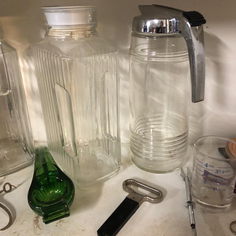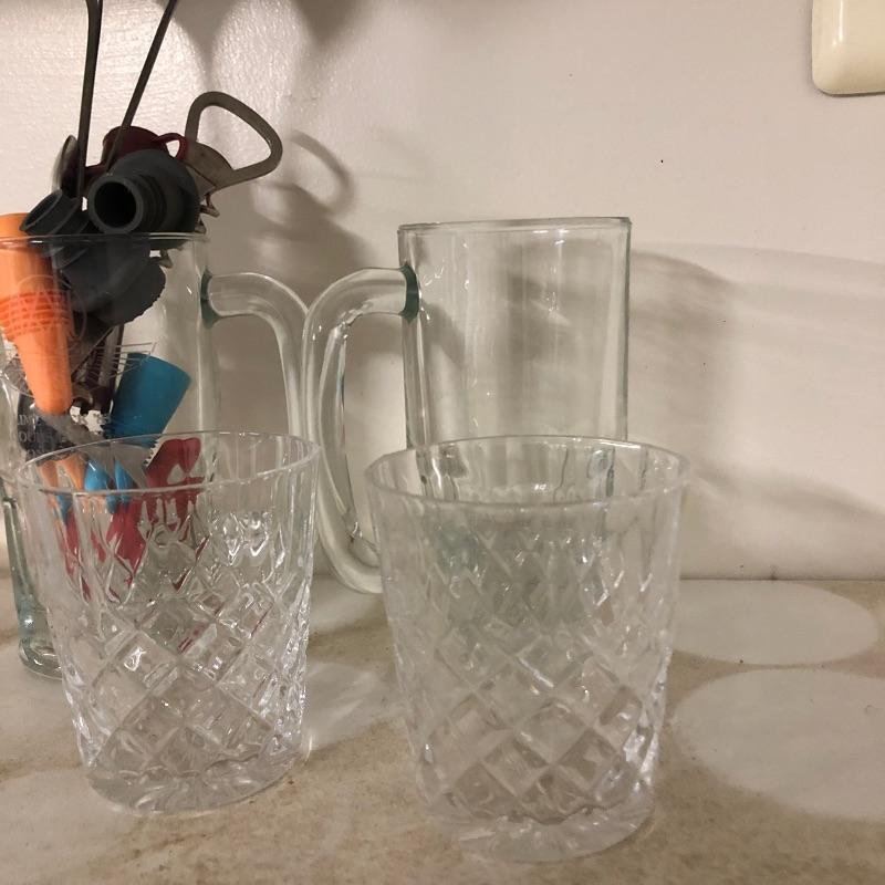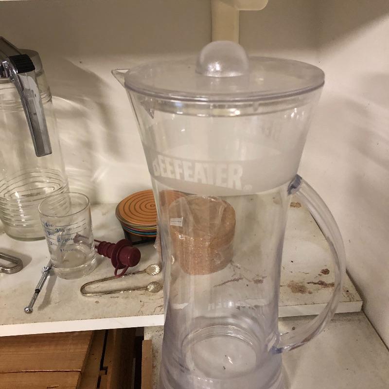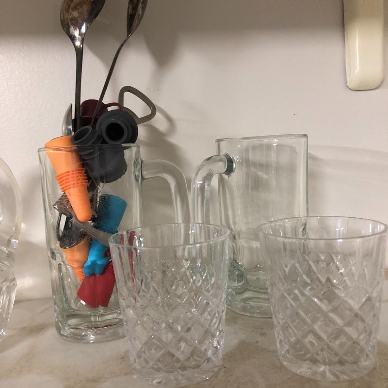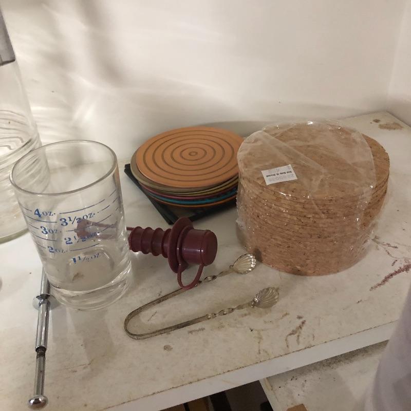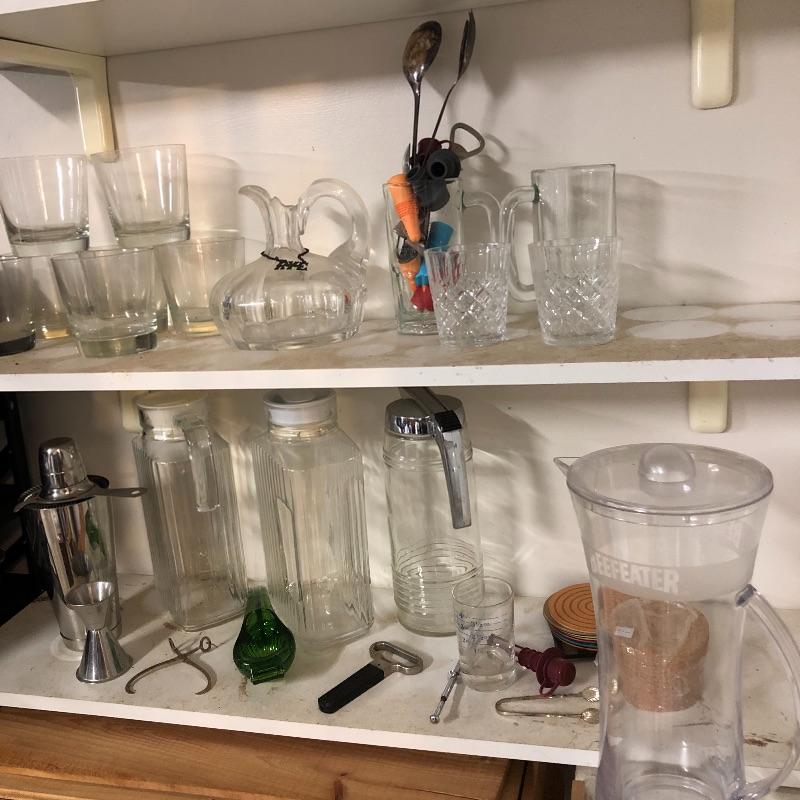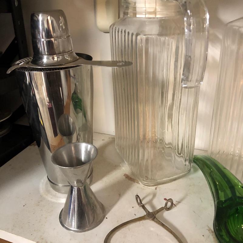 Be ready to entertain with this lot! It includes seven mixed drink glasses, two mugs with handles and two other glasses. It includes numerous jugs, and items to mix drinks. Local pick up only.