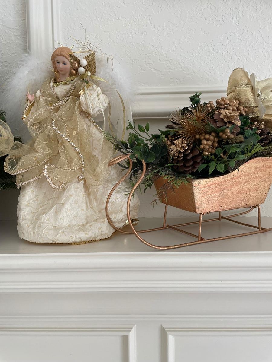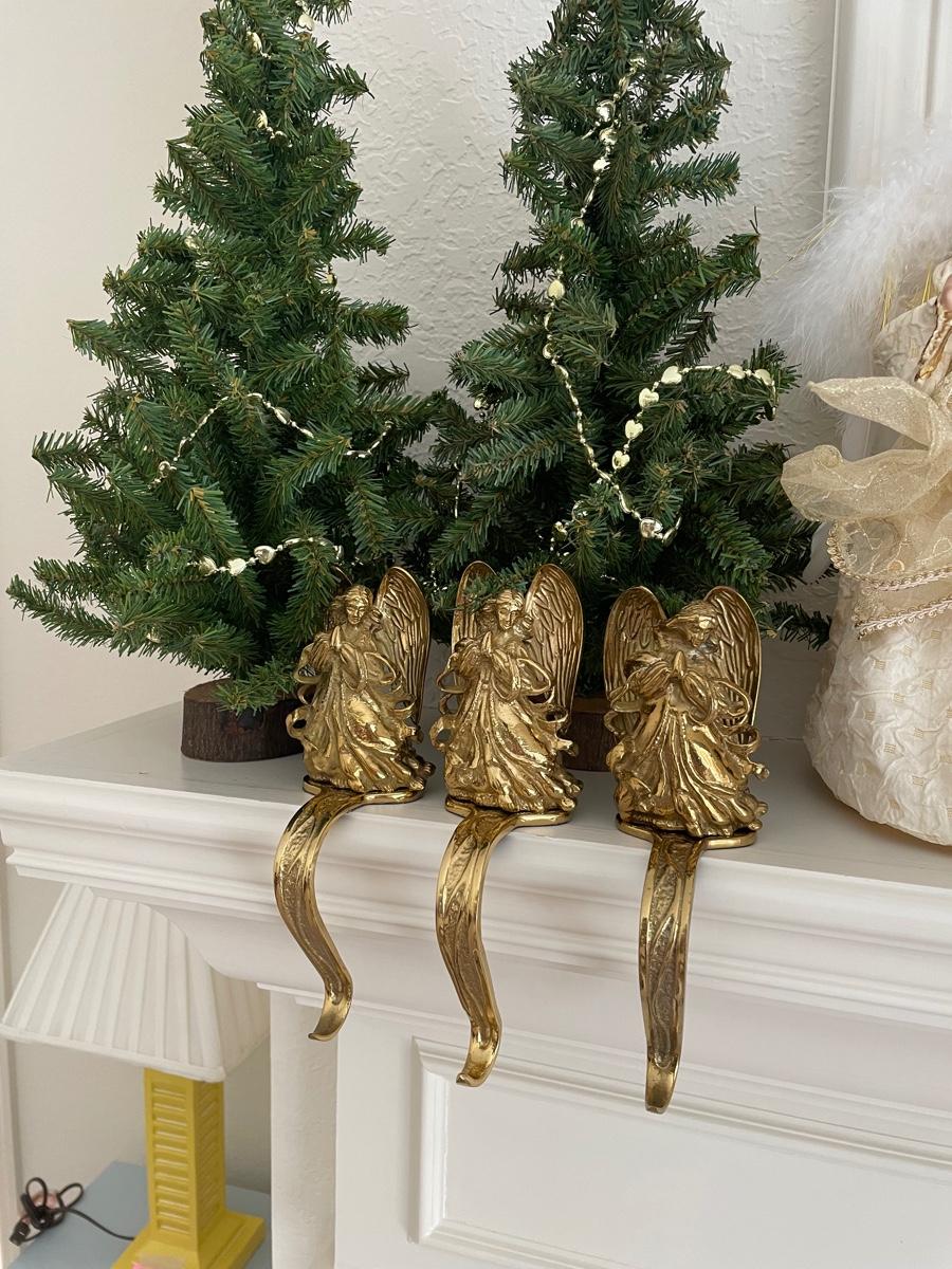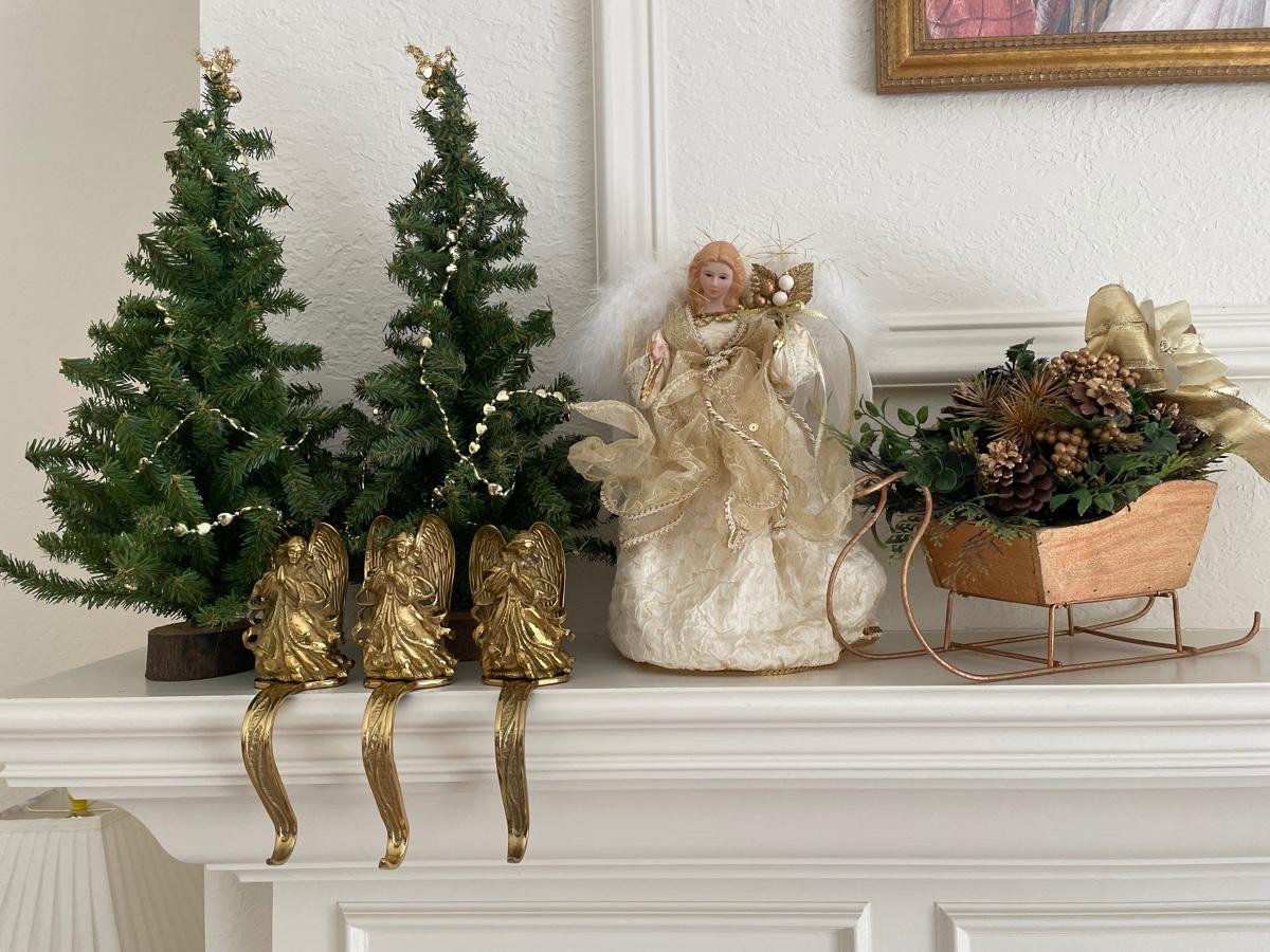 Miniature artificial trees, stocking hangers and angel figurine and a silk arrangement