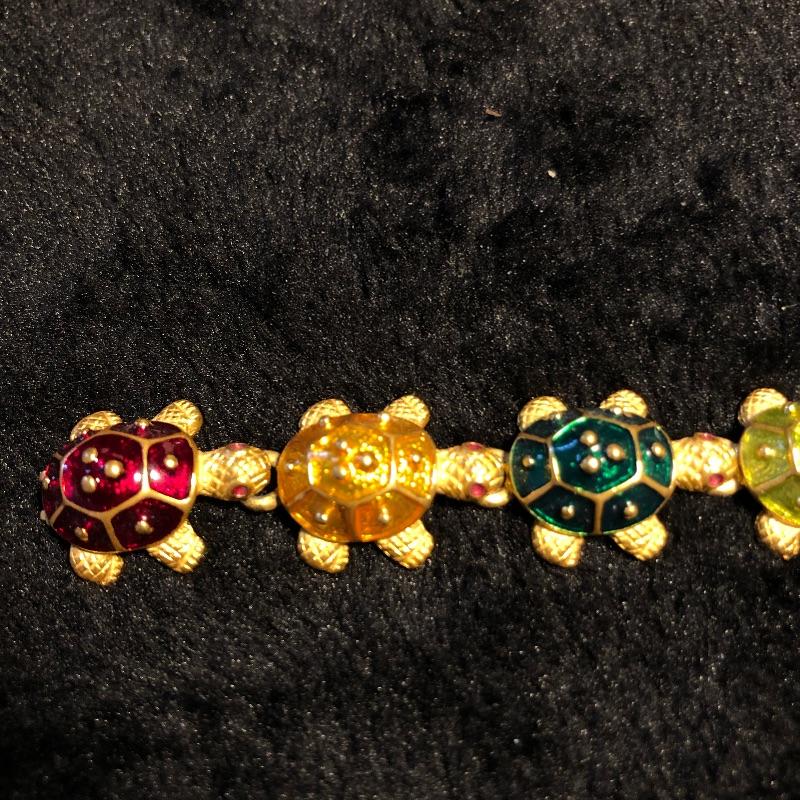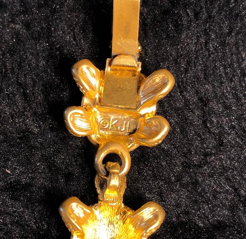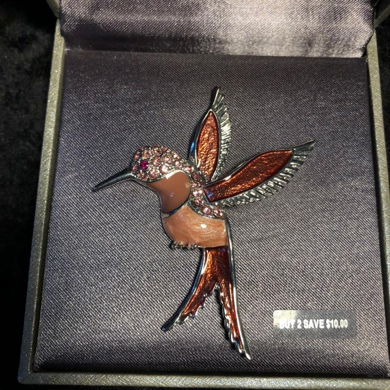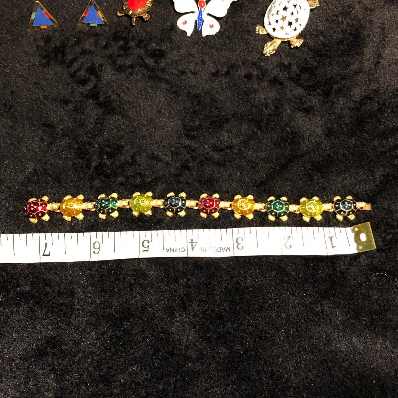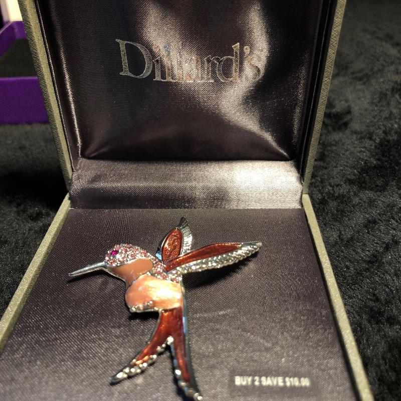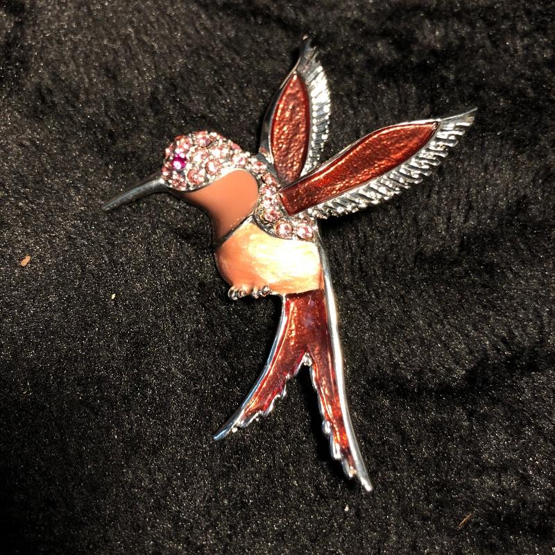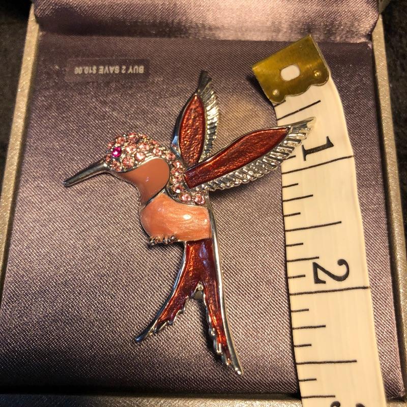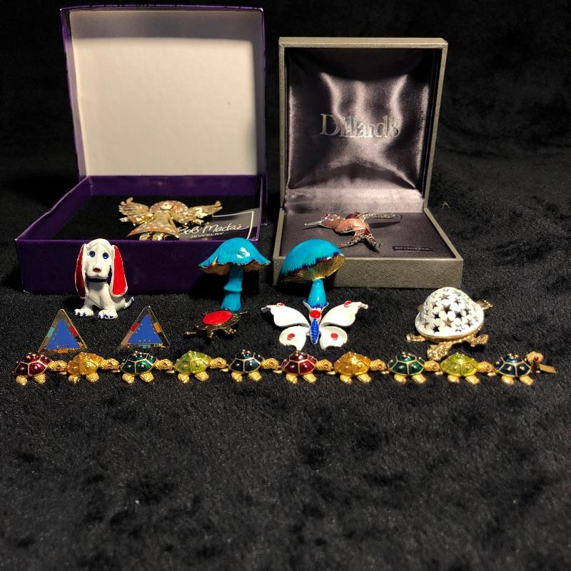 Lovely assortment of pins, earrings and a bracelet. The turtle bracelet is marked KJL and has sparkly turtles in red, greens and blue. The white butterfly and the white dog are marked SAO. A stunning hummingbird pin from Dillard’s, a Bob Mackie pin and a pair of Laurel Burch earrings