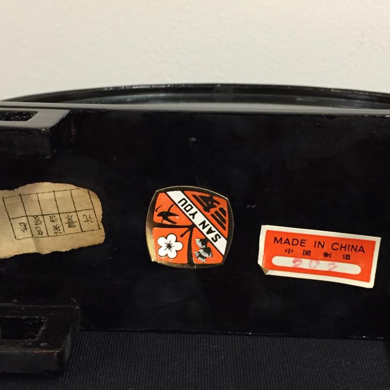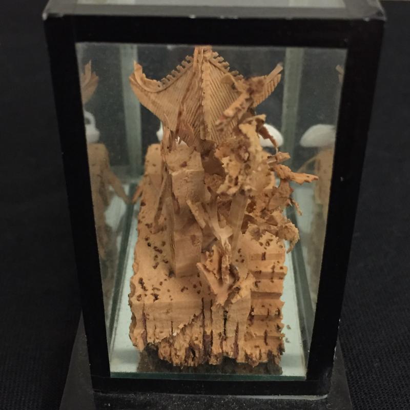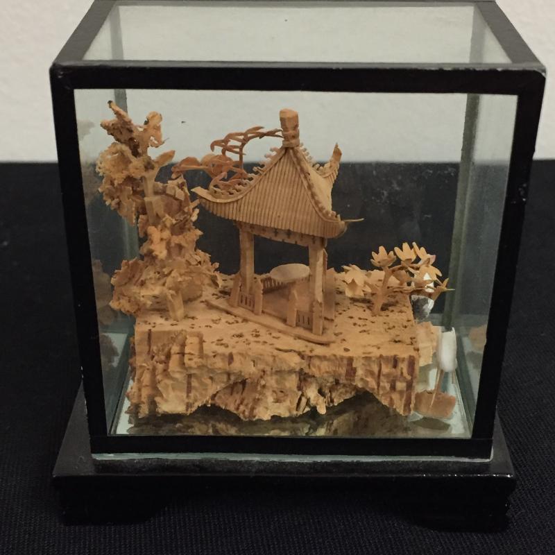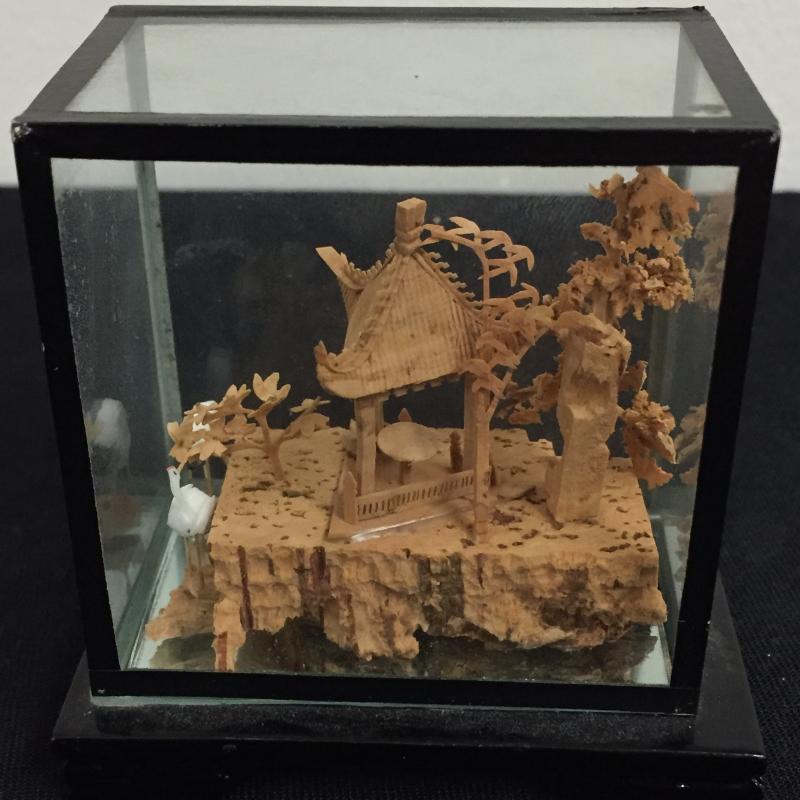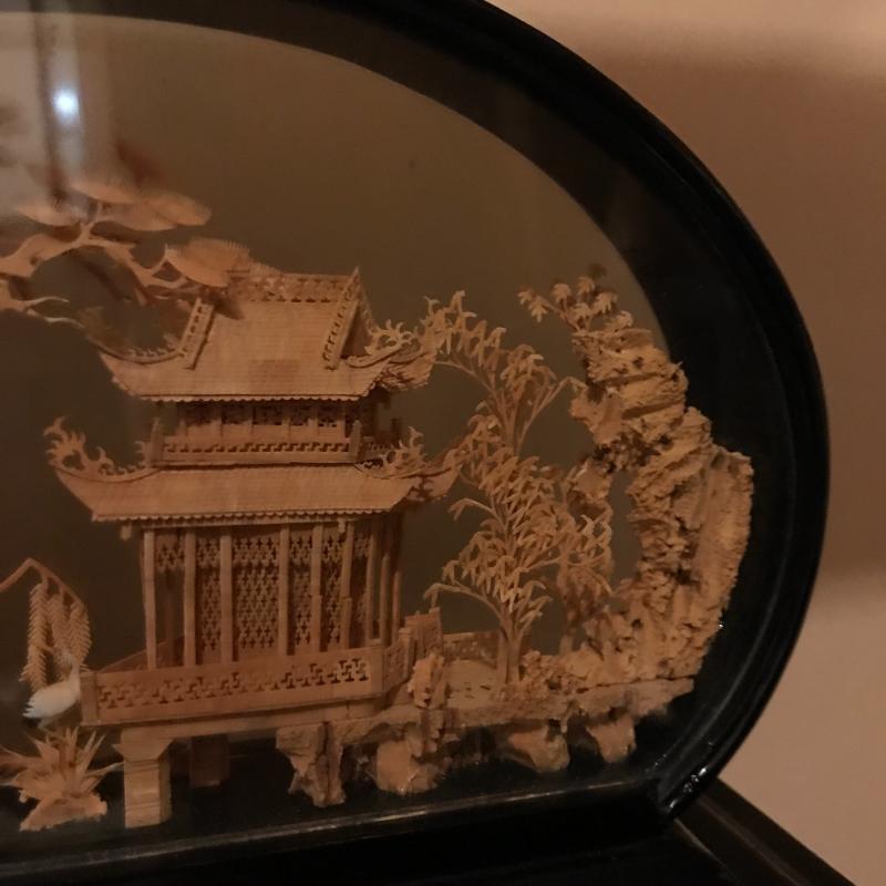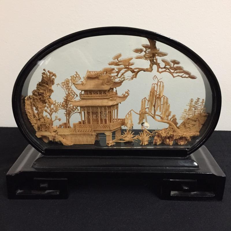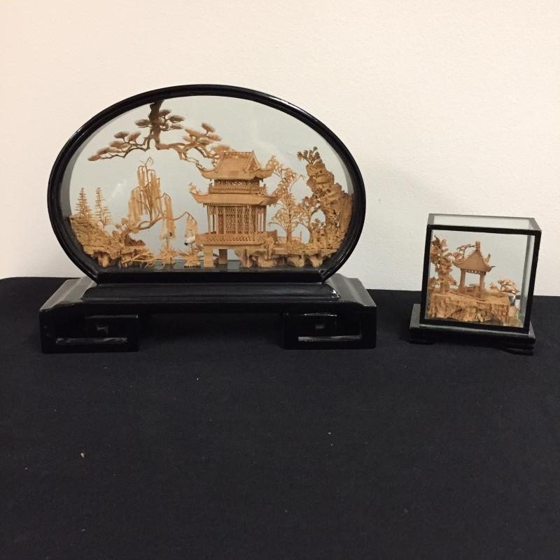 Glass Enclosed Intricately Carved Asian Wood Art. Such amazing details and talent in this art. Largest oval is 6" tall and stands on black lacquer finished stand. Lot also includes a 18" Geisha Doll made of fabric. Shipping Available