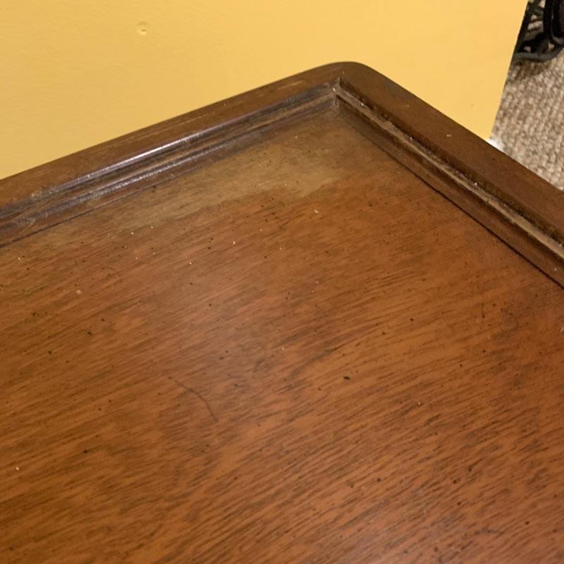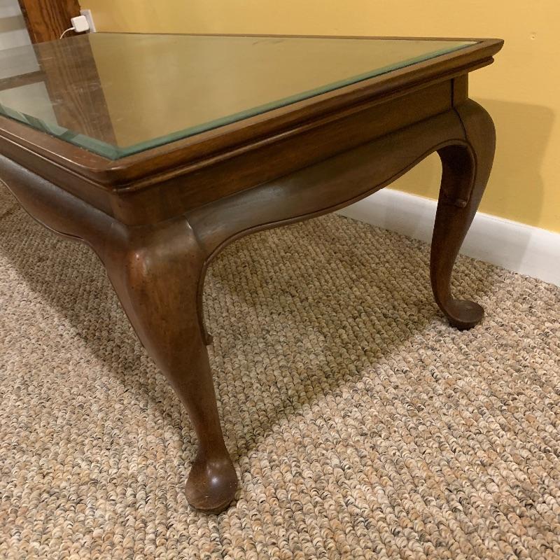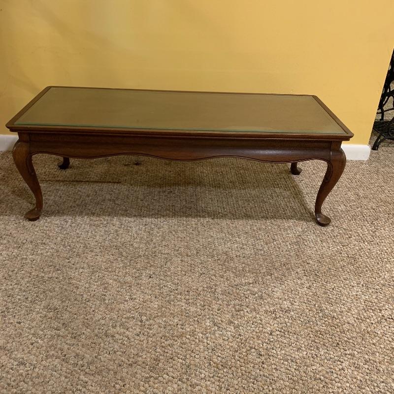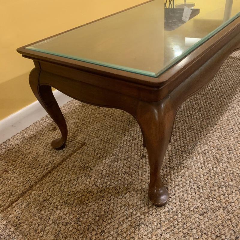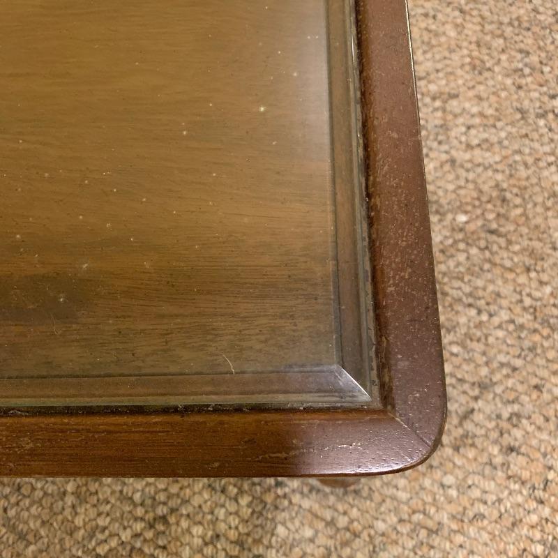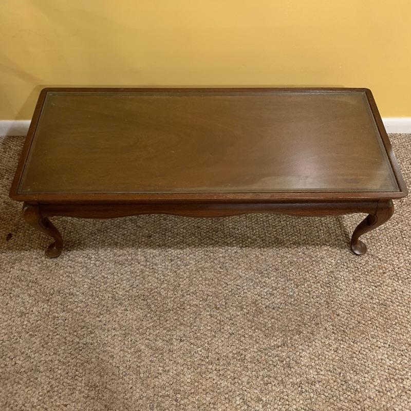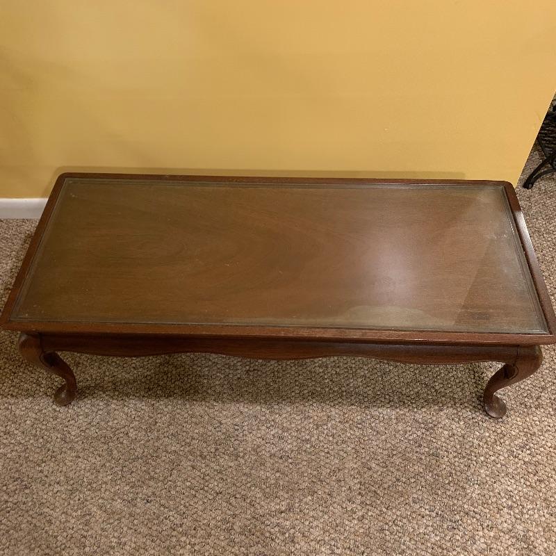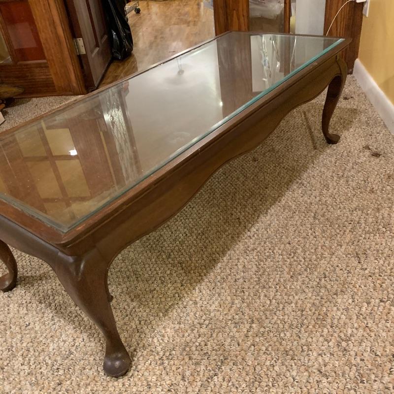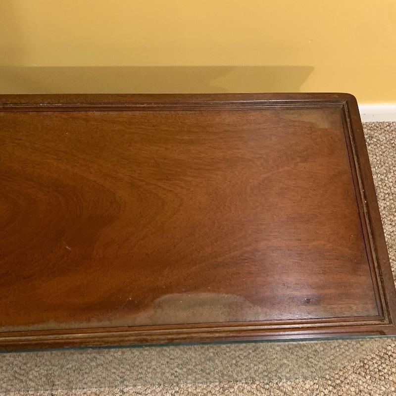 This all wood coffee table is a nice elegant piece. Moisture has gotten under the glass and stained the wood in parts but it could be a great repaint or stain job to restore. Its a great size and nice shape. Unit measures 48” x20” x16”. Local pick up only.