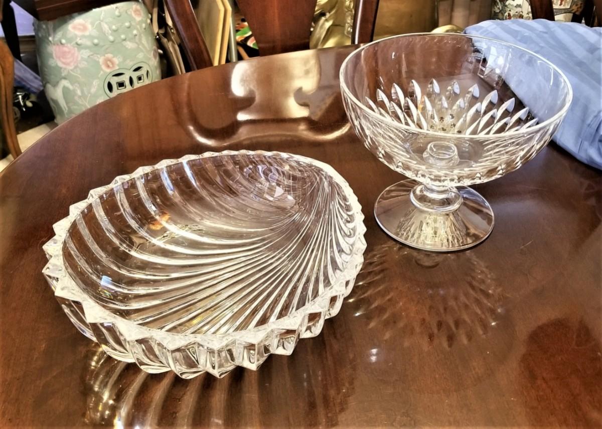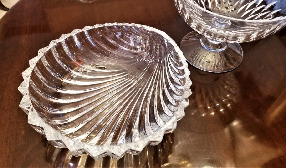 2 very pretty crystal bowls - Shell is HEAVY and measures 11" across, 3.5" tall. Pedestal bowl is 7" tall and 9.25" across. Both in good condition. Unsigned.