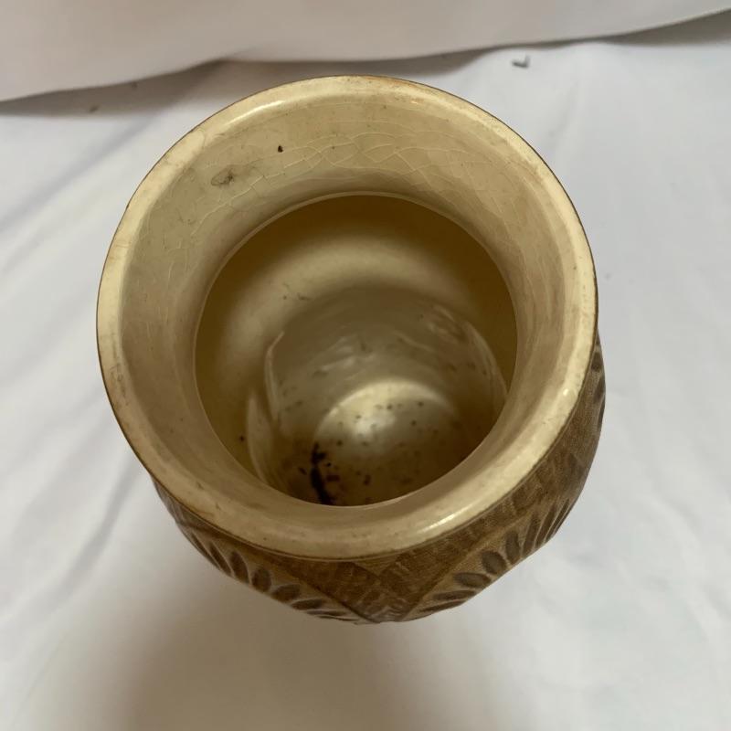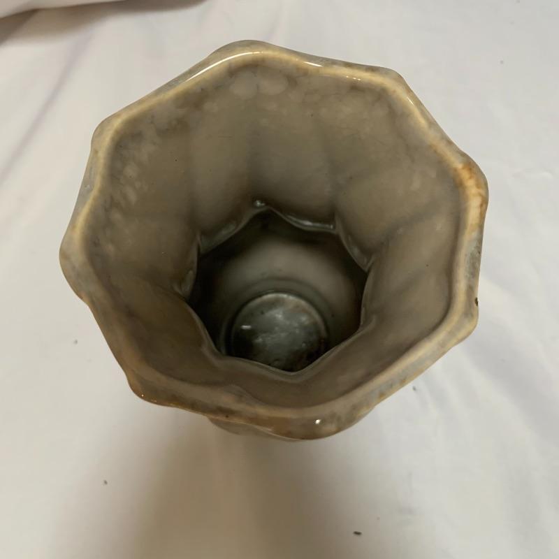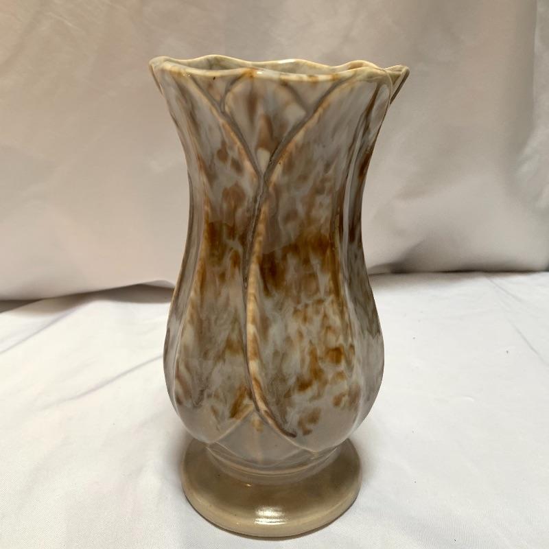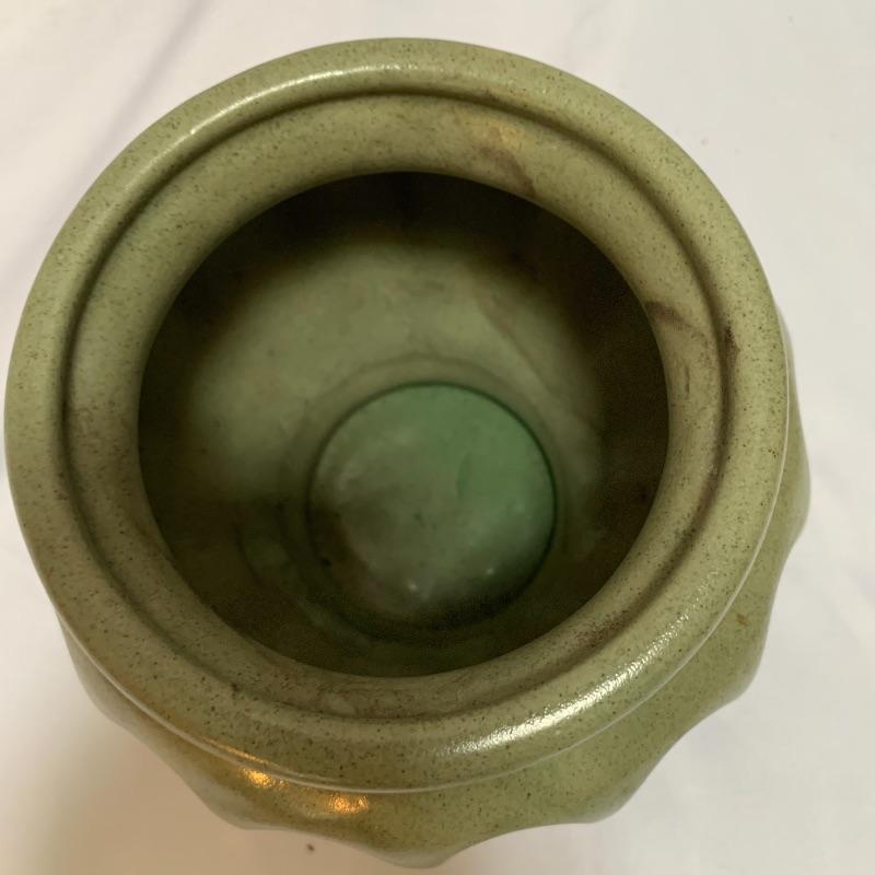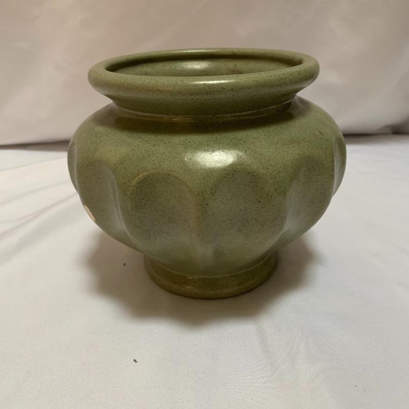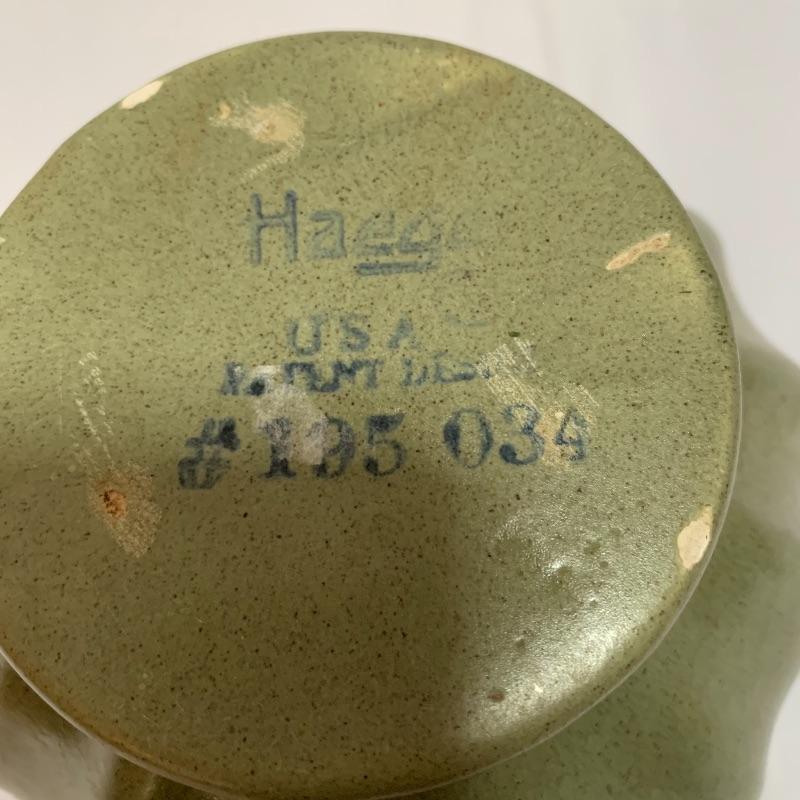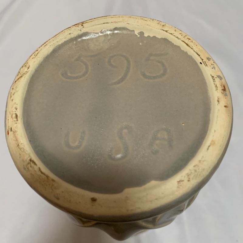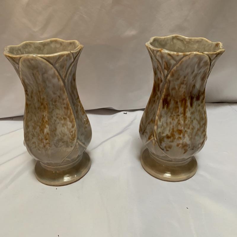 This lot includes a pair of McCoy vases, one brown McCoy vase, and one green Haeger vase / pot. The pair of McCoy vases are numbered. The tan McCoy vase has engravings on it and has been numbered 820. The green Haeger vase has a small chip on the side and a couple chips on the bottom (see photos). The largest vase (tan McCoy) measures about 9 in tall. Shipping available.