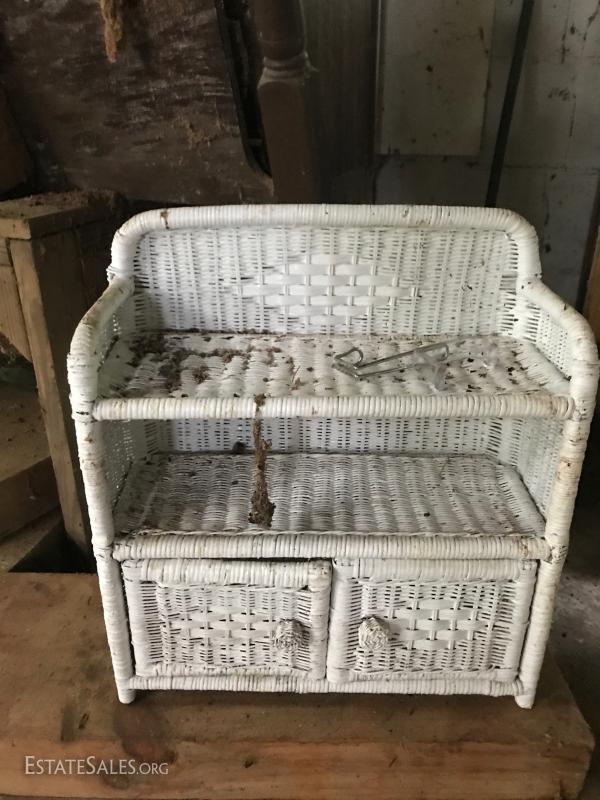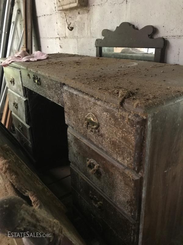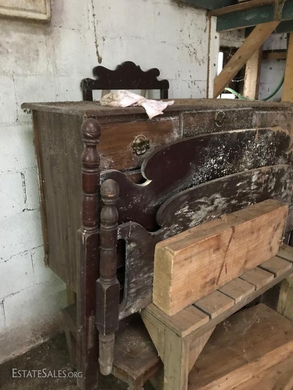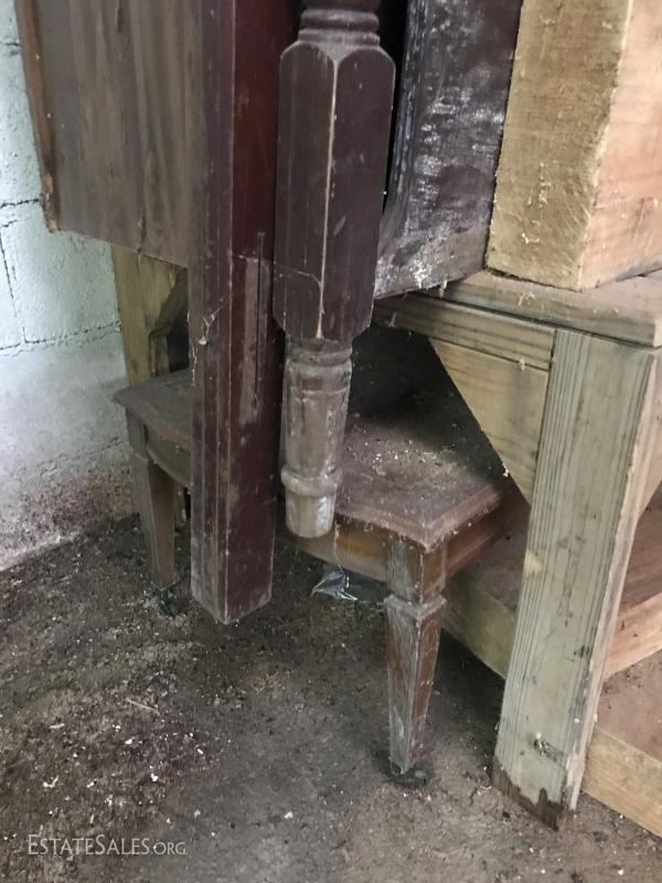 This furniture was found in the workshop. It's moldy but could be refinished. Bed is a double. Dressing table with mirror is 54"l x 20"w x 29"h. Coffee table 42" x 21" x 15". Raw wood table 36"l x 36"w x 23"h. Wicker piece is 19"l x 8"w x 20.5" h
