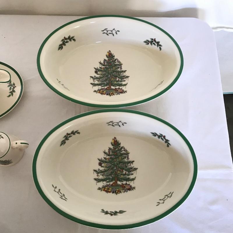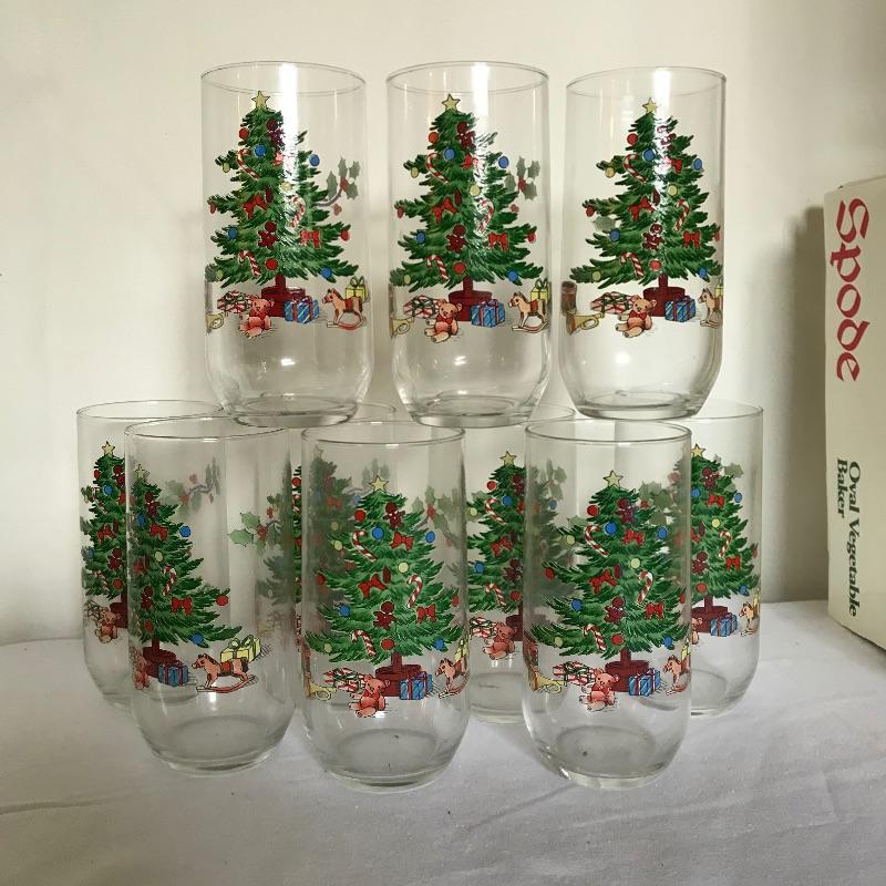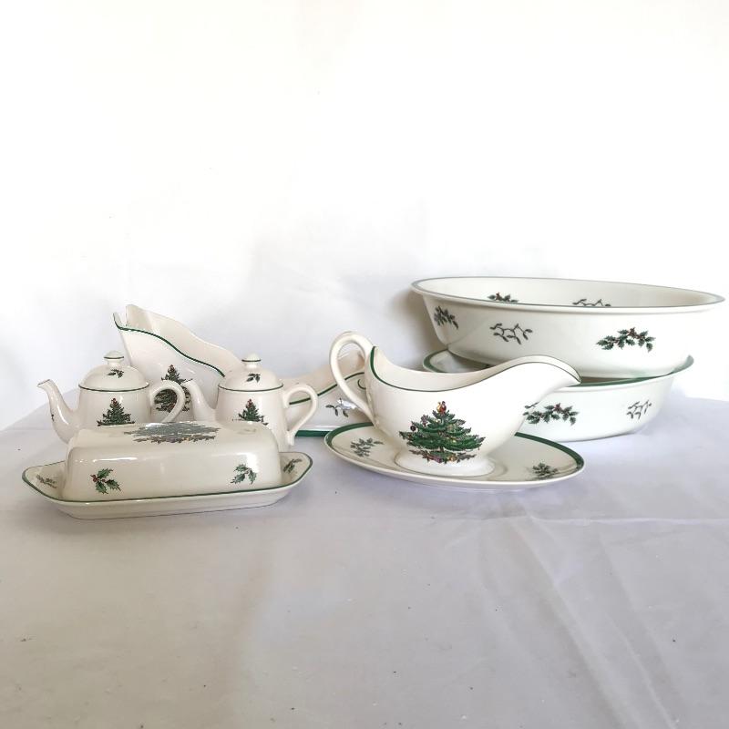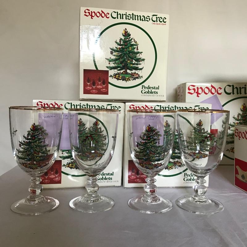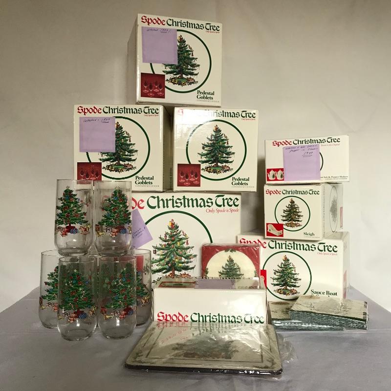 “˜Tis the season! Make you holiday dinners extra special this year with these Spode Christmas Tree serving dishes. Lot includes one trivet and ten glasses with no known markings and a similar theme as the Spode collection. Three unopened Spode cocktail napkin sets (72 total napkins) match the dishes. Spode dishes are all in original boxes and include twelve gold rimmed pedestal goblets, teapot salt & pepper shakers, sauce boat with saucer, sleigh and two 12.5” x 9” x 3” oval vegetable bakers. Lot includes boxes, dishes are not padded. See photos.