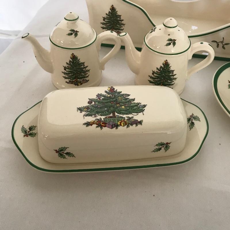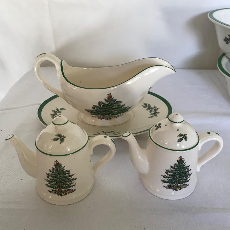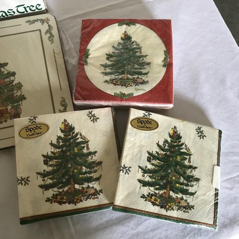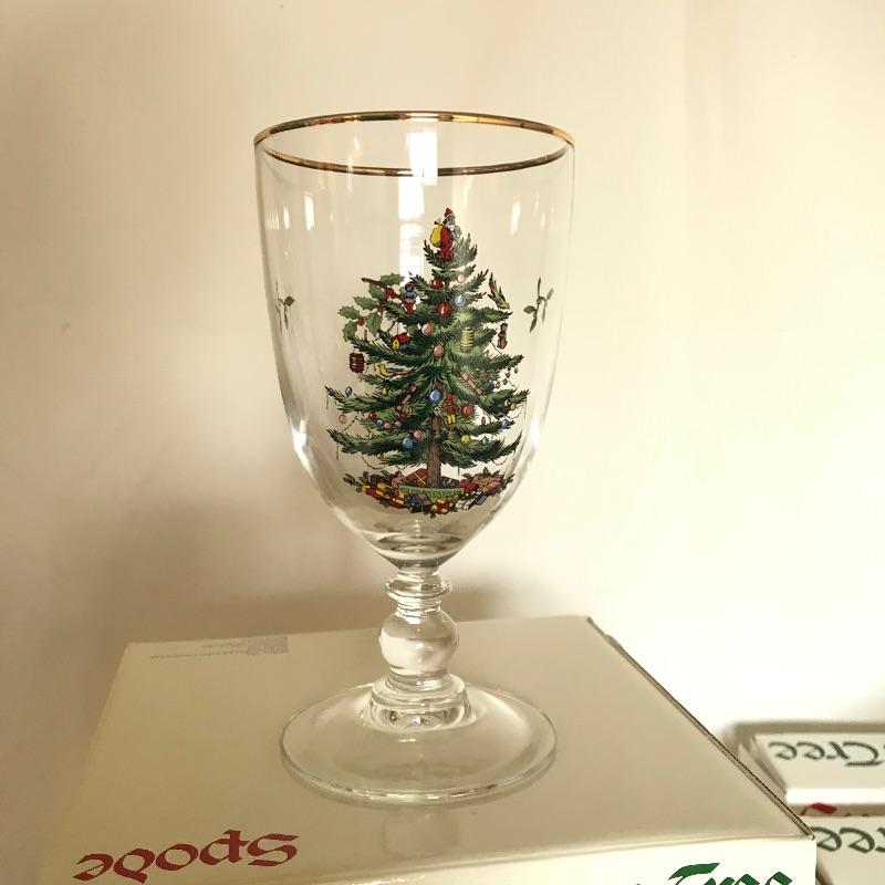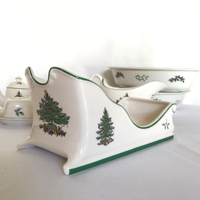 “˜Tis the season! Make you holiday dinners extra special this year with these Spode Christmas Tree serving dishes. Lot includes one trivet and ten glasses with no known markings and a similar theme as the Spode collection. Three unopened Spode cocktail napkin sets (72 total napkins) match the dishes. Spode dishes are all in original boxes and include twelve gold rimmed pedestal goblets, teapot salt & pepper shakers, sauce boat with saucer, sleigh and two 12.5” x 9” x 3” oval vegetable bakers. Lot includes boxes, dishes are not padded. See photos.