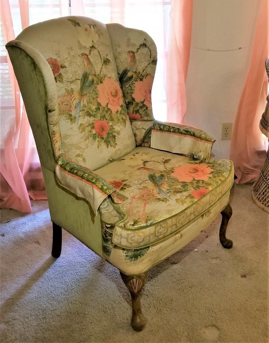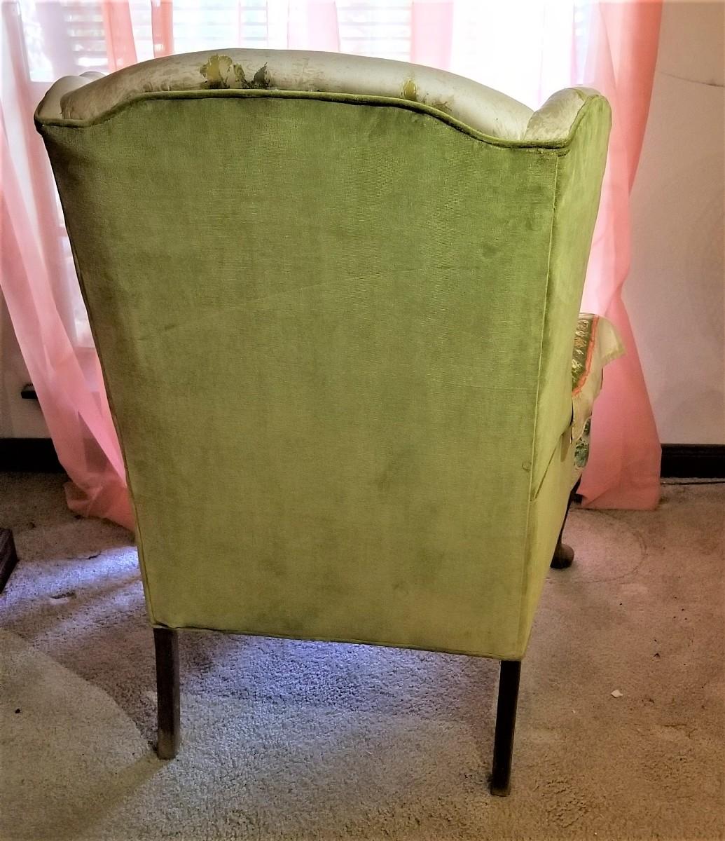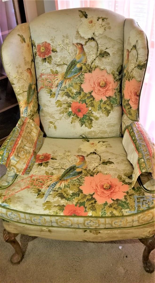 Vintage Winged Back armchair - Bird of Paradise motif - 32" deep, 31" across, 44" tall - seafoam velveteen on back and sides. Made by PEM-KAY furniture - a good mid-century maker. Queen Anne style legs - note: there is evidence of an old, but decent repair to one leg. Chair is sturdy, comfy, and gently used.