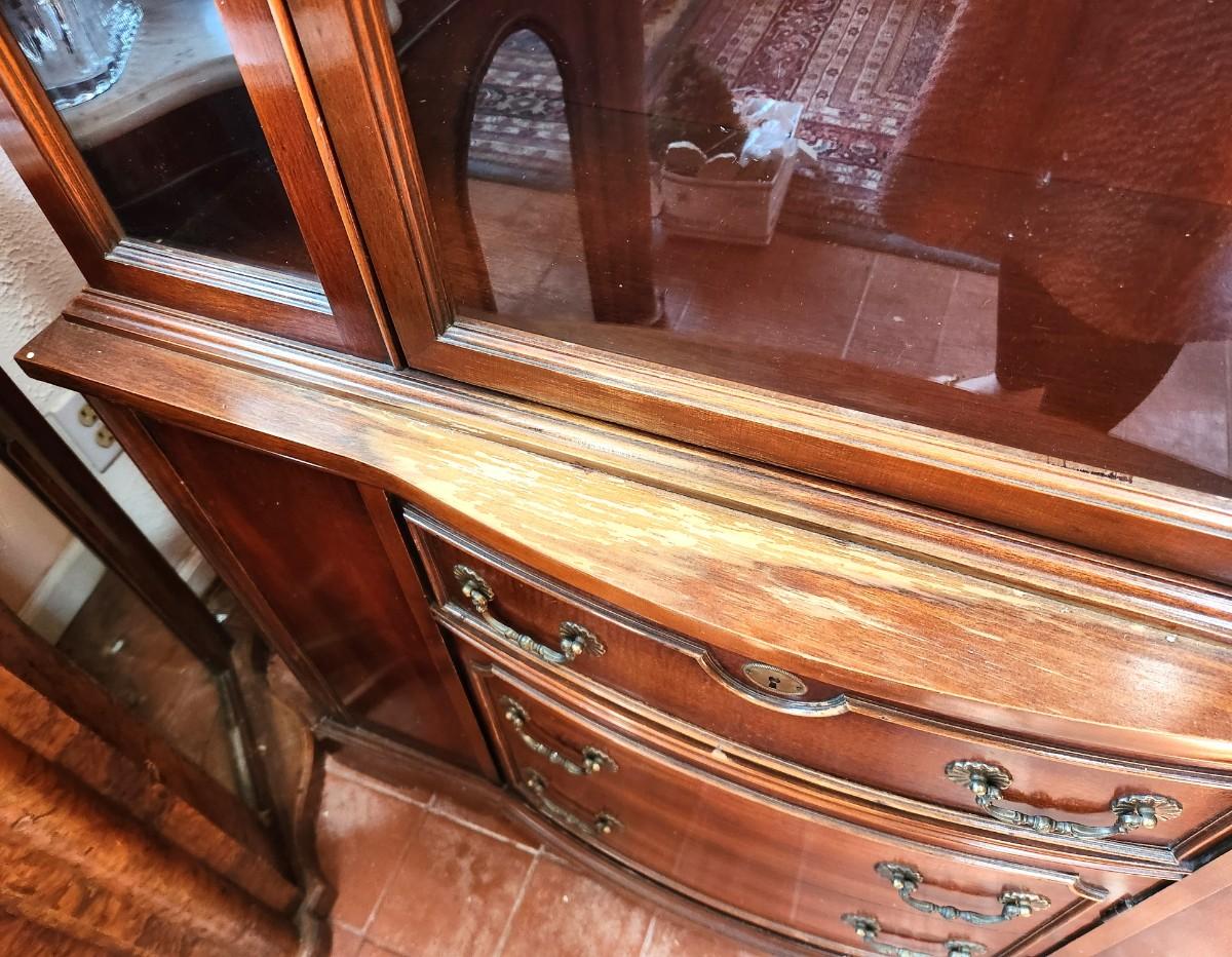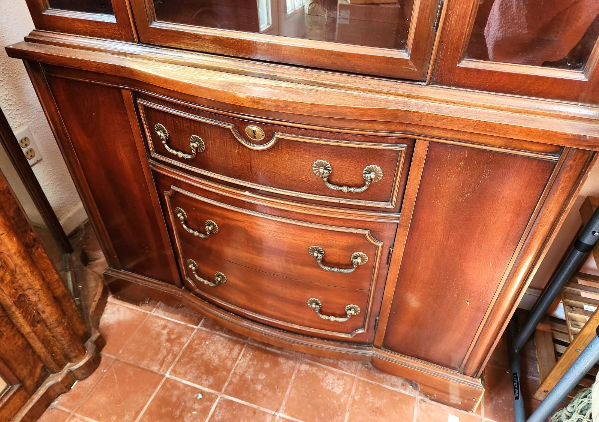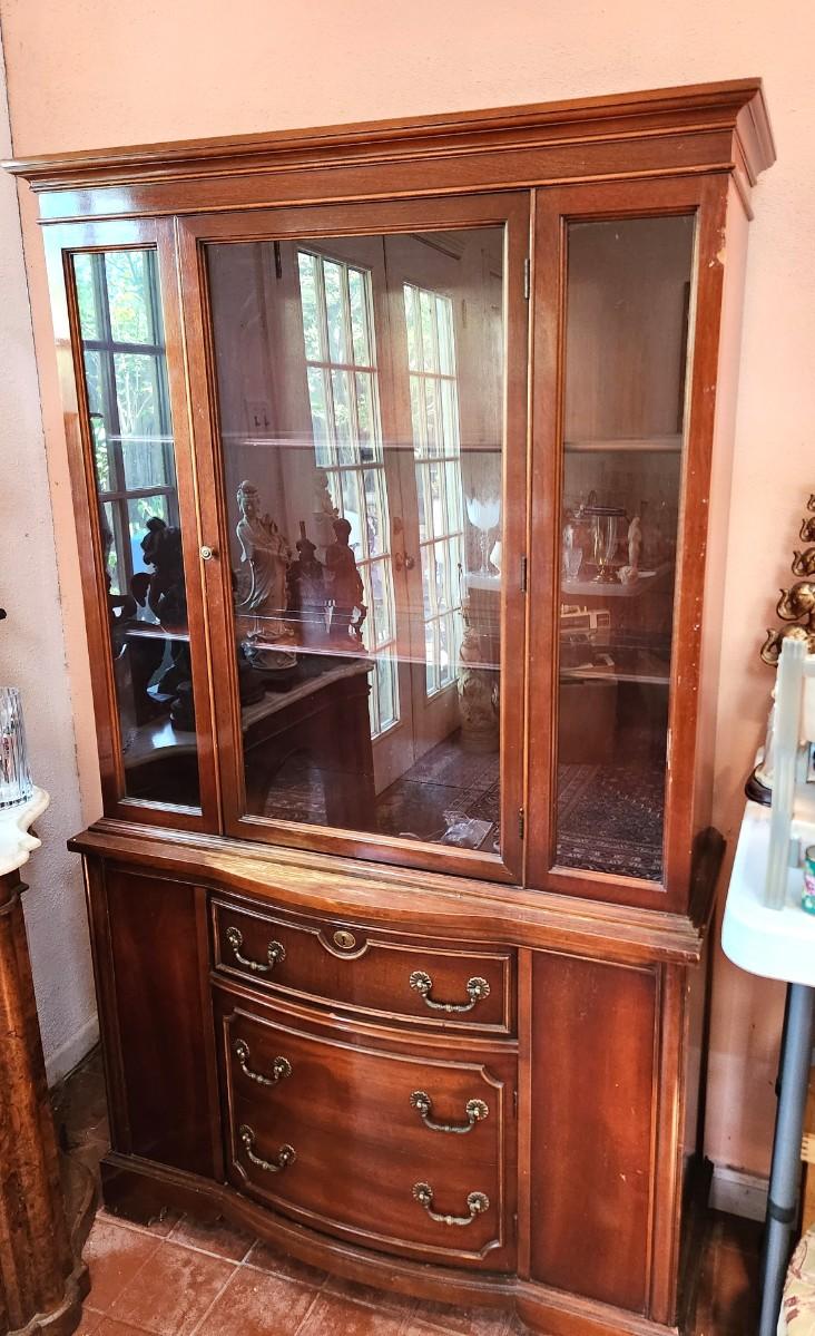 Vintage China Cabinet - 1 drawer, 2 shelves, some wear. Veneer is loose at the bottom - 1960's. 41" across, 14.5" deep, 70.5" tall. With a little love, this would be a nice storage/display cabinet.
