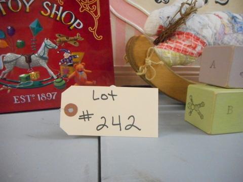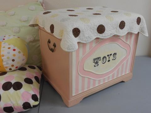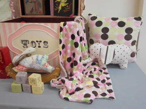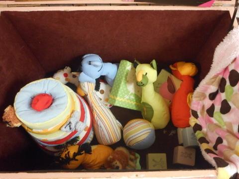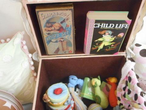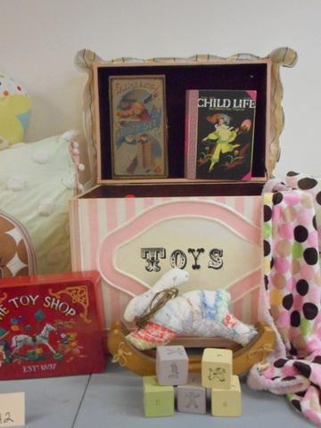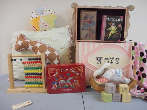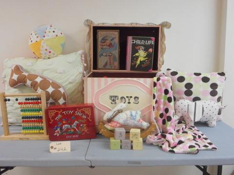 Lot 242 - Vintage Wooden Toy Box with Toys, Blankies, Pillows