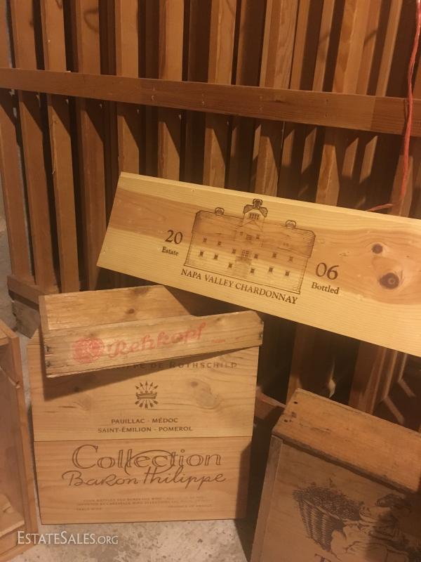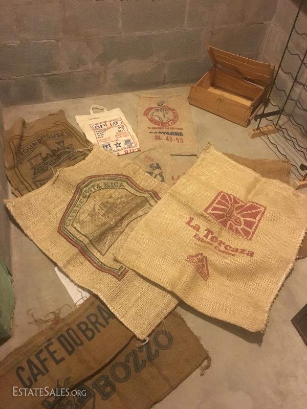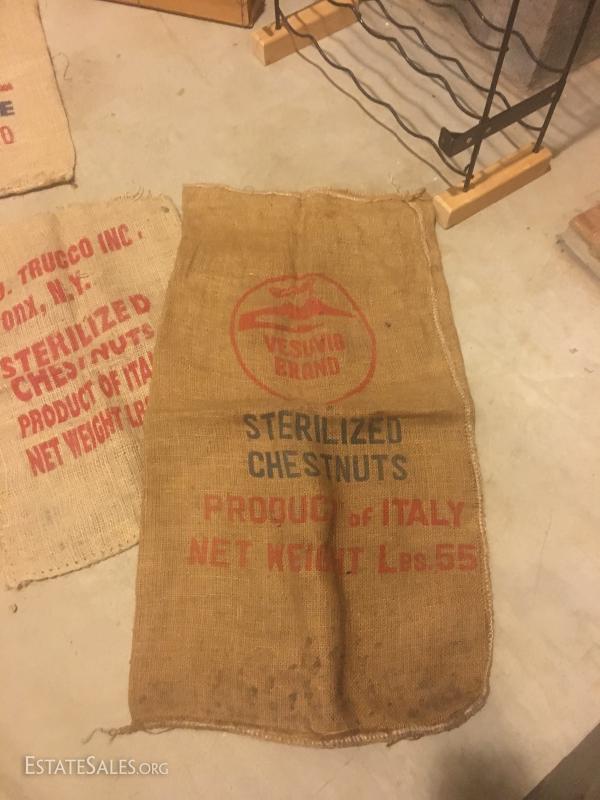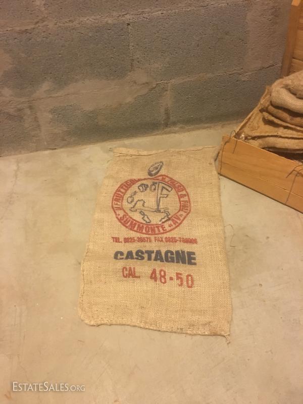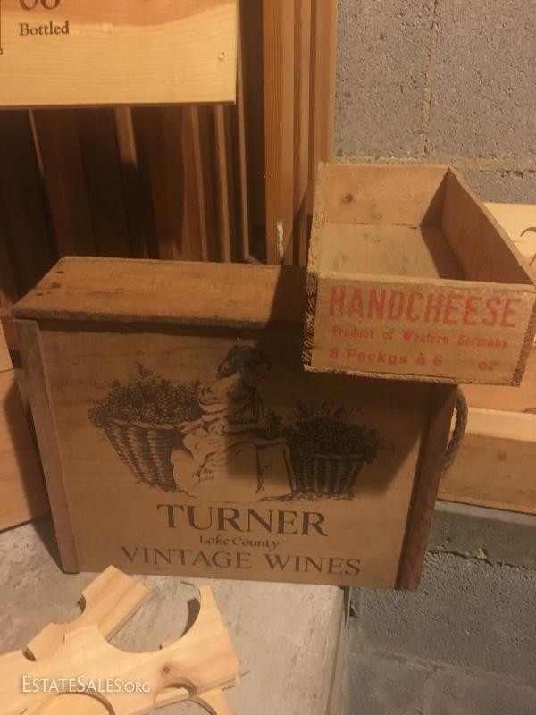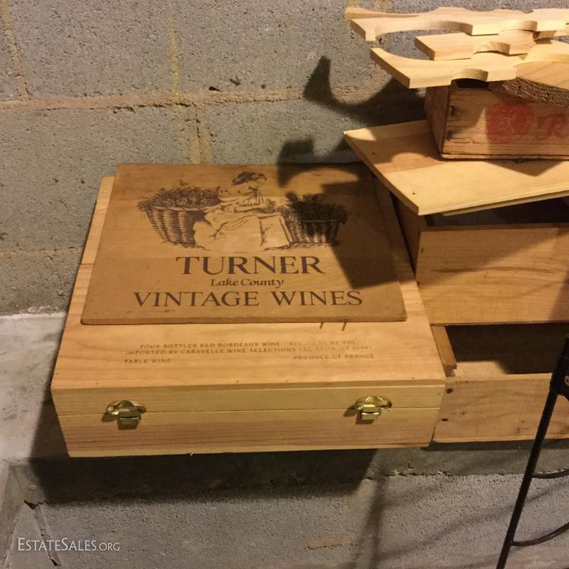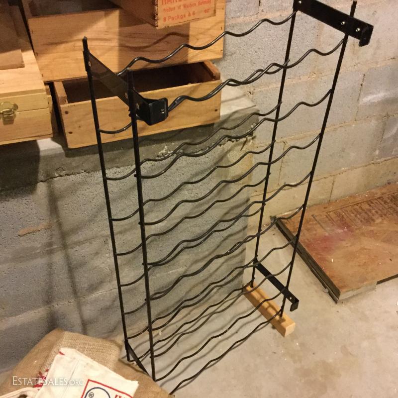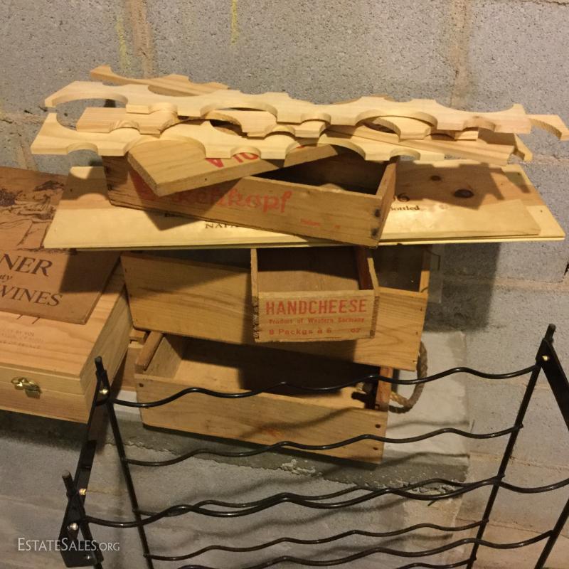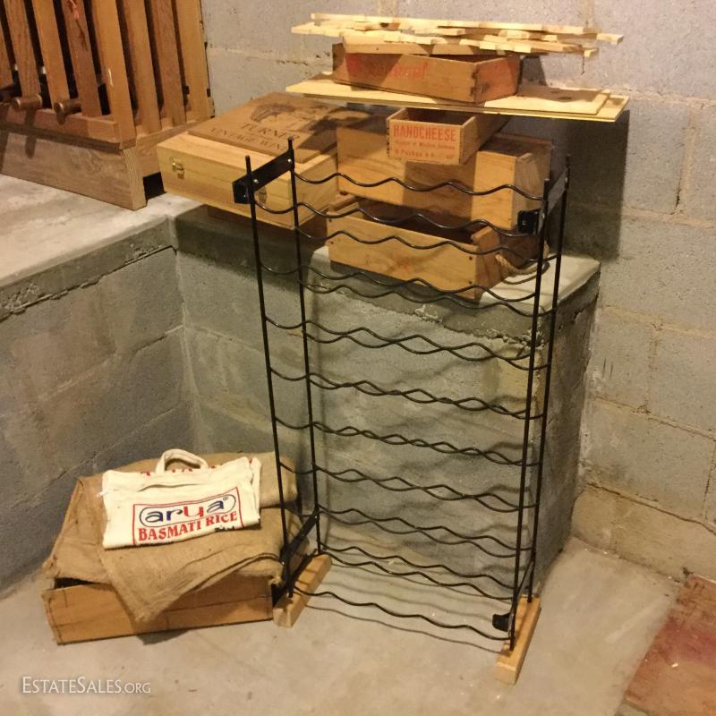 Metal wine rack is mountable and measures 36"hx18"w x 8"w. Wood boxes and lids have logos for wine and cheese. Sacks vary in size and materials. Large wood wine rack is not included in lot. This lot is available for local pick up in Hendersonville, NC only.