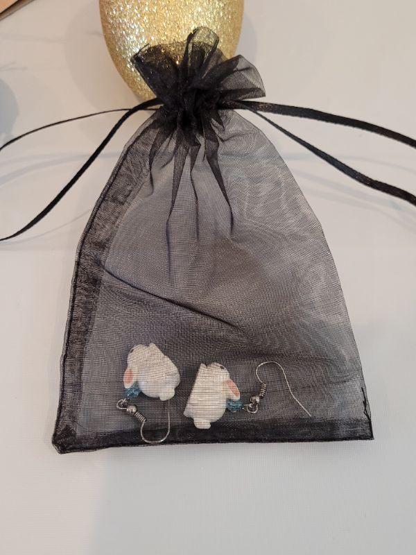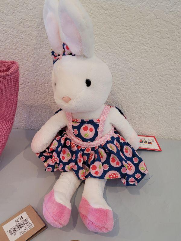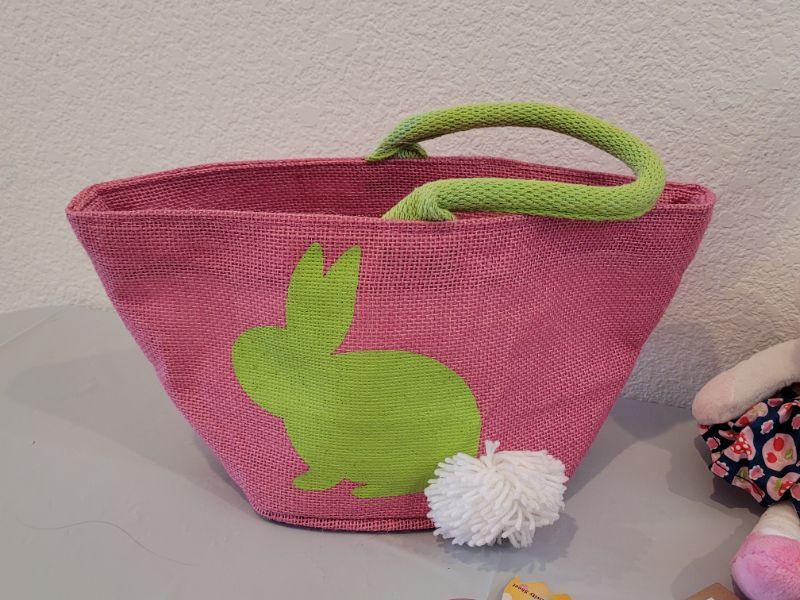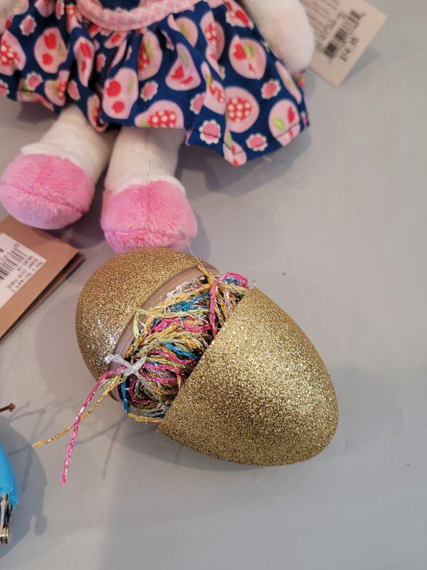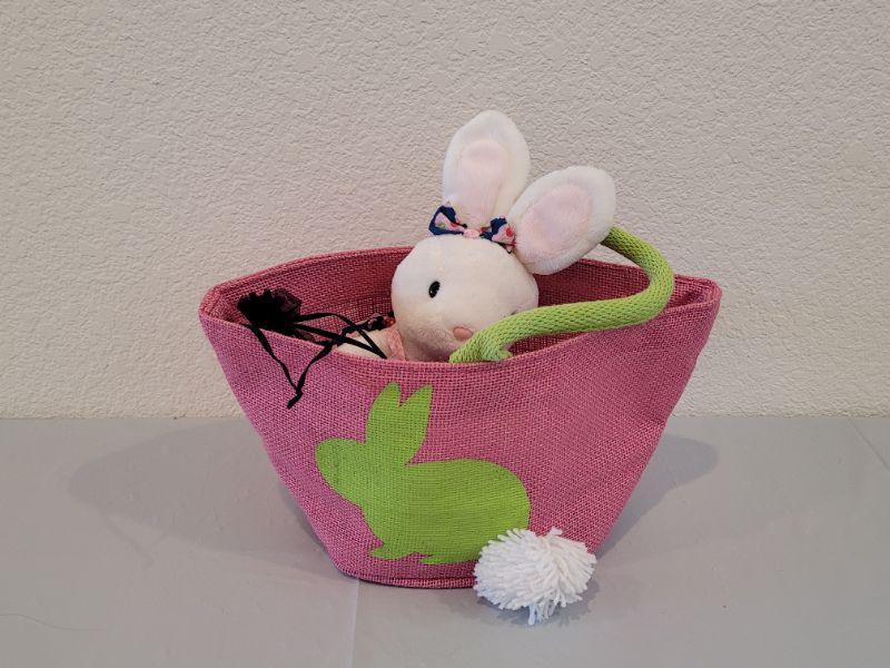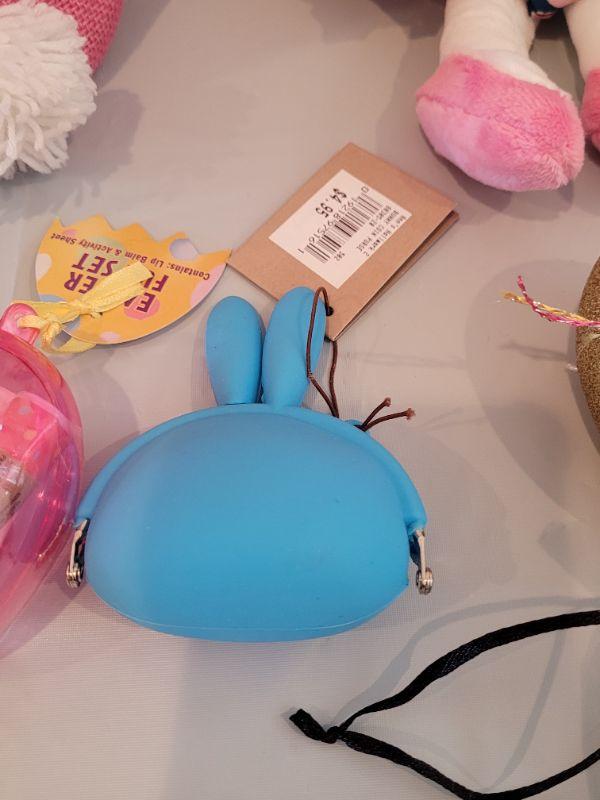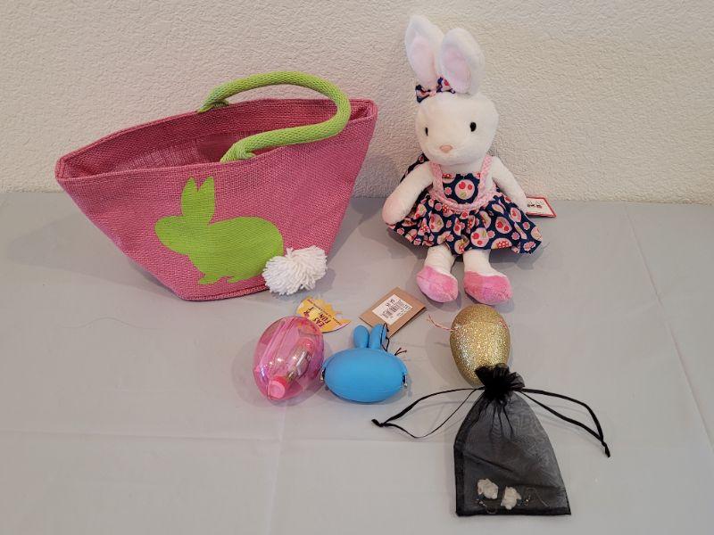 Lot 243: New Hallmark Bunny Purse Basket filled with Hallmark Bunny Earrings, Bunny Coin Purse, Lip Balm, Golden Egg with a Scarf and Douglas Bunny