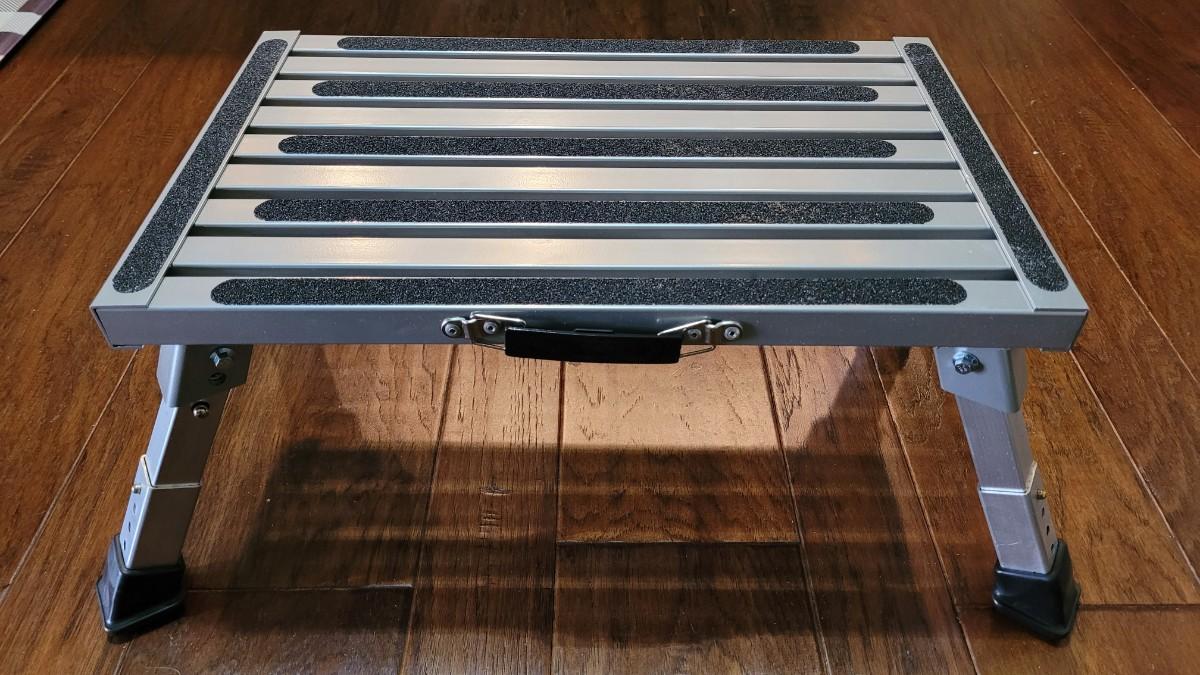 Legs fold flat and there is a handle on the side for easy transport. There is also a nice gripe on the top of the stool that helps with safety.