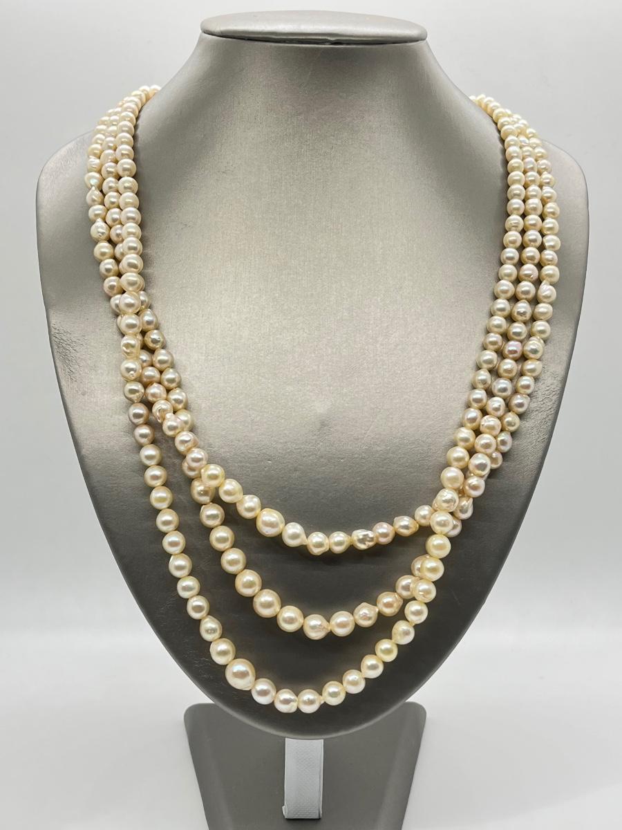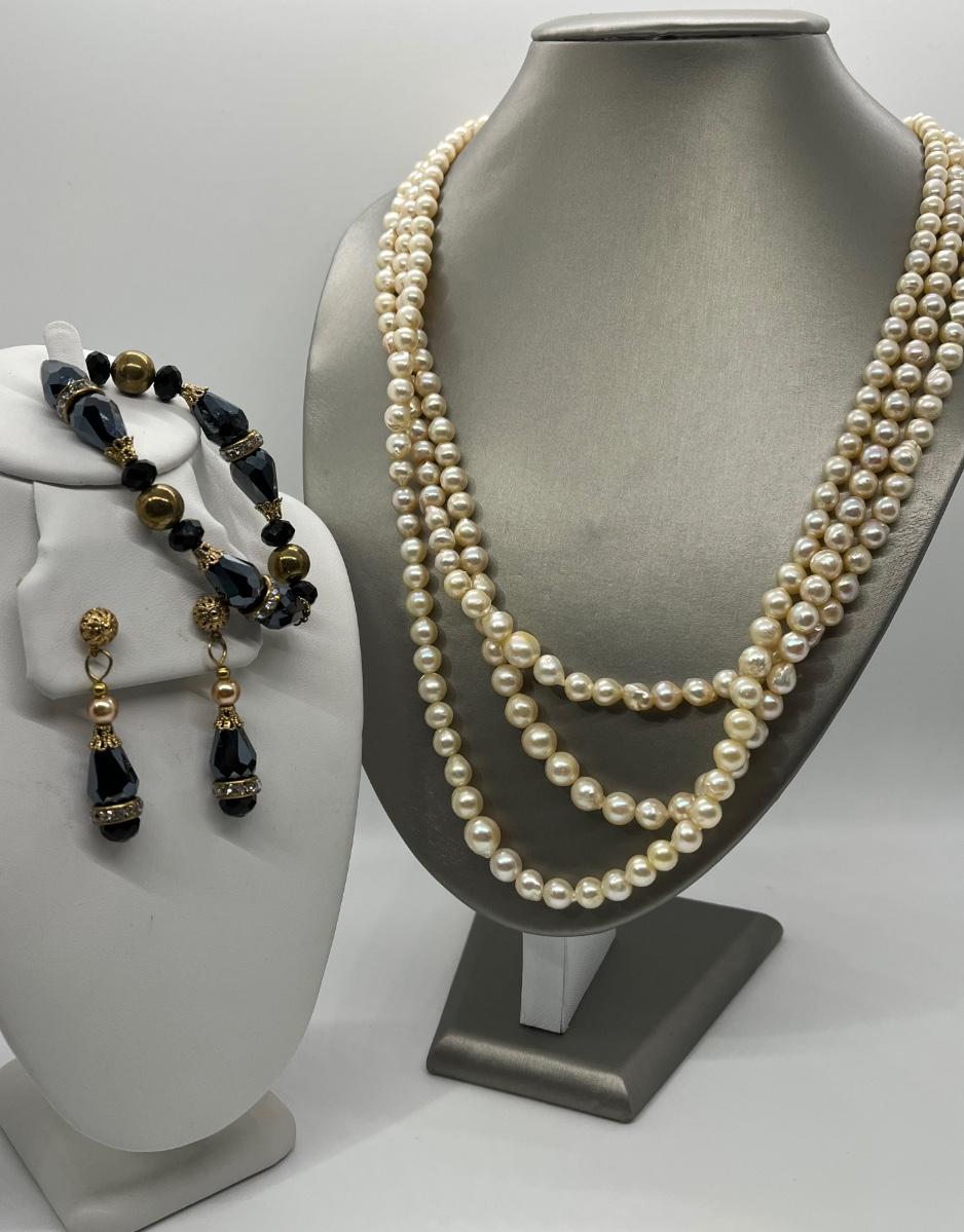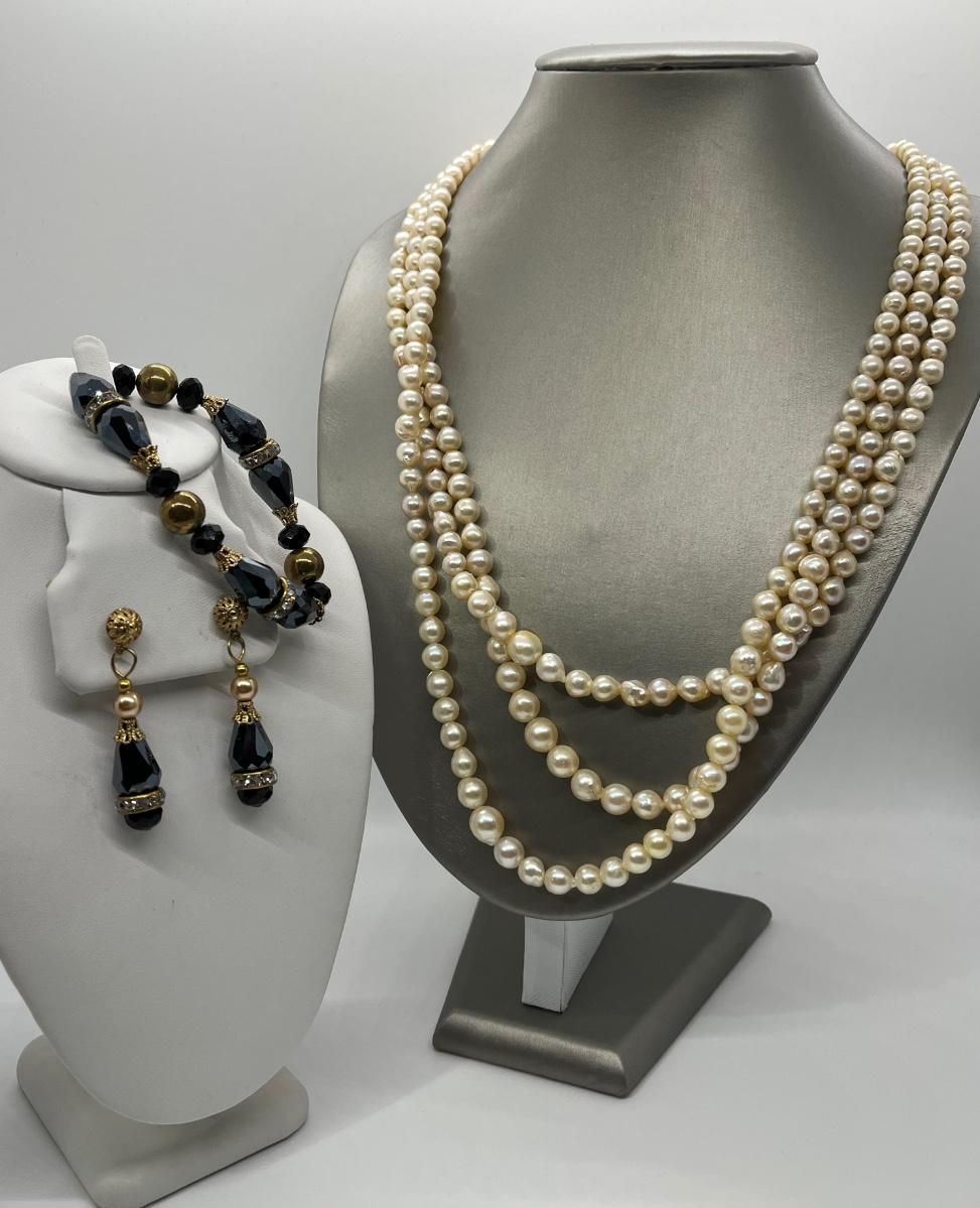 The lovely triple strand necklace is at the longest point 26". Please see all pictures as they are the best representation of the items. The pictures show condition, measurements if taken, and what is included in the lot. Due to the large amount that we photograph and the time frame, we are not always able to take measurements. All items unless noted, are pre-owned and have been used. If you purchased furniture, you must bring help. We do not allow one person to carry large furniture out on their own. Bring help, tools and a truck for the safety of our client’s homes, and your personal safety. Any damages that result to the property including walls, and floors due to moving of the furniture will be charged to the buyer. Company policy. Thank you.