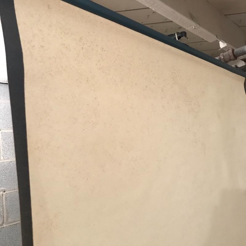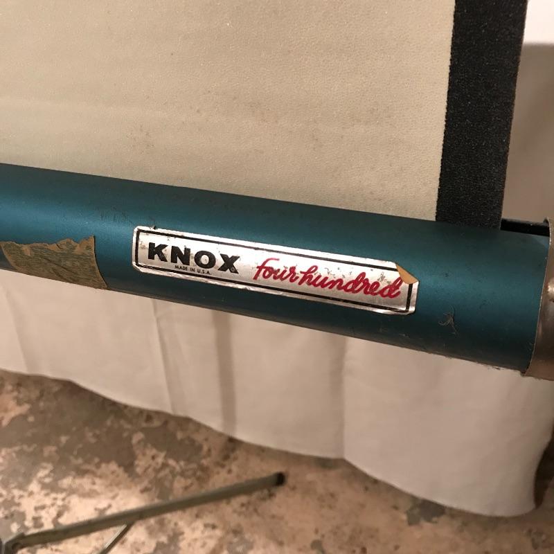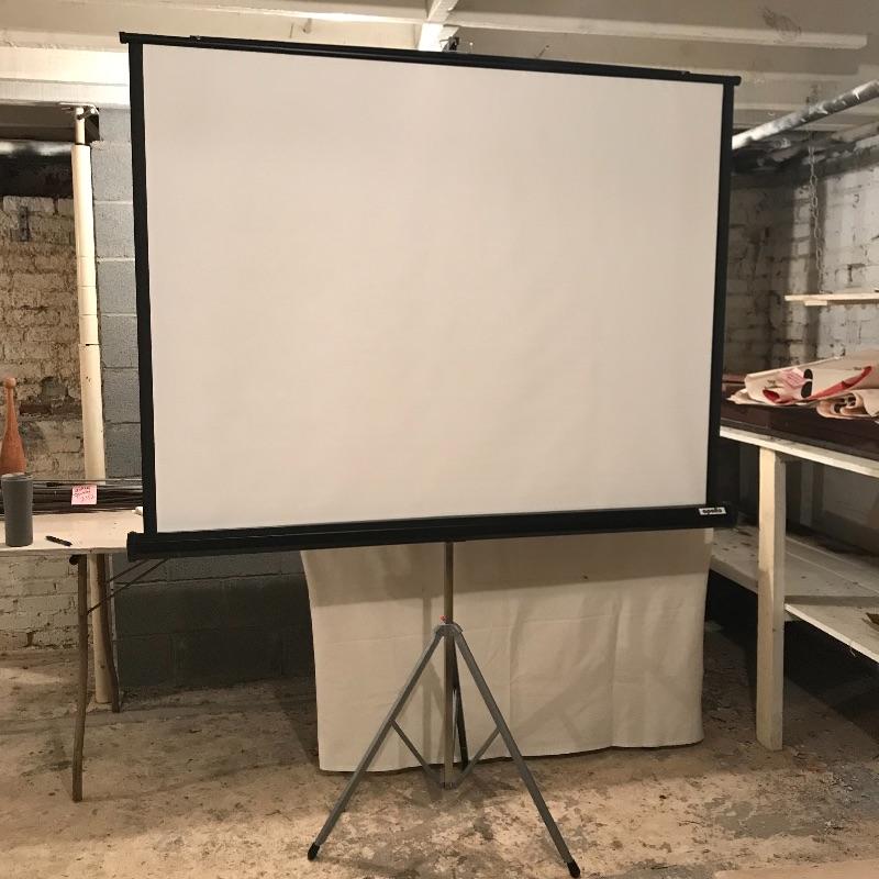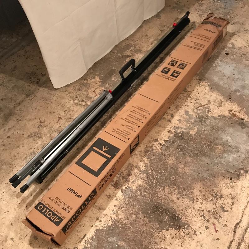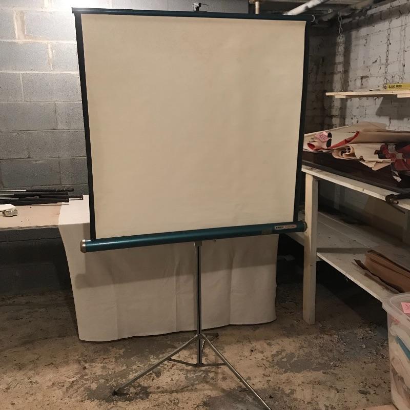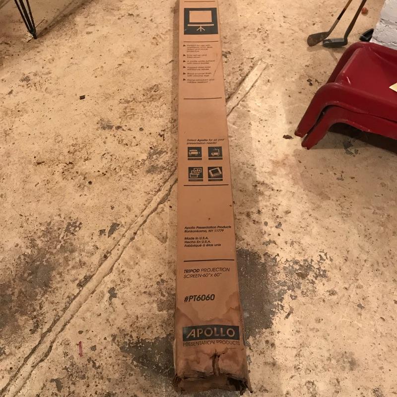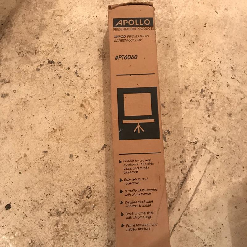 Like new! Apollo 60” x 60” tripod projection screen with original box. Box boasts “Easy set-up and take-down”, “Rugged steel case withstands abuse” and more! See photos. Box has water damage on one end, but screen appears unaffected. Apollo is accompanied by a turquoise Knox four hundred vintage projection screen. Some mildew is present, but screen is intact. Screen appears to be 40” x 38”, manufacturing specs were not located. The aluminum tripod base is a little wobbly, but screen stands alone fine. No shipping.