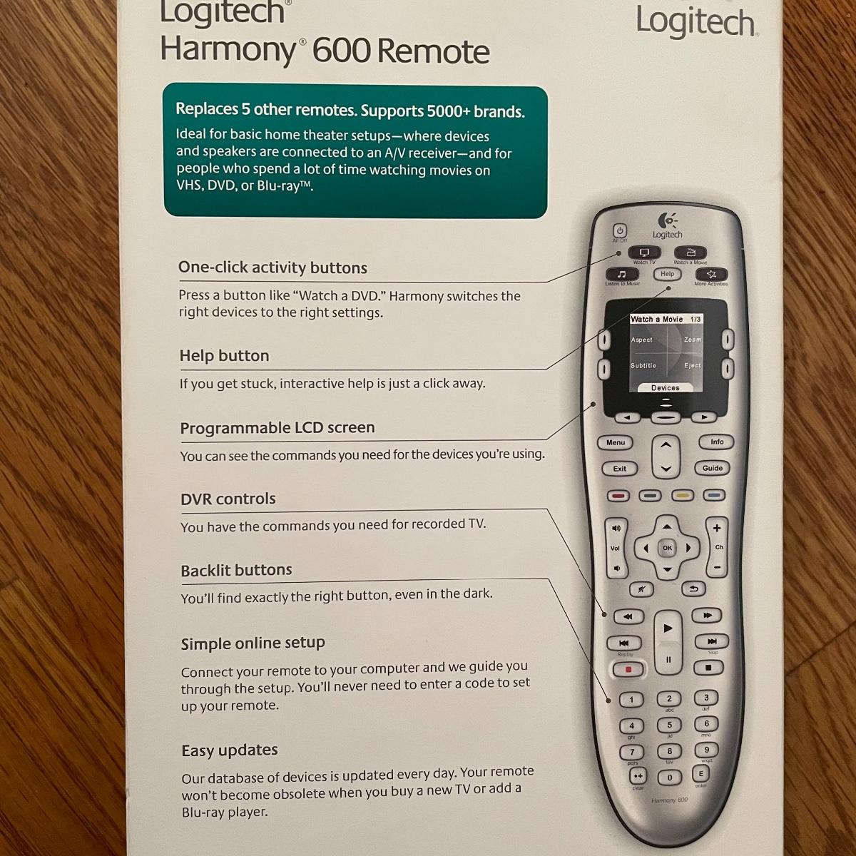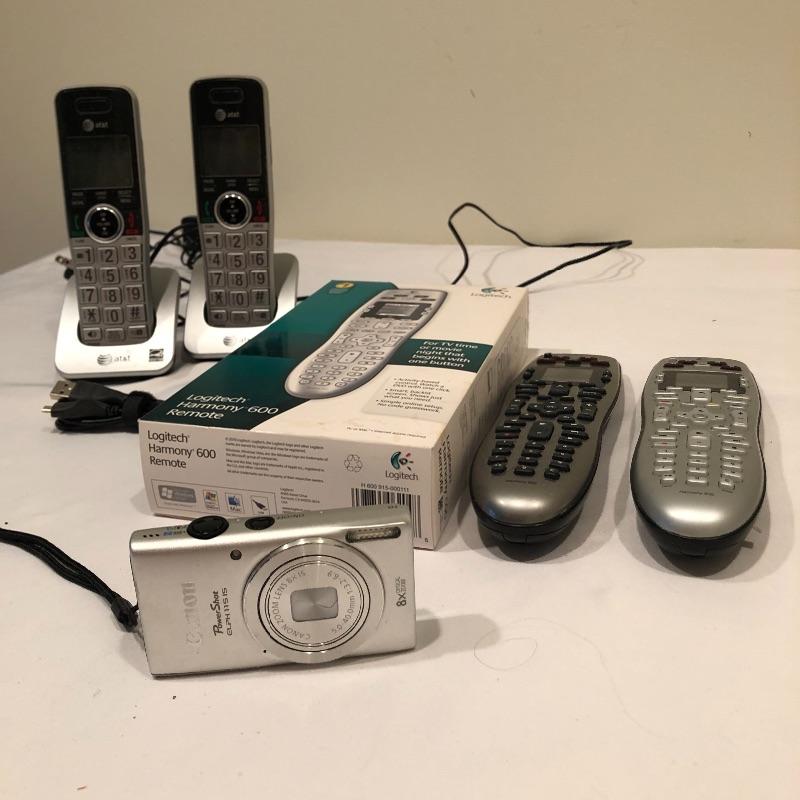 This Canon PowerShot camera has an 8x optical zoom; it comes with just the USB cable and was not tested. Both cordless phones lit up when plugged in. Also included are two Logitech Harmony 600 remote controls. Combine all your gadgets’ remote controls with these handy two remotes.