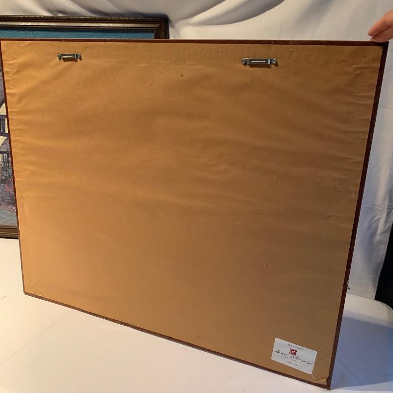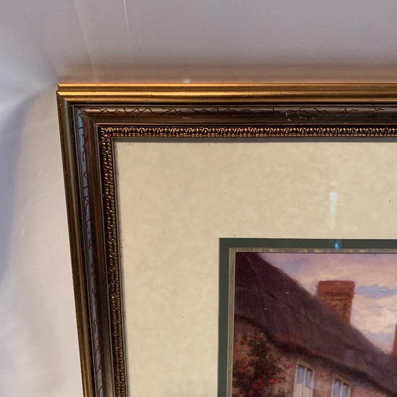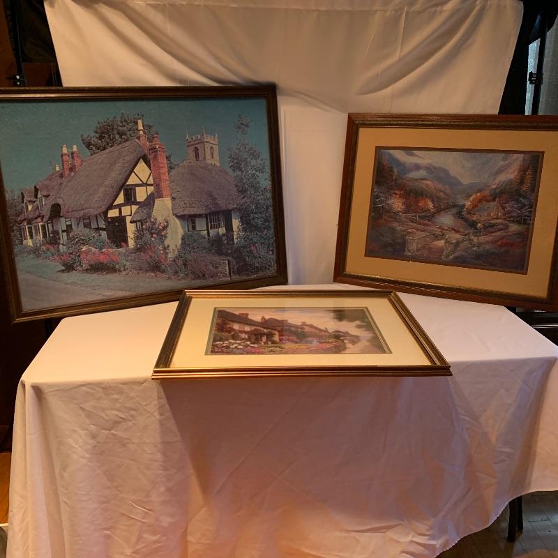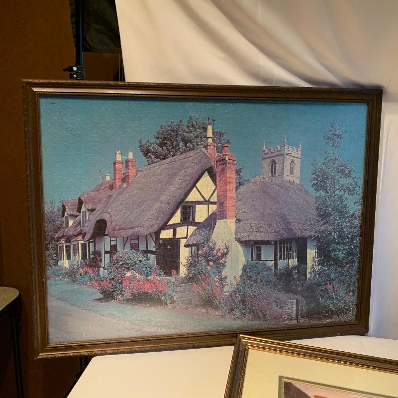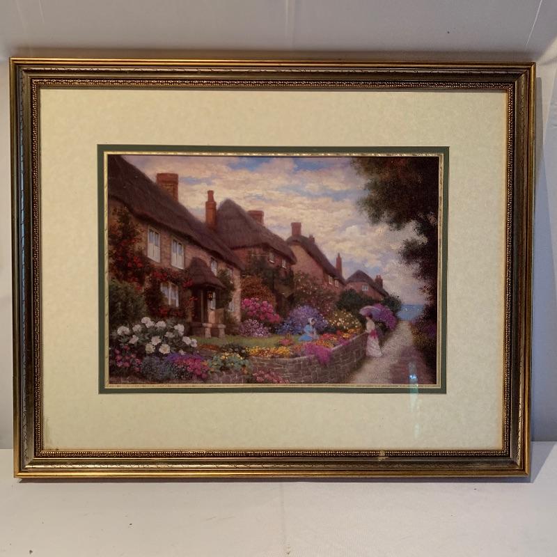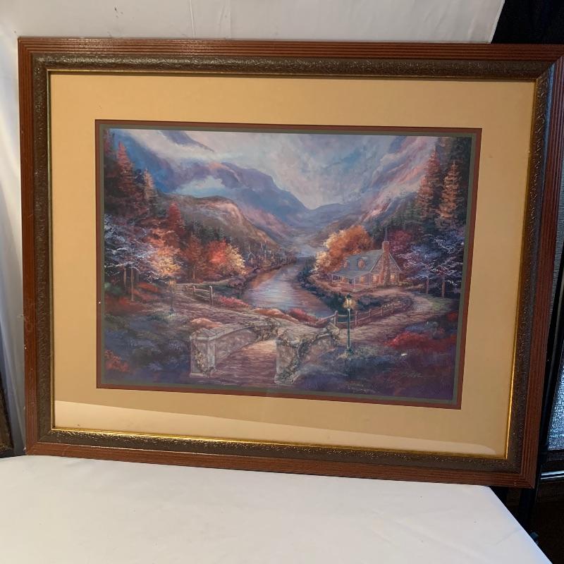 Three nicely framed pieces with a theme of cottage living. The largest one is a framed jigsaw puzzle. The frame measures 39” x29”. The second one is is a gold framed scene with two ladies talking at a stone wall. This piece is triple matted and there is some dirt on the frame that should clean up easily. It measures 30.5” x 24.5”. The last one is mountain scene with a river and sweet bridge. It is also triple matted and has an artist signature of Bazan. This piece measures 31.5”. Local pick up only.