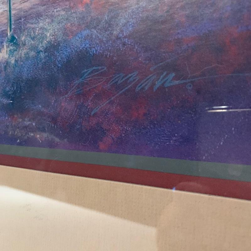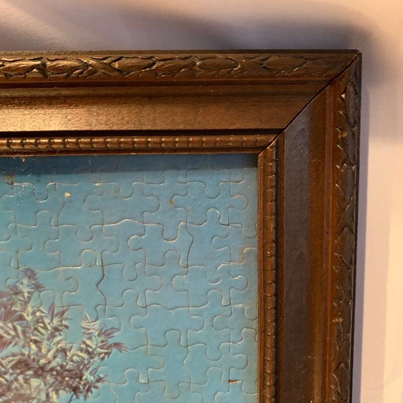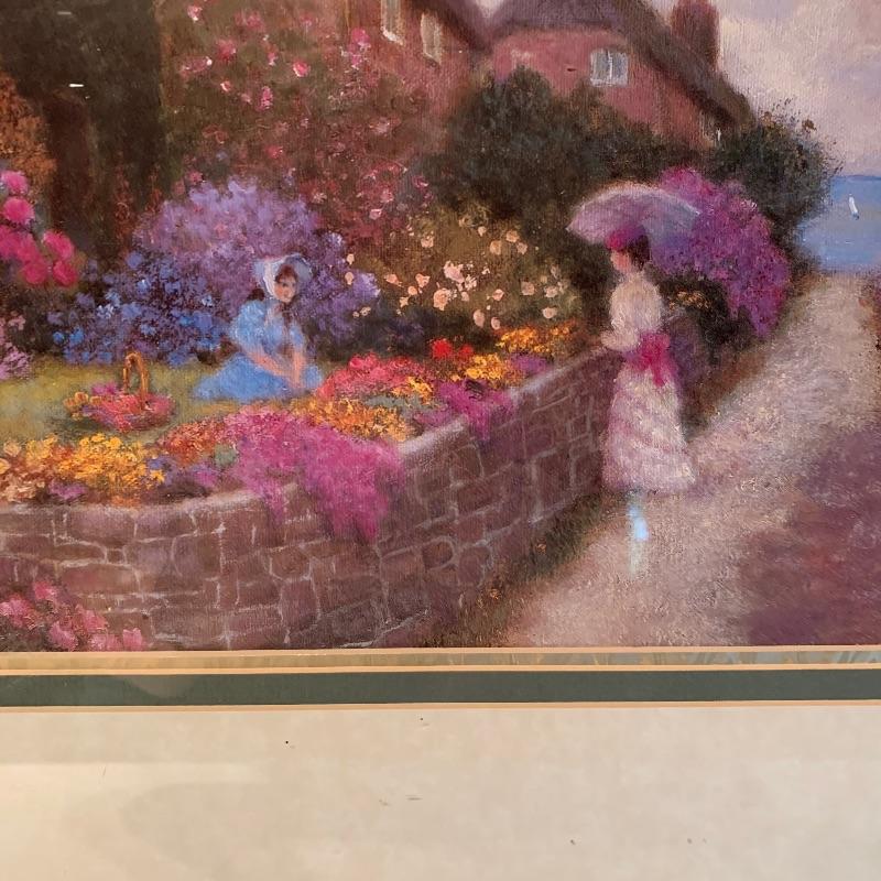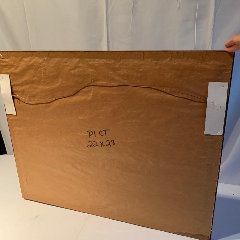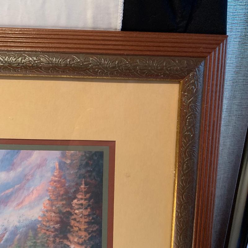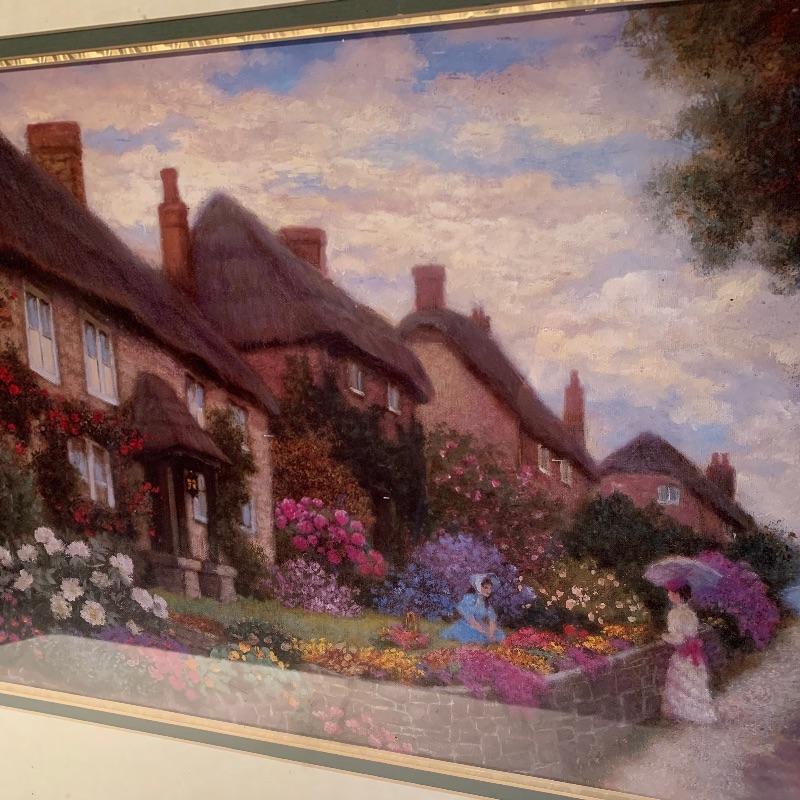 Three nicely framed pieces with a theme of cottage living. The largest one is a framed jigsaw puzzle. The frame measures 39” x29”. The second one is is a gold framed scene with two ladies talking at a stone wall. This piece is triple matted and there is some dirt on the frame that should clean up easily. It measures 30.5” x 24.5”. The last one is mountain scene with a river and sweet bridge. It is also triple matted and has an artist signature of Bazan. This piece measures 31.5”. Local pick up only.