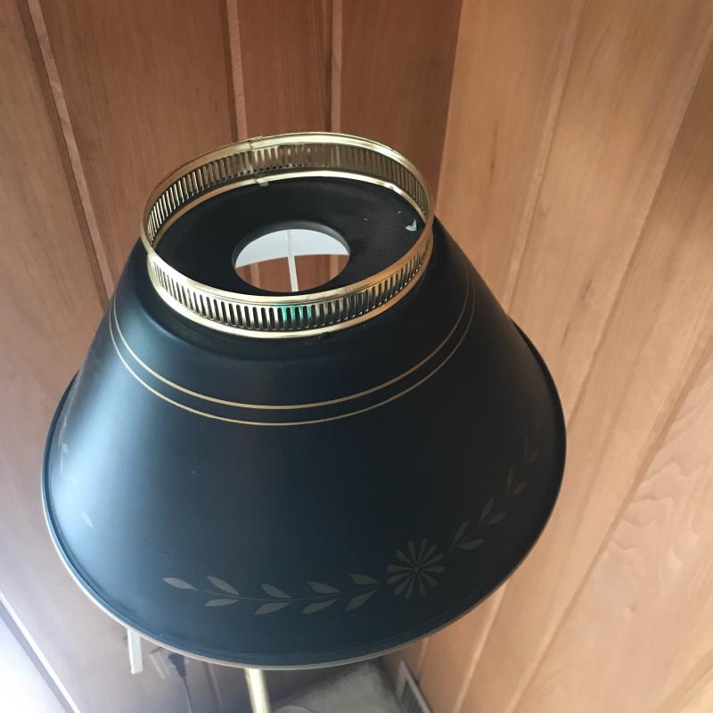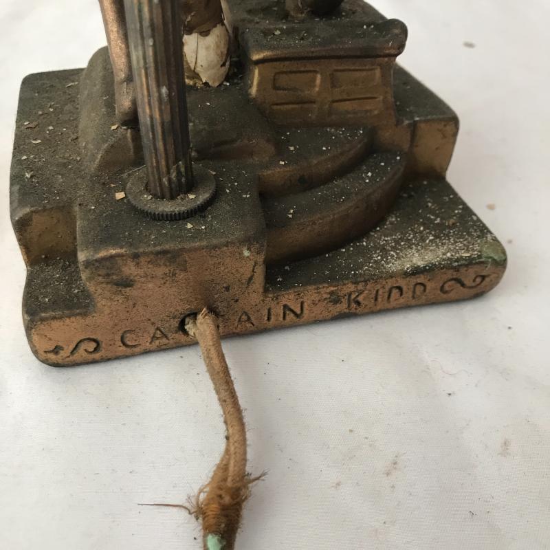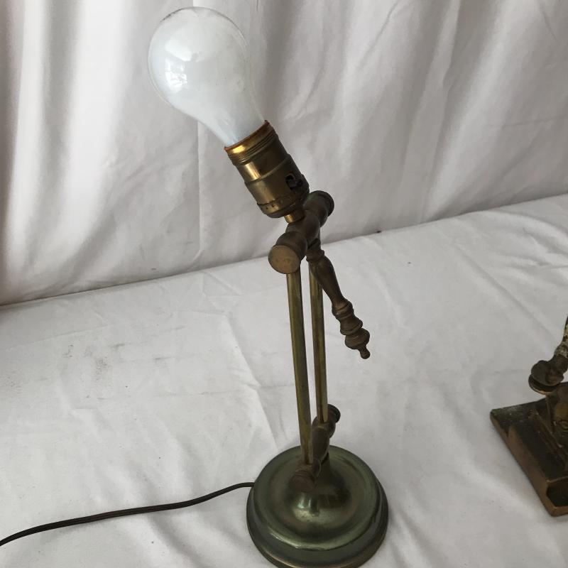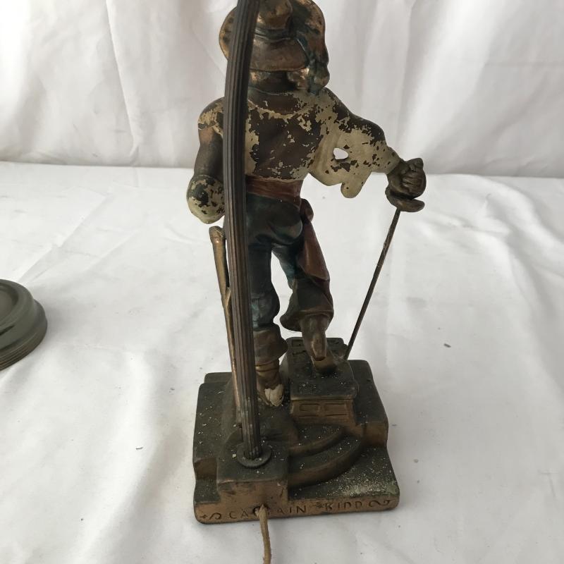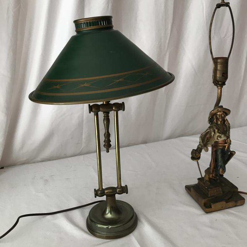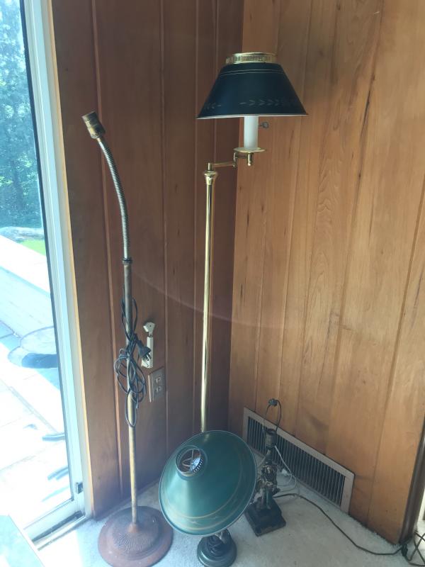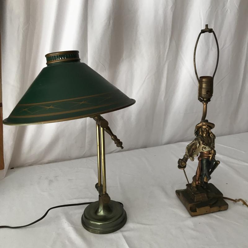 Two floor lamps and two table top lamps. Black metal lamp shade on brass floor lamp with swinging arm. Works fine. 12”d x 58”h Second floor lamp does not have shade but has a bendable top to move in different directions. Did not test as wire is exposed. Nice detail on base. One of the table top lamps is very unique - Captain Kidd. Measures 4.5”sq x 20”h. Very worn and not tested. Needs re-wiring. Second table top has moving arm and green metal shade. Does not turn on. No Shipping