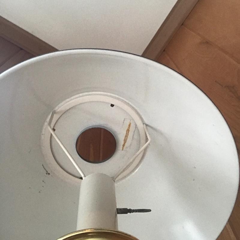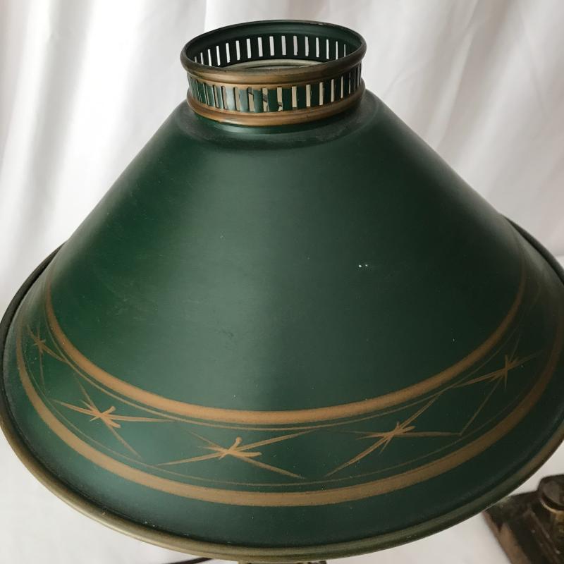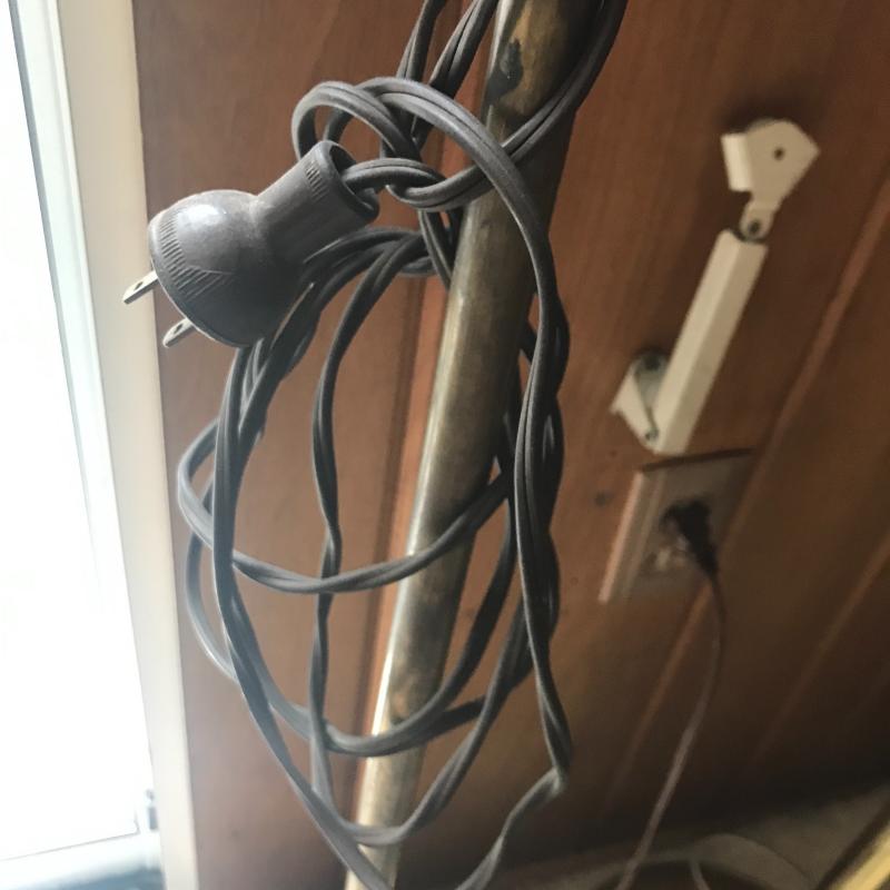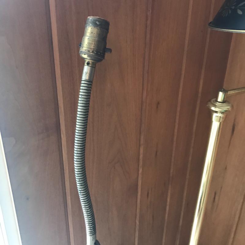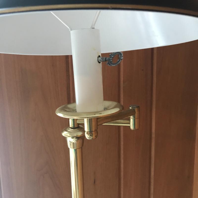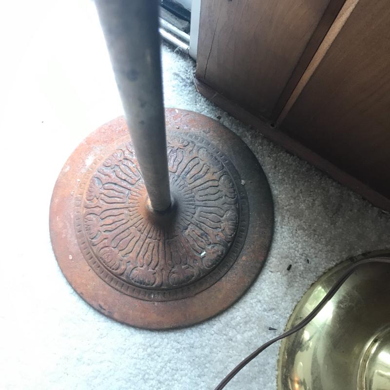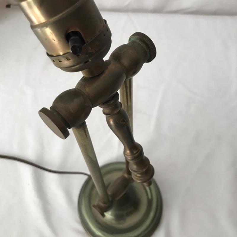 Two floor lamps and two table top lamps. Black metal lamp shade on brass floor lamp with swinging arm. Works fine. 12”d x 58”h Second floor lamp does not have shade but has a bendable top to move in different directions. Did not test as wire is exposed. Nice detail on base. One of the table top lamps is very unique - Captain Kidd. Measures 4.5”sq x 20”h. Very worn and not tested. Needs re-wiring. Second table top has moving arm and green metal shade. Does not turn on. No Shipping