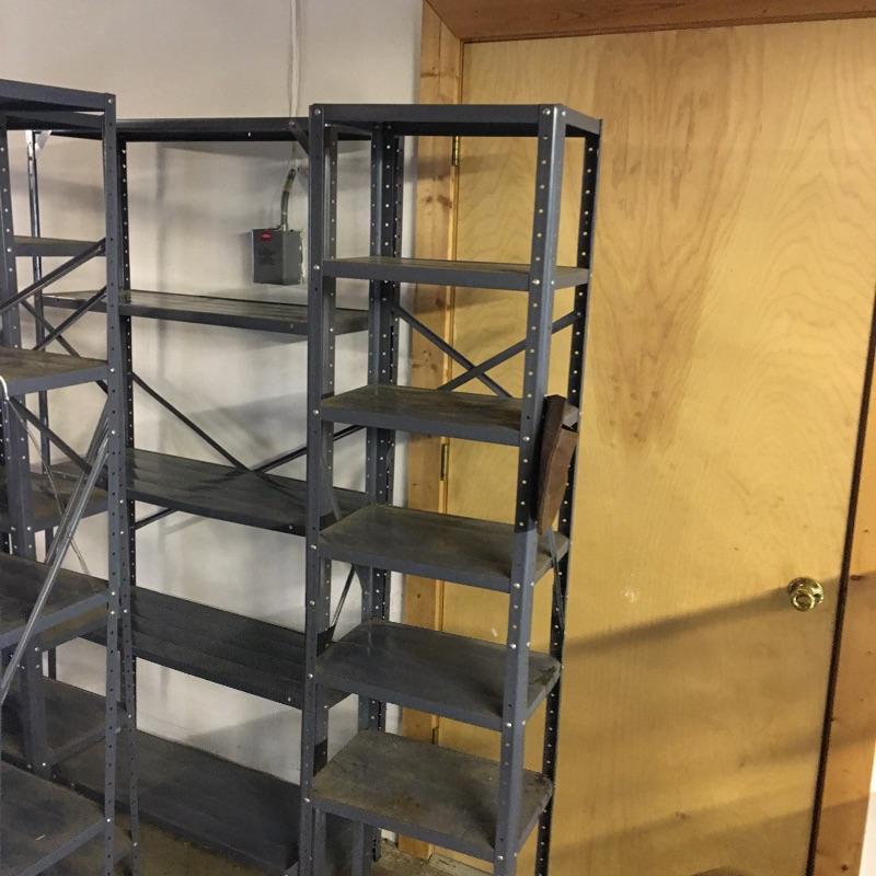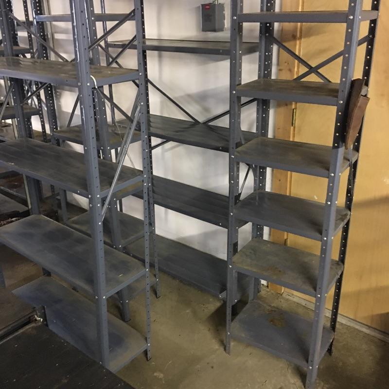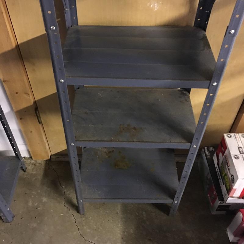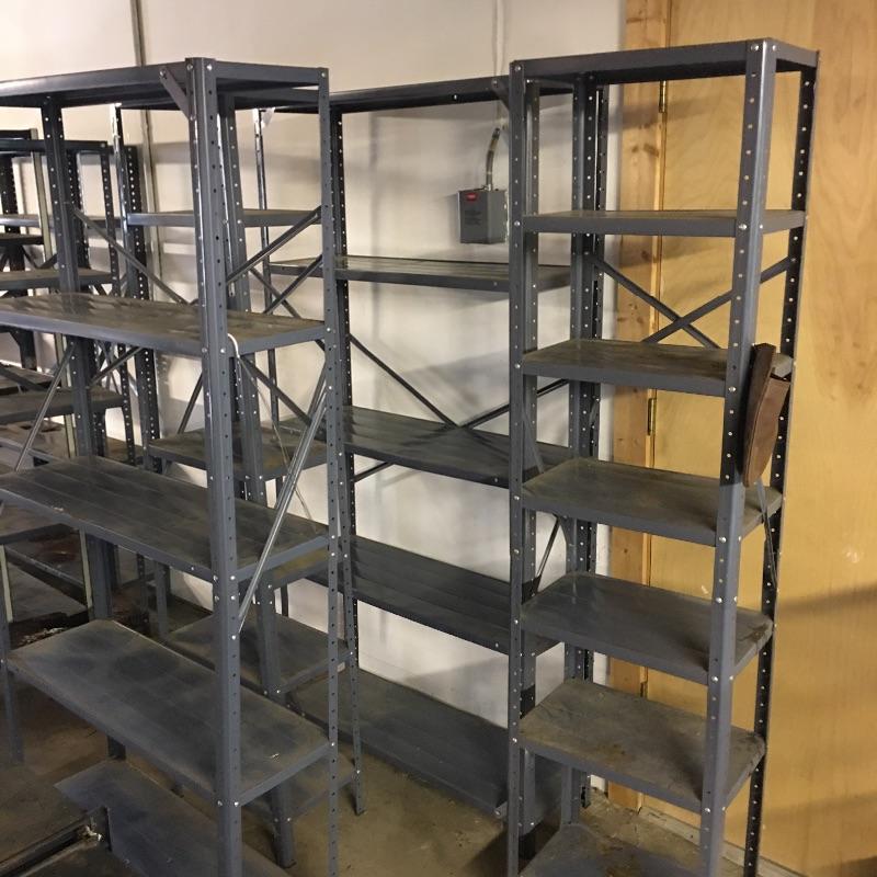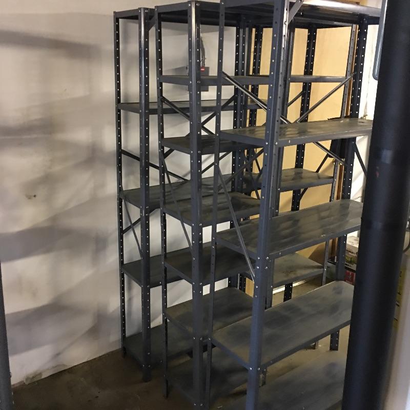 Have a place to store all your things with these four metal shelves. More of the same units can be found in Lot 235. This sturdy lot includes two shelving units that measure 12” x 36” x 73” with five adjustable shelves and two shelving unit that measure 12” x 18” x 73” that have seven adjustable shelves. It also comes with a small brown leather sac that can be used for holding tools.