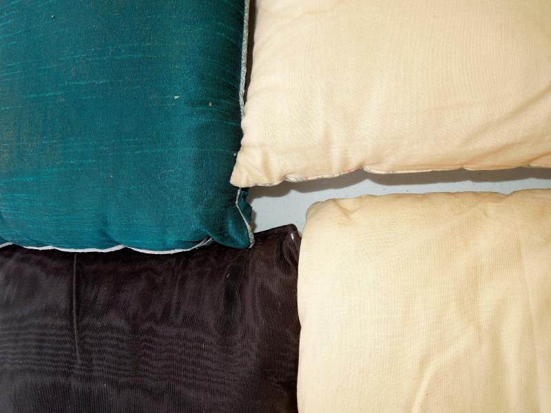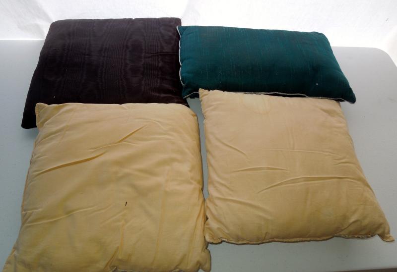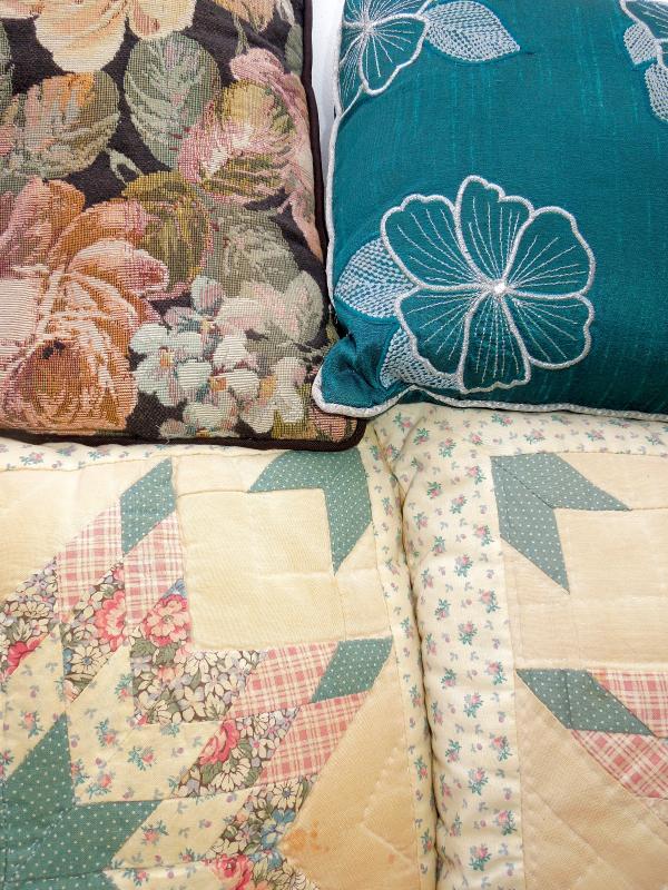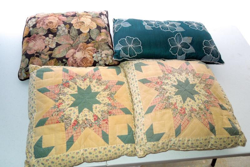 Two star pattern quilted throw pillows; a floral upholstery fabric pillow and a silk poly foral machine embroidered pillow. Backs are cotton. No zipper opening. Star quilt pillows need cleaning.