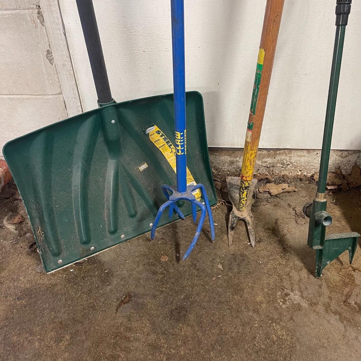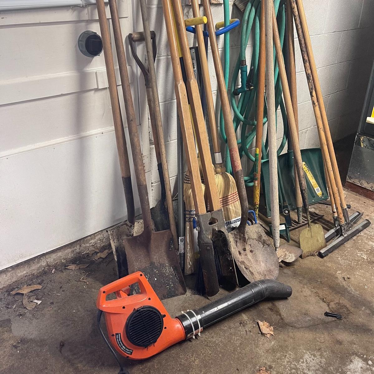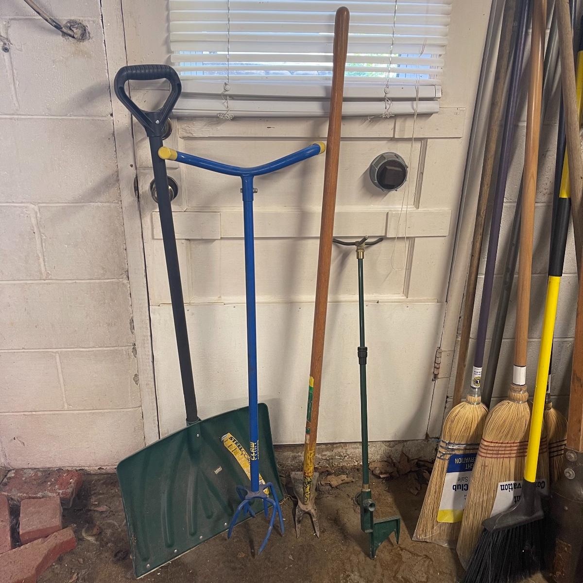 This lot includes a variety of garden tools, like hoe’s, hand tillers, and shovels. There are also a few squeegees, a snow shovel, a post hole digger, and a few brand new brooms. A garden hose with a nozzle is included as well. Additionally, there is a Sears Craftsman electric Leaf Blower, powered on when tested. Local pickup only.