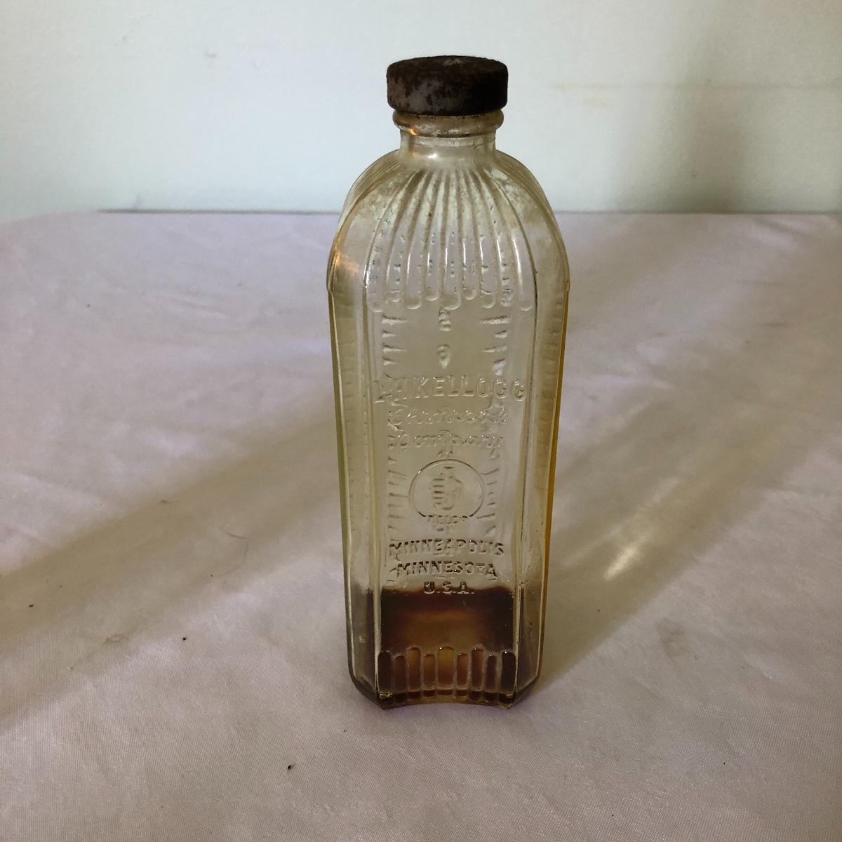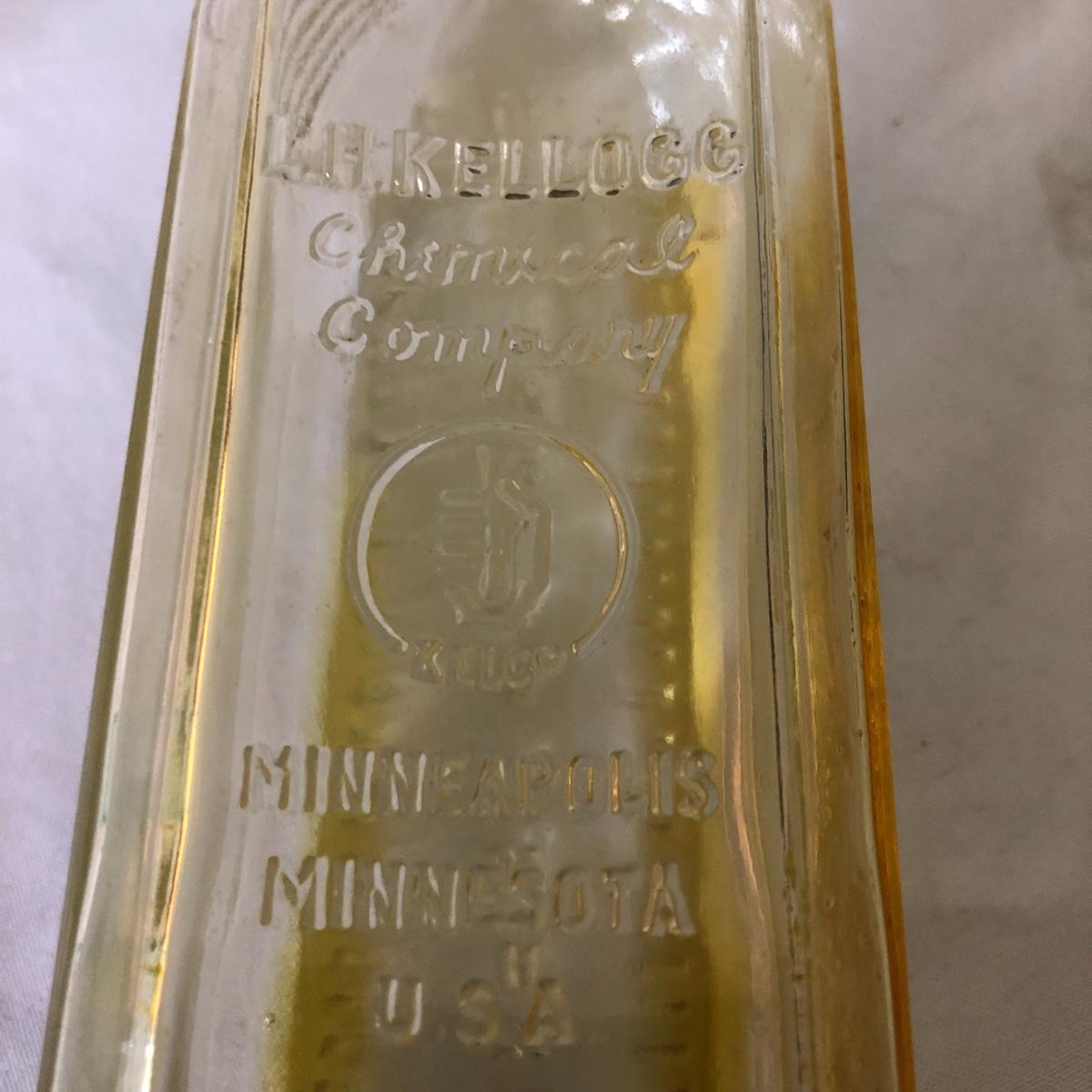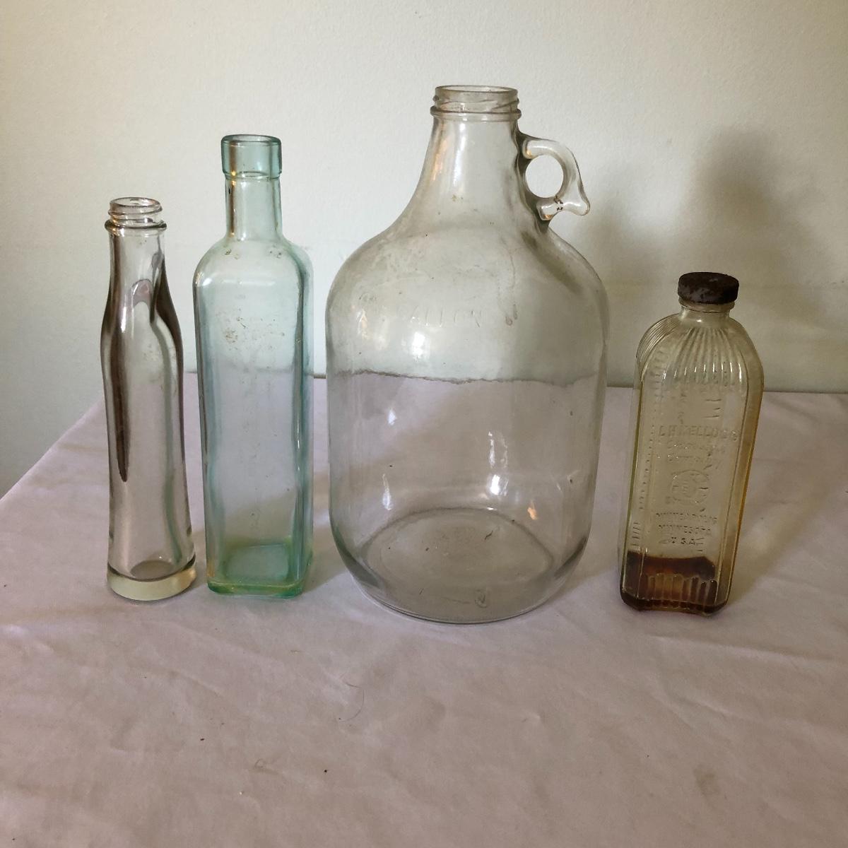 A unique selection of bottles that includes a LH Kellogg Chemical Company bottle, A gallon jug, 500ML Canadian bottle and a unmarked slim bottle. Gallon jug measures 6”D x 12” tall.