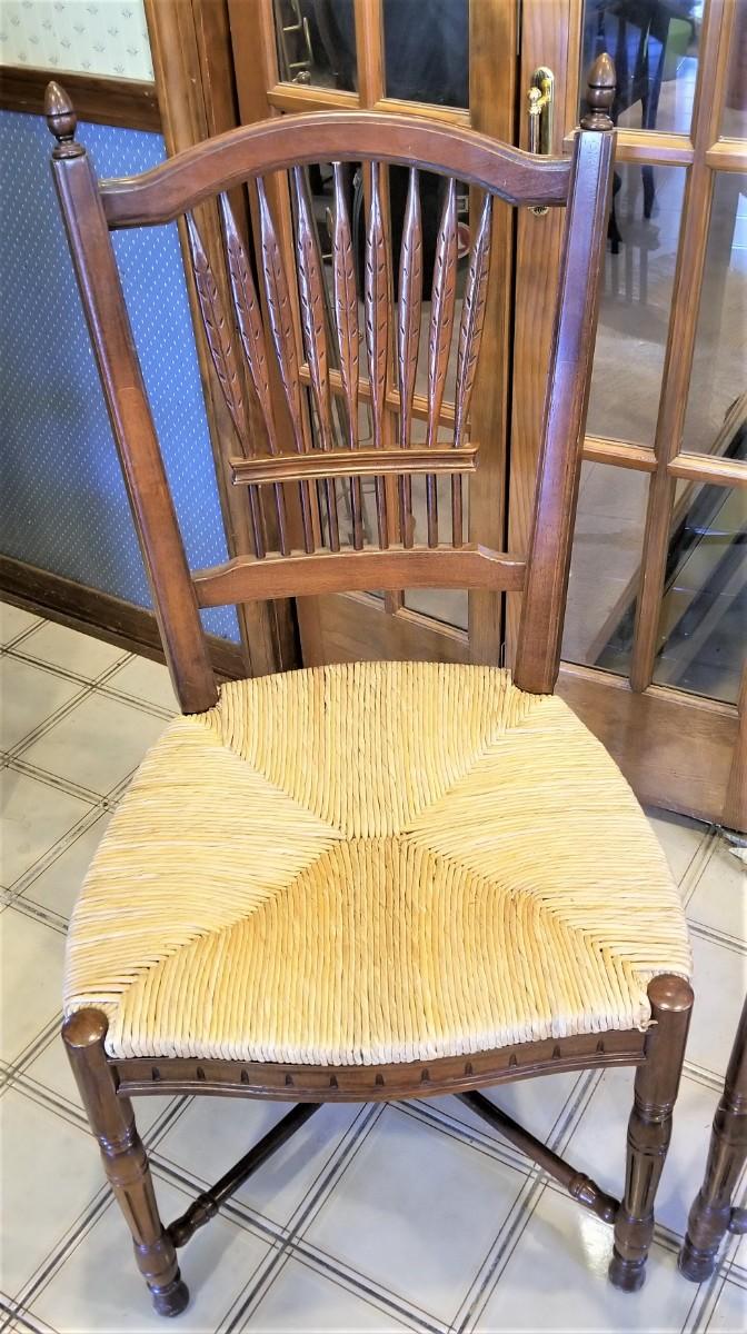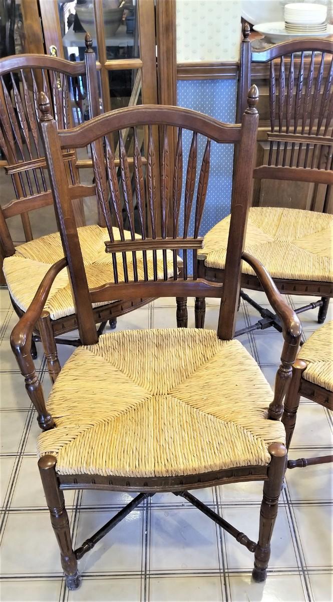 Group of 4 good looking contemporary Arrowback chairs with rush seats - One armchair, three side chairs. All in good condition. Each is 41.5" tall, 22.5" across, and 20" deep.