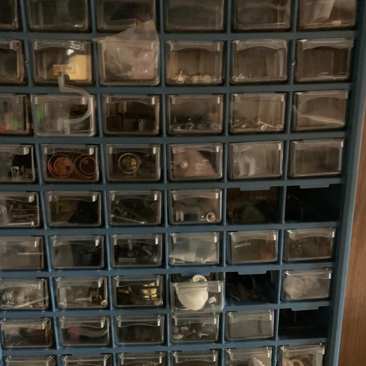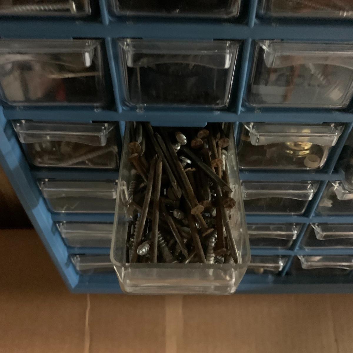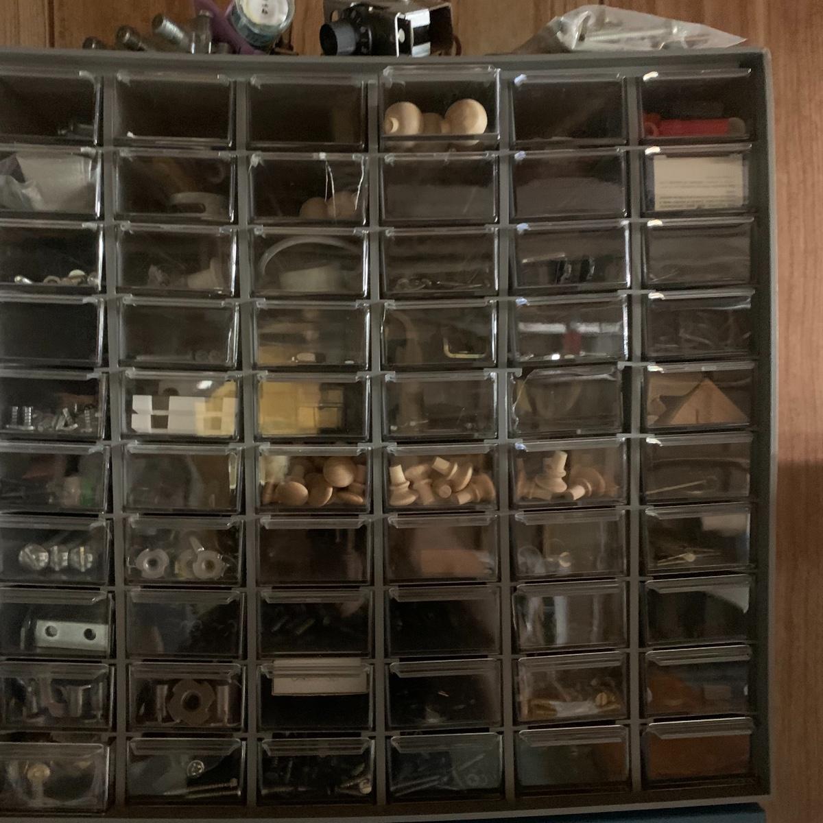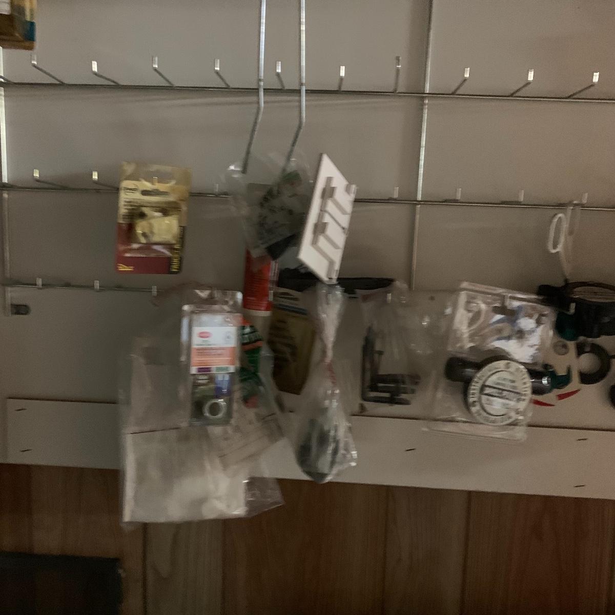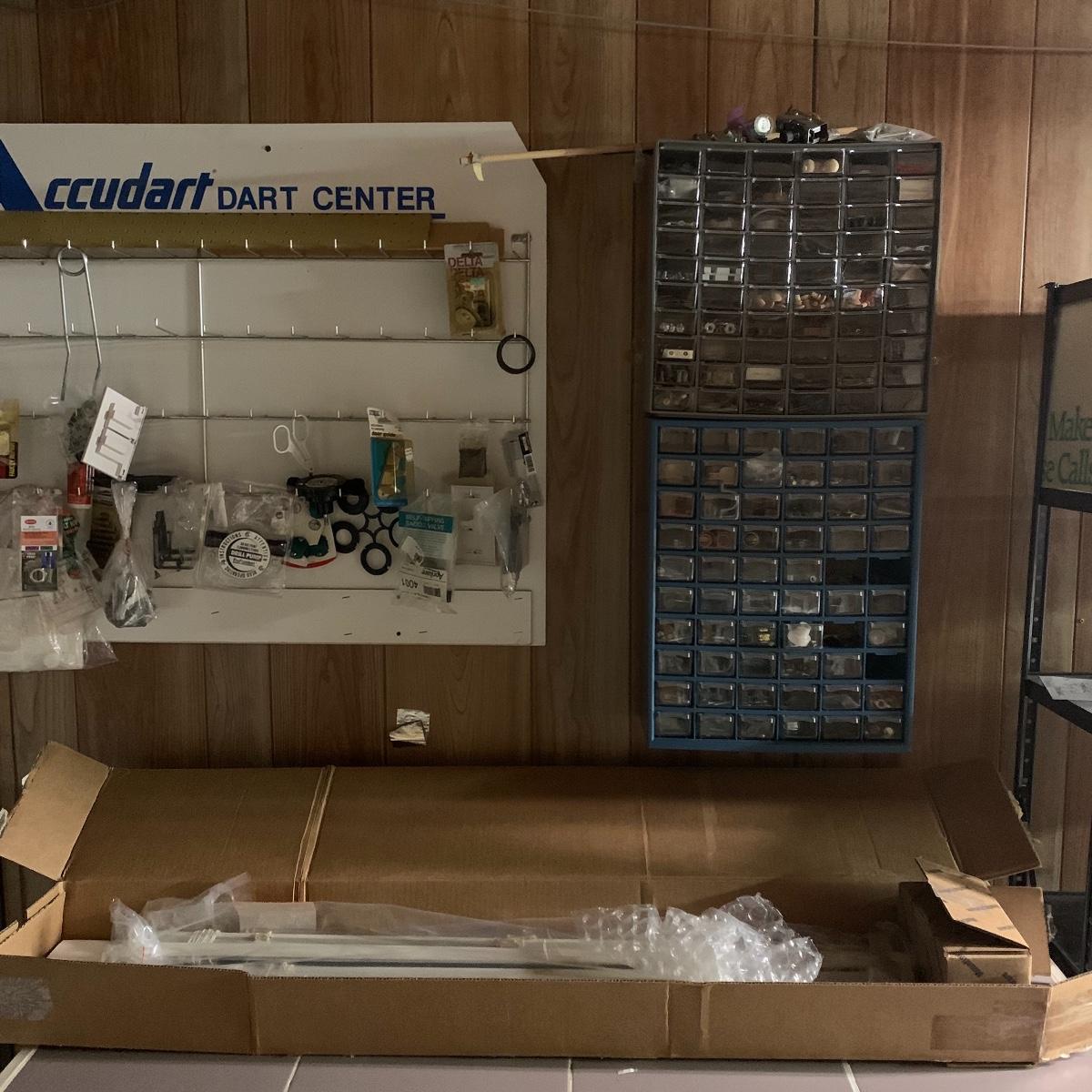 No more digging through drawers or emptying the tool box to find the right fastener! This lot features two large wall mounted organizers full of nuts, nails, screws and everything in between. The blue organizer measures 14.5” x 6.25” x 18” Also offered are three 39” retractable blinds that have never been opened. Last is everything hanging on the display rack, much of it new in boxes. Local pickup only.
